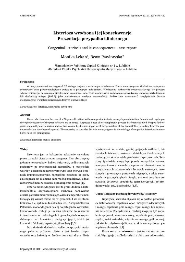 CASE REPORT Curr Probl Psychiatry 2011; 12(4): 479-482 Listerioza wrodzona i jej konsekwencje Prezentacja przypadku klinicznego Congenital listeriosis and its consequences – case report Monika Lekan1, Beata Pawłowska2 1Samodzielny 2Katedra Publiczny Szpital Kliniczny nr 1 w Lublinie i Klinika Psychiatrii Uniwersytetu Medycznego w Lublinie Streszczenie W pracy przedstawiono przypadek 22 letniego pacjenta z wrodzonym zakażeniem Listeria monocytogenes. Omówiono następstwa somatyczne oraz psychopatologiczne związane z przebytym zakażeniem. Wykluczono podejrzenie rozpoczynającego się procesu schizofrenicznego. Rozpoznano: Nieokreślone organiczne zaburzenia osobowości i zachowania spowodowane chorobą, uszkodzeniem lub dysfunkcją mózgu. (F07.9), jako konsekwencję przebytej neuroinfekcji. Podkreślono konieczność uwzględniania Listeria monocytogenes w etiologii zakażeń wrodzonych u noworodków. Słowa kluczowe: listerioza, zaburzenia psychiczne Abstract The article discusses the case of a 22-year-old patient with a congenital Listeria monocytogenes infection. Somatic and psychopathological outcomes of the past infection are analyzed. Suspected onset of a schizophrenic process has been excluded. Unspecified organic personality and behavioural disorders caused by disease, impairment or dysfunction of the brain (F07.9) resulting from the past neuroinfection have been diagnosed. The necessity to consider Listeria monocytogenes in the etiology of congenital infections in newborns has been emphasized. Keywords: listeriosis, mental disorders Wstęp Listerioza jest to bakteryjne zakażenie wywołane przez pałeczki Listeria monocytogenes. Choroba dotyczy głównie noworodków, kobiet ciężarnych, osób starszych, pacjentów po przeszczepach narządów, z marskością wątroby, z chorobami nowotworowymi oraz chorych leczonych immunosupresyjnie. Szczególnie narażone są osoby z niedojrzałą lub osłabioną odpornością komórkową, jednak zachorować może w zasadzie osoba zupełnie zdrowa [1]. Listeria monocytogenes jest to gram-dodatnia, katalazododatnia, oksydazoujemna, ruchoma, pozbawiona otoczki pałeczka niezarodnikująca. Zakres temperatur umożliwiający jej wzrost mieści się w granicach 4 do 37 stopni Celsjusza, a jej optimum to dokładnie 30-37 stopni Celsjusza. Pałeczki L. monocytogenes należą do patogenów wewnątrzkomórkowych, cechuje je unikana zdolność do zakażenia i przetrwania w makrofagach i granulocytach obojętnochłonnych oraz komórkach niefagocytujących, takich jak komórki śródbłonka, hepatocyty, fibroblasty [1,3]. Do zakażenia dochodzi zwykle po spożyciu skażonego pałeczką pokarmu. Listeria jest bardzo rozpowszechnioną bakterią w środowisku naturalnym. Może Copyright © 2011 Medical University of Lublin występować w wodzie, glebie, gnijących roślinach, kiszonkach, ściekach, zarówno u dzikich jak i hodowlanych zwierząt, a także w wielu produktach spożywczych. Skażoną żywnością mogą być przede wszystkim surowe warzywa i owoce. Nie należy zapominać również o niepasteryzowanych przetworach mlecznych, surowych, mrożonych i gotowanych potrawach mięsnych, a także surowych i wędzonych rybach. Ryzyko stanowi ponadto spożywanie gotowych produktów garmażeryjnych, półproduktów jak i tzw. fast food’ów [2,3]. Obraz kliniczny poszczególnych typów listeriozy Najczęściej choroba objawia się w postaci posocznicy listeriozowej, zapalenia opon mózgowo-rdzeniowych i mózgu, zapalenia pnia mózgu, ropni mózgu lub zapalenia wsierdzia. Zdecydowanie rzadziej mogą to być zapalenia spojówek, zakażenia skóry, zapalenia płuc, stawów, szpiku, kości, osierdzia, mięśnia sercowego, gałki ocznej, zakażenia żołądkowo-jelitowe, a także zmiany dotyczące węzłów chłonnych [1,3]. Posocznica listeriozowa - jest to najczęstsza postać. Występuje u osób dorosłych z obniżona odpornością 480 M. Lekan, B. Pawłowska typu komórkowego. Objawy kliniczne przypominają te spotykane w innych posocznicach, natomiast wyróżnia ją stosunkowo długi okres wylęgania, trwający od 2 do 4 tygodni. W tym okresie mogą rozwijać się objawy prodromalne w postaci biegunek, nudności, natomiast w późniejszym okresie pojawiają się ponadto stany podgorączkowe, gorączkowe, bóle mięśni itp. objawy ogólnoustrojowej reakcji na toczący się proces zapalny w organizmie [3]. Listerioza ciężarnych - jest to choroba gorączkowa lub przebiegająca bezobjawowo, do której najczęściej dochodzi w III trymestrze ciąży. Oprócz obniżenia odporności komórkowej, objawy przypominają zakażenie wirusowe, mogą to być bóle głowy, pleców ,stawów, mięśni, złe samopoczucie, gorączka i dreszcze. Szerząc się przez łożysko zakaża wody płodowe oraz worek owodniowy, doprowadzając do wewnątrzmacicznego zakażenia płodu oraz jego następstw. Możemy spodziewać się m.in. obumarcia płodu, poronienia lub przedwczesnego porodu. U około 60% żywych noworodków, których matki chorowały podczas ciąży rozwija się pełnoobjawowa postać listeriozy [3]. Listerioza okołoporodowa - wyróżnia się dwie postacie kliniczne, wczesną związaną z zakażeniem wewnątrzmacicznym lub późną związaną z czynnościami porodowymi. W postaci wczesnej objawy rozwijają się już w ciągu 48h od urodzenia. Są one podobne do innych ciężkich, perinatalnych infekcji bakteryjnych. Noworodek jest siny, często obserwuje się zmianę zabarwienia wód płodowych, również bezdech, zapalenie płuc czy niewydolność oddechową. W ciężkich postaciach mogą tworzyć się mikroropnie, ziarniniaki wątroby śledziony, płuc, nerek , mózgu i skóry. Na żywoczerwonej skórze widnieją liczne, szaro-żółtawe, grudkowate wykwity. Śmiertelność ocenia się na około 35-55%. W związku z dużą liczbą bakterii w płucach i jelitach uważa się, że do zakażenia dochodzi w wyniku aspiracji i połykania zakażonych wód płodowych. W 