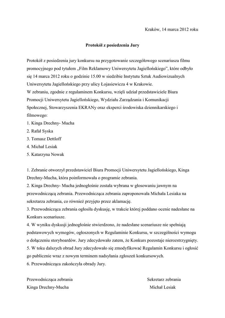 Kraków, 14 marca 2012 roku Protokół z posiedzenia Jury Protokół z posiedzenia jury konkursu na przygotowanie szczegółowego scenariusza filmu promocyjnego pod tytułem „Film Reklamowy Uniwersytetu Jagiellońskiego”, które odbyło się 14 marca 2012 roku o godzinie 15.00 w siedzibie Instytutu Sztuk Audiowizualnych Uniwersytetu Jagiellońskiego przy ulicy Łojasiewicza 4 w Krakowie. W zebraniu, zgodnie z regulaminem Konkursu, wzięli udział przedstawiciele Biura Promocji Uniwersytetu Jagiellońskiego, Wydziału Zarządzania i Komunikacji Społecznej, Stowarzyszenia EKRANy oraz eksperci środowiska dziennikarskiego i filmowego: 1. Kinga Drechny- Mucha 2. Rafał Syska 3. Tomasz Dettloff 4. Michał Lesiak 5. Katarzyna Nowak 1. Zebranie otworzył przedstawiciel Biura Promocji Uniwersytetu Jagiellońskiego, Kinga Drechny-Mucha, która poinformowała o programie zebrania. 2. Kinga Drechny- Mucha jednogłośnie została wybrana w głosowaniu jawnym na przewodniczącą zebrania. Przewodnicząca zebrania zaproponowała Michała Lesiaka na sekretarza zebrania, co również przyjęto przez aklamację. 3. Przewodnicząca zebrania ogłosiła dyskusję, w trakcie której poddano ocenie nadesłane na Konkurs scenariusze. 4. W wyniku dyskusji jednogłośnie stwierdzono, że nadesłane scenariusze nie spełniają podstawowych wymogów, ogłoszonych w Regulaminie Konkursu, w szczególności wymogu o dołączeniu storyboardów. Jury zdecydowało zatem, że Konkurs pozostaje nierozstrzygnięty. 5. W toku dalszych obrad Jury zdecydowało się zmodyfikować Regulamin Konkursu i ogłosić go publicznie wraz z nowym terminem nadsyłania zgłoszeń konkursowych. 6. Przewodnicząca zakończyła obrady Jury. Przewodnicząca zebrania Kinga Drechny-Mucha Sekretarz zebrania Michał Lesiak