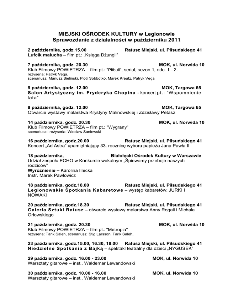 MIEJSKI OŚRODEK KULTURY w Legionowie Sprawozdanie z działalności w październiku 2011 2 października, godz.15.00 Lufcik malucha – film pt.: „Księga Dżungli” Ratusz Miejski, ul. Piłsudskiego 41 7 października, godz. 20.30 MOK, ul. Norwida 10 Klub Filmowy POWIETRZA – film pt.: "Pitbull", serial, sezon 1, odc. 1 - 2. reżyseria: Patryk Vega, scenariusz: Mariusz Bieliński, Piotr Sobbotko, Marek Kreutz, Patryk Vega 9 października, godz. 12.00 MOK, Targowa 65 Salon Artystyczny im. Fryderyka Chopina - koncert pt.: ”Wspomnienie lata” 9 października, godz. 12.00 MOK, Targowa 65 Otwarcie wystawy malarstwa Krystyny Malinowskiej i Zdzisławy Petasz 14 października, godz. 20.30 Klub Filmowy POWIETRZA – film pt.: "Wygrany" MOK, ul. Norwida 10 scenariusz i reżyseria: Wiesław Saniewski 16 października, godz.20.00 Ratusz Miejski, ul. Piłsudskiego 41 Koncert „Ad Astra” upamiętniający 33. rocznicę wyboru papieża Jana Pawła II 18 października, Białołęcki Ośrodek Kultury w Warszawie Udział zespołu ECHO w Konkursie wokalnym „Śpiewamy przeboje naszych rodziców” Wyróżnienie – Karolina Ilnicka Instr. Marek Pawłowicz 18 października, godz.18.00 Ratusz Miejski, ul. Piłsudskiego 41 Legionow skie Spotkania Kabaretow e – występ kabaretów: JURKI I NOWAKI 20 października, godz.18.30 Ratusz Miejski, ul. Piłsudskiego 41 Galeria Sztuki Ratusz – otwarcie wystawy malarstwa Anny Rogali i Michała Orłowskiego 21 października, godz. 20.30 Klub Filmowy POWIETRZA – film pt.: "Metropia" MOK, ul. Norwida 10 reżyseria: Tarik Saleh, scenariusz: Stig Larsson, Tarik Saleh, 23 października, godz.15.00, 16.30, 18.00 Ratusz Miejski, ul. Piłsudskiego 41 Niedzielne Spotkania z Bajką – spektakl teatralny dla dzieci „NYGUSEK” 29 października, godz. 16.00 - 23.00 Warsztaty gitarowe – inst.. Waldemar Lewandowski MOK, ul. Norwida 10 30 października, godz. 10.00 - 16.00 Warsztaty gitarowe – inst.. Waldemar Lewandowski MOK, ul. Norwida 10 30 października, godz.15.00 Ratusz Miejski, ul. Piłsudskiego 41 Lufcik malucha – film pt.: „Świat Małej Księżniczki” 30 października, godz.18.00 Lufcik – film pt.: „Czekolada” Ratusz Miejski, ul. Piłsudskiego 41 Wykorzystanie sali widowiskowej w Ratuszu Miejskim z obsługą elektroakustyczną MOK 04.10 04.10 06.10 07.10 08.10 10.10 11.10 12.10 13.10 14.10 20.10 21.10 22.10 23.10 23.10 26.10 27.10 28.10 29.10 wtorek wtorek czwartek piątek sobota poniedziałek wtorek środa czwartek piątek czwartek piątek sobota niedziela niedziela środa czwartek piątek sobota 6.00 – 15.00 15.00 – 20.00 18.00 – 22.00 10.00 – 15.00 13.00 – 17.00 8.30 – 11.00 6.00 – 14.00 6.00 – 14.30 14.00 – 22.00 16.00 – 17.00 6.00 – 15.00 6.00 – 15.00 10.00 – 14.00 12.00 – 19.30 18.30 – 20.30 8.00 – 12.00 8.00 – 13.00 17.00 – 22.00 9.00 – 19.00 Marcin Konik, pokaz multimedialny – projekcja Wydział Edukacji i Sportu – podsumowanie, UM Legionowski Klub Obywatelski – projekcja Starostwo + UM, narada dyrektorów szkół - J. Kubicki Rafał Perl, UKS DELFIN, UM, Wydział Zdrowia Narodowy Teatr Edukacji we Wrocławiu, Narodowy Teatr Edukacji we Wrocławiu, DZIEŃ EDUKACJI NARODOWEJ CENTRUM ARTYSTYCZNE Marcin Konik, pokaz multimedialny – projekcja Marcin Konik, pokaz multimedialny – projekcja CENTRUM ARTYSTYCZNE MOK, Bajka „Nygusek” Retrosekcja - Aleksandra Rybińska Agencja „Teatr moich marzeń” Chorzów Agencja JOANNA – spektakl (41) 361 80 46 Akcja „Szlachetna paczka”, szkolenie wolontariuszy Akcja „Szlachetna paczka”, szkolenie wolontariuszy W ramach swojej działalności Miejski Ośrodek Kultury prowadzi stałe zajęcia artystyczne dla dzieci, młodzieży i dorosłych: MOK przy ul. Norwida 10: Poniedziałek 14.30 – 18.00 - grupa teatralna dla dzieci z klas IV - VI „GONG” - instr. Hanna Wilczyńska 18.00 – 21.30 - grupa teatralna dla młodzieży licealnej i studentów„REMONT” - instr. Hanna Wilczyńska 13.00 – 20.00 – indywidualna nauka gry na gitarze klasycznej i elektrycznej – instr. Waldemar Lewandowski 15.00 – 16.15 – zajęcia plastyczne dla dzieci kl. 0 – III – instr. Jacek Malinowski 17.00 – 18.30 – zajęcia plastyczne dla dzieci z klas IV – VI – instr. Jacek Malinowski 14.15 – 16.30 – indywidualna nauka gry na instrumentach – instr. M. Pawłowicz 17.00 – 20.00 – Zespół wokalny ECHO – młodzież gimnazjalna, licealna i studenci – instr. Marek Pawłowicz 16.00 – 20.00 – zajęcia w Studiu Tańca i Piosenki SZACHRAJ instr.: Barbara Jankowska, Michał Jankowski i Krzysztof Bernard (sala „Scena 210” ul. Husarska 12) Wtorek 18.00 – 21.30 – Teatr Ewangelizacyjny ADONAI – instr. Hanna Wilczyńska 8.30 – 10.30 – indywidualna nauka gry na instrumentach – instr. M. Pawłowicz 13.00 – 17.30 - indywidualna nauka gry na instrumentach – instr. M. Pawłowicz Środa 11.00 – 12.00 - aerobic – ZERIN 16.30 – 17.30 - aerobic – ZERIN 14.00 - 20.00 – indywidualna nauka gry na instrumentach – instr. M. Pawłowicz 16.30 – 20.30 – zajęcia w Studiu Tańca i Piosenki SZACHRAJ instr.: Barbara Jankowska, Michał Jankowski i Krzysztof Bernard (sala w Ratuszu Miejskim) Czwartek 16.00 – 17.30 – zajęcia plastyczne dla dzieci kl. 0 – II - instr. Zofia Piotrowska 18.00 – 19.30 – zajęcia plastyczne dla dzieci kl. III – IV - instr. Zofia Piotrowska 14.00 – 17.30 – nowa grupa teatralna dla dzieci kl. III – IV - instr. Hanna Wilczyńska 17.30 – 21.00 - grupa teatralna dla młodzieży z klas gimnazjalnych „KLAMKA” - instr. Hanna Wilczyńska 14.00 – 17.00 – indywidualna nauka gry na instrumentach – instr. M. Pawłowicz 17.00 – 19.00 - Zespół wokalny ECHO – dzieci ze szkół podst. – instr. M. Pawłowicz 16.30 – 20.30 – zajęcia w Studiu Tańca i Piosenki SZACHRAJ instr.: Barbara Jankowska, Michał Jankowski i Krzysztof Bernard (sala WOK ul. Zegrzyńska) 16.00 – 20.00 – zaj
