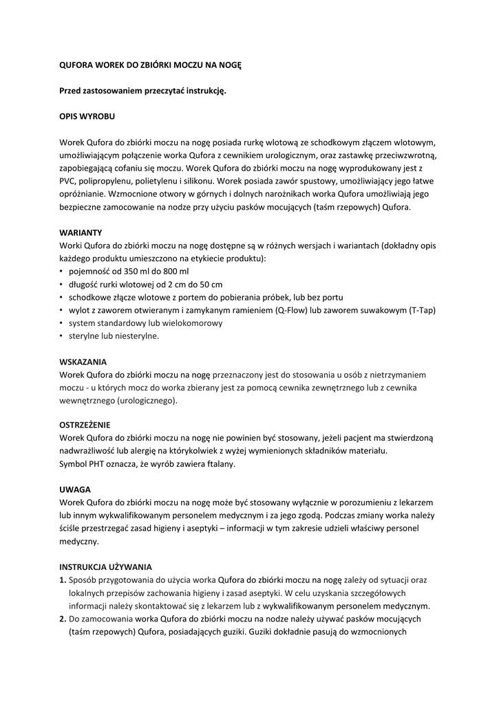 QUFORA WOREK DO ZBIÓRKI MOCZU NA NOGĘ Przed zastosowaniem przeczytać instrukcję. OPIS WYROBU Worek Qufora do zbiórki moczu na nogę posiada rurkę wlotową ze schodkowym złączem wlotowym, umożliwiającym połączenie worka Qufora z cewnikiem urologicznym, oraz zastawkę przeciwzwrotną, zapobiegającą cofaniu się moczu. Worek Qufora do zbiórki moczu na nogę wyprodukowany jest z PVC, polipropylenu, polietylenu i silikonu. Worek posiada zawór spustowy, umożliwiający jego łatwe opróżnianie. Wzmocnione otwory w górnych i dolnych narożnikach worka Qufora umożliwiają jego bezpieczne zamocowanie na nodze przy użyciu pasków mocujących (taśm rzepowych) Qufora. WARIANTY Worki Qufora do zbiórki moczu na nogę dostępne są w różnych wersjach i wariantach (dokładny opis każdego produktu umieszczono na etykiecie produktu): • pojemnośd od 350 ml do 800 ml • długośd rurki wlotowej od 2 cm do 50 cm • schodkowe złącze wlotowe z portem do pobierania próbek, lub bez portu • wylot z zaworem otwieranym i zamykanym ramieniem (Q-Flow) lub zaworem suwakowym (T-Tap) • system standardowy lub wielokomorowy • sterylne lub niesterylne. WSKAZANIA Worek Qufora do zbiórki moczu na nogę przeznaczony jest do stosowania u osób z nietrzymaniem moczu - u których mocz do worka zbierany jest za pomocą cewnika zewnętrznego lub z cewnika wewnętrznego (urologicznego). OSTRZEŻENIE Worek Qufora do zbiórki moczu na nogę nie powinien byd stosowany, jeżeli pacjent ma stwierdzoną nadwrażliwośd lub alergię na którykolwiek z wyżej wymienionych składników materiału. Symbol PHT oznacza, że wyrób zawiera ftalany. UWAGA Worek Qufora do zbiórki moczu na nogę może byd stosowany wyłącznie w porozumieniu z lekarzem lub innym wykwalifikowanym personelem medycznym i za jego zgodą. Podczas zmiany worka należy ściśle przestrzegad zasad higieny i aseptyki – informacji w tym zakresie udzieli właściwy personel medyczny. INSTRUKCJA UŻYWANIA 1. Sposób przygotowania do użycia worka Qufora do zbiórki moczu na nogę zależy od sytuacji oraz lokalnych przepisów zachowania higieny i zasad aseptyki. W celu uzyskania szczegółowych informacji należy skontaktowad się z lekarzem lub z wykwalifikowanym personelem medycznym. 2. Do zamocowania worka Qufora do zbiórki moczu na nodze należy używad pasków mocujących (taśm rzepowych) Qufora, posiadających guziki. Guziki dokładnie pasują do wzmocnionych otworów znajdujących się w górnej i dolnej części worka. Przed zamocowaniem worka na nodze należy przyciąd pasek mocujący (taśmę rzepową) na właściwą długośd. 3. Zdjąd nakładkę ochronną ze schodkowego złącza wlotowego i włożyd jego stożkową koocówkę do wylotu cewnika urologicznego. Unikad dotykania koocówki cewnika lub powierzchni schodkowego złącza wchodzącego w cewnik. 4. Należy upewnid się, że rurka jest usytuowana w taki sposób, że się nie załamuje. 5. Obsługa zaworu spustowego (w stanie fabrycznym wszystkie zawory są zamknięte): a. Zawór z ramieniem (Q-Flow): kiedy ramię skierowane jest do góry, worek jest zamknięty. W celu opróżnienia worka przekręcid ramię zaworu w dół. b. Zawór suwakowy (T-Tap): Kieszeo, w której znajduje się wylot jest przezroczysta i dzięki czemu można łatwo zobaczyd, czy zawór jest otwarty, czy zamknięty. W celu opróżnienia worka należy przesunąd suwak w przeciwnym kierunku. Po opróżnieniu starannie zamknąd worek. 6. Podczas nocnej zbiórki moczu (nocnego drenażu) rurka silikonowa znajdująca się na wylocie worka na nogę, może byd połączona ze złączem wlotowym przyłóżkowego worka Qufora do zbiórki moczu - bez konieczności zdejmowania worka na nogę. Zmniejsza to ryzyko powstania zakażenia. Należy pamiętad o otwarciu zaworu spustowego worka na nogę. 7. Nie należy przepełniad worka. Ważne jest, aby opróżnid worek zanim mocz będzie miał kontakt z zastawką przeciwzwrotną. WOREK QUFORA DO ZBIÓRKI MOCZU NA NOGĘ Z PORTEM DO POBIERANIA PRÓBEK Port do pobierania próbek moczu, umiejscowiony w złączu wlotowym, umożliwia bezigłowe pobieranie próbek moczu przy pomocy standardowej strzykawki. Przed pobraniem próbki należy zdezynfekowad miejsce, z którego mocz jest pobierany, a ponadto upewnid się, że lokalnie obowiązujące procedury aseptyki zostały zastosowane. STERYLIZACJA (W PRZYPADKU WORKÓW STERYLNYCH) Wyroby sterylne są sterylizowane gazem ETO. Przed ich użyciem należy sprawdzid, czy opakowanie nie jest otwarte i/lub uszkodzone i czy data ważności nie upłynęła – w takim przypadku wyrób nie powinien zostad użyty. Worek Qufora do zbiórki moczu na nogę nie powinien byd ponownie sterylizowany. OSTRZEŻENIE Jeżeli wyrób lub jego częśd jest ponownie używana lub sterylizowana, istnieje wysokie ryzyko zaistnienia działao niepożądanych, które mogą negatywnie wpływad na funkcjonowanie wyrobu i na zdrowie pacjenta, jego opiekunów i osób trzecich. ODPOWIEDZIALNOŚĆ Podmiot odpowiedzialny MBH-International A/S nie ponosi odpowiedzialności za uszkodzenia ciała i inne straty mogące powstad w wyniku używania worka sprzecznie z zaleceniami MBH-International A/S. ŚRODKI OSTROŻNOŚCI Chronid worek Qufora do zbiórki moczu na nogę przez możliwymi uszkodzeniami. Nie naciskad na wypełniony worek. ZALECANY SPOSÓB PRZECHOWYWANIA Przechowywad worek Qufora do zbiórki moczu na nogę w temperaturze od 0 °C do +35 °C. Unikad bezpośredniego działania promieni słonecznych na wyrób. WYTWÓRCA MBH-International A/S 3450 Allerød Dania www.mbh-international.com