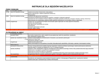 INSTRUKCJE DLA SĘDZIÓW NACZELNYCH PRZED TURNIEJEM kiedy 14 DNI co robi sędzia naczelny dzwoni do dyrektora turnieju ustalenia komunikatu (liczba kortow, daty godziny) w celu sprawy organizacyjne, ustalenia (sędziowie strefowi itp.) oferuje pomoc 6 DNI dzwoni do dyrektora turnieju uzyskania listy zgłoszonych zawodników w celu sprawdzenia przygotowanej listy zgłoszeń (zgodnie z zasadami o kolejności zgłoszeń) upewnienia sie czy na obiekcie w biurze znajduja sie wszystkie potrzebne sprzety (fax, komputer, drukarka, rankingi, internet itp.) upewnienia sie czy wczesniejsze ustalenia zostaly spelnione (sedziowie itp. czy sa jakies zmiany w organizacji) 1 DZIEŃ przygotowuje program PZT do prowadzenia turniejów i/lub komputer (jeżeli organizator nie może zapewnić komputera) aktualne listy klasyfikacyjne listę zgłoszonych zawodników do turnieju wydrukowane powołanie sędziowskie/ rachunek numerki, stoper, miarka UWAGA! Sędzia naczelny powinien przyjechać na obiekt odpowiednio wcześniej, jednak nie później niż na godzinę (1 godz.) przed planowanym rozpoczęciem weryfikacji!!! PO PRZJEŹDZIE NA OBIEKT co robi sędzia naczelny sprawdza obiekt stan kortów (nawierzchnia, siatki, podpórki do gry pojedynczej, ławki dla zawodników, oświetlenie) stan infrastruktury (szatnie, biuro) spotyka się z dyrektorem turnieju ustalenia zasad współpracy (uczestniczenie w losowaniu, przy tworzeniu planów gier) w celu uzgodnienia dzikie karty sprawdzenia odwołań z turnieju przygotowuje ostateczną listę zgłoszonych tablicę informacyjną (na niej wywiesza: komunikat, listę zgłoszonych zawodników, informacje o zapisach, harmonogram turnieju) WERYFIKACJA sprawdzenie dokumentów licencja, licencja jednorazowa (opłatę przyjmuje organizator), badania (od lekarza sportowego), badania jednorazowe (zabieramy) ważność badań: 6 miesięcy do kategorie do 21 lat, 12 miesięcy pozostali sposoby weryfikacji osobiście, osoby niepełnoletnie mogą być zweryfikowane przez opiekuna prawnego, trenera, który posiada dokumenty tego zawodnika telefonicznie w szczególnie uzasadnionych wypadkach losowych dzikie karty nie musza być obecne na weryfikacji dzikie karty muszą być w kontakcie telefonicznym i przedstawić dokumenty przed rozpoczęciem swojego pierwszego meczu lista zawodników przygotowanie listy do losowania, posortowanie zgodnie z rankingami, ostateczny termin potwierdzenia dzikich kart UWAGA! Obowiązujące numery licencji można uzyskać na stronie PZT LOSOWANIE bezzwłoczne, jak najszybsze przeprowadzenie losowania zgodnie z obowiązującymi Regulaminami, wywieszenie drabinek ustalenie planu gier i wywieszenie go na tablicy informacyjnej Strona 1 INSTRUKCJE DLA SĘDZIÓW NACZELNYCH PO LOSOWANIU I KAŻDEGO DNIA PO ZAKOŃCZENIU GIER co robi sędzia naczelny wysyła pocztą elektroniczną wywiesza aktualne drabinki (wyniki), plany gier OTK Jarosław Krajowski turnieje PZT Mistrzostwa Polski indywidualne i drużynowe, turnieje Masters turnieje PZT biuro PZT Agnieszka Dziedzic Wojciech Andrzejewski Jarosław Krajowski Jacek Muzolf Karol Stopa Radosław Szymanik Henryk Kornas Michał Kolarczyk Tomasz Wiktorowski aktualne drabinki (wyniki), plany gier aktualne listy kar NATYCHMIAST PO ZAKOŃCZENIU TURNIEJU co robi sędzia naczelny wysyła pocztą elektroniczną drabinki (wyniki) do biura PZT NIE POŹNIEJ NIŻ 3 DNI PO ZAKOŃCZENIU TURNIEJU co robi sędzia naczelny przekazuje dyrektorowi turnieju wysyła do PZT wysyła do KS kompletne sprawozdanie turniejowe email kompletne sprawozdanie turniejowe fax zaświadczenia lekarskie, będące podstawą wycofania się zawodnika z turnieju lub z meczu odwołania z turnieju po terminie wraz ze zgłoszeniami tych zawodników zgłoszenia zawodników, którzy się nie odwołali z turnieju licencje jednorazowe email kompletne sprawozdanie turniejowe - do Kolegium Sędziów DANE KONTAKTOWE Polski Związek Tenisowy biuro czynne 8.00-16.00 (pon-pt) turnieje PZT Agnieszka Dziedzic Wojciech Andrzejewski Jarosław Krajowski Jacek Muzolf Karol Stopa Radosław Szymanik Henryk Kornas Tomasz Wiktorowski Kolegium Sędziów PZT Michał Kolarczyk adres telefon fax email rachunek główny PZT email email email email email email email email email email email ul. Frascati 4, 00-483 Warszawa tel. (22) 629 26 21, 622 87 60 fax: (22) 621 80 01 [email protected] Millennium 61 1160 2202 0000 0001 0816 7995 [email protected] [email protected] [email protected] [email protected] [email protected] [email protected] [email protected] [email protected] [email protected] [email protected] [email protected] Strona 2