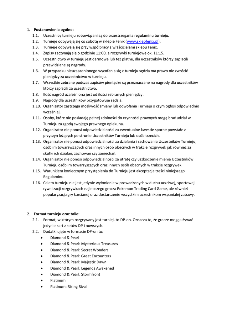 1. Postanowienia ogólne: 1.1. Uczestnicy turnieju zobowiązani są do przestrzegania regulaminu turnieju. 1.2. Turnieje odbywają się co sobotę w sklepie Fenix (www.sklepfenix.pl). 1.3. Turnieje odbywają się przy współpracy z właścicielami sklepu Fenix. 1.4. Zapisy zaczynają się o godzinie 11:00, a rozgrywki turniejowe ok. 11:15. 1.5. Uczestnictwo w turnieju jest darmowe lub też płatne, dla uczestników którzy zapłacili przewidziane są nagrody. 1.6. W przypadku nieuzasadnionego wycofania się z turnieju sędzia ma prawo nie zwrócid pieniędzy za uczestnictwo w turnieju. 1.7. Wszystkie zebrane podczas zapisów pieniądze są przeznaczane na nagrody dla uczestników którzy zapłacili za uczestnictwo. 1.8. Ilośd nagród uzależniona jest od ilości zebranych pieniędzy. 1.9. Nagrody dla uczestników przygotowuje sędzia. 1.10. Organizator zastrzega możliwośd zmiany lub odwołania Turnieju o czym ogłosi odpowiednio wcześniej. 1.11. Osoby, które nie posiadają pełnej zdolności do czynności prawnych mogą brad udział w Turnieju za zgodą swojego prawnego opiekuna. 1.12. Organizator nie ponosi odpowiedzialności za ewentualne kwestie sporne powstałe z przyczyn leżących po stronie Uczestników Turnieju lub osób trzecich. 1.13. Organizator nie ponosi odpowiedzialności za działania i zachowania Uczestników Turnieju, osób im towarzyszących oraz innych osób obecnych w trakcie rozgrywek jak również za skutki ich działao, zachowao czy zaniechao. 1.14. Organizator nie ponosi odpowiedzialności za utratę czy uszkodzenie mienia Uczestników Turnieju osób im towarzyszących oraz innych osób obecnych w trakcie rozgrywek. 1.15. Warunkiem koniecznym przystąpienia do Turnieju jest akceptacja treści niniejszego Regulaminu. 1.16. Celem turnieju nie jest jedynie wyłonienie w prowadzonych w duchu uczciwej, sportowej rywalizacji rozgrywkach najlepszego gracza Pokemon Trading Card Game, ale również popularyzacja gry karcianej oraz dostarczenie wszystkim uczestnikom wspaniałej zabawy. 2. Format turnieju oraz talie: 2.1. Format, w którym rozgrywany jest turniej, to DP-on. Oznacza to, że gracze mogą używad jedynie kart z setów DP i nowszych. 2.2. Dodatki ujęte w formacie DP-on to: Diamond & Pearl Diamond & Pearl: Mysterious Treasures Diamond & Pearl: Secret Wonders Diamond & Pearl: Great Encounters Diamond & Pearl: Majestic Dawn Diamond & Pearl: Legends Awakened Diamond & Pearl: Stormfront Platinum Platinum: Rising Rival Platinum: Supreme Victors Platinum: Arceus HeartGold & SoulSilver HS: Unleashed HS: Undaunted HS: Triumphant Call of Legends karty promo POP series od 6 wzwyż karty z zestawu Pokemon Rumble karty z zestawu Pikachu World Colection karty DP Black Star Promo karty HGSS Black Star Promo karty z zestawu DP Trainer Kit karty z zestawu HS Trainer Kit 2.3. Zabronione jest posiadanie w talii kart z zestawów World Championship. 2.4. Zabronione jest posiadanie w talii kart wydrukowanych (tzw. proxy) oraz kart nieoryginalnych. 2.5. Zabronione są jakiekolwiek zmiany w talii w trakcie trwania turnieju. 2.6. W przypadku złamania zasad budowy talii (liczba kart inna niż 60; zbyt duża liczba kopii tej samej karty; karty spoza formatu), wobec gracza wyciągnięte zostaną konsekwencje. 2.7. Dozwolone są karty w języku innym, niż angielski lub polski, pod warunkiem posiadania karty angielskiej do wglądu. Organizatorzy zezwalają na posiadanie wyraźnego wydruku skanu danej karty, jako kopii do wglądu. 2.8. W tali może się znajdowad do 10 kart w języku innym niż angielski lub polski. 2.9. Zabronione jest posiadanie dwóch kart w jednej koszulce na kartę. 2.10. Gracz zobowiązany jest do znajomości swoich kart, oraz najnowszych errat do nich. 2.11. Dozwolone są karty z innych dodatków, jeżeli znajdują się one w dodatkach wymienionych w regulaminie. Efekt działania karty opisuje najnowsza wydrukowana wersja. 3. Dodatkowe wyposażenie: 3.1. Każdy gracz zobowiązany jest posiadad, poza talią, następujące przedmioty: Znaczniki obrażeo Kostkę 6-ścienną, 10-ścienną, 20-ścienną lub monetę. Zarówno kości, jak i monety nie mogą byd wyważone i muszę reprezentowad stosunek prawdopodobieostwa 50/50. 3.2. Gracze mogą, lecz nie muszą, posiadad znaczniki służące oznaczaniu specjalnych efektów (Burn, Poison, Confuse itd.). 3.3. Jeśli gracz decyduje się na granie w koszulkach na karty, to wszystkie 60 musi byd w jednakowym kolorze, grubości i stanie zużycia. 3.4. W przypadku kart wyróżniających się tylnym nadrukiem gracz jest zobowiązany do posiadania nieprześwitujących koszulek. 4. System rozgrywania turnieju: 4.1. Turnieje są rozgrywane w formacie 1 vs 1, do pierwszego zwycięstwa, na 6 nagród. 4.2. Organizator zastrzega możliwośd zmiany formatu Turnieju o czym ogłosi odpowiednio wcześniej. 4.3. Turnieje rozgrywane są w systemie szwajcarskim (Swiss). Ilośd rund zależed będzie m.in. od ilości uczestników zgłoszonych do turnieju. W przypadku nieparzystej ilości uczestników turnieju gracz, który w danej rundzie nie ma przydzielonego przeciwnika otrzymuje jedno zwycięstwo. 4.4. Pojedynek rozpoczyna osoba która wyrzuci większą liczbę na kostce, lub wybrana przez gracza strona monety, po rzucie będzie na wierzchu. 4.5. Za wygranie pojedynku w eliminacjach uznaje się pojedyncze zwycięstwo z danym przeciwnikiem. 4.6. Za wygranie pojedynku gracz otrzymuje 2 punkty, natomiast za przegraną 0. 4.7. Organizator zastrzega możliwośd zmiany systemu punktowego. 4.8. W momencie wycofania wycofania się gracza z turnieju jest on normalnie losowany, a każda jego następna rozgrywka uznawana jest jako walkower. 4.9. Uczestnik podczas otrzymywania nagrody wybiera jeden przedmiot z puli nagród (tzw. Draft). 4.10. Nagrody rozdawane są od najwyższego do najniższego miejsca. 4.11. Gdy osoba z ostatnim miejscem pobierze przedmiot, a w puli pozostaną jeszcze nagrody proces zostaje powtórzony. 4.12. Nagrody zostają roz