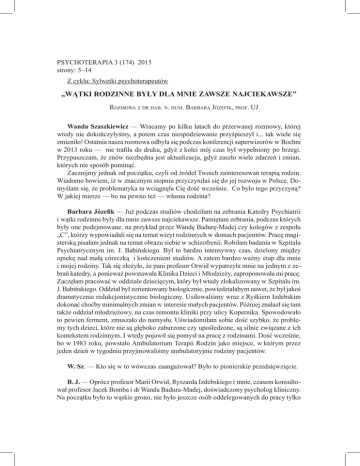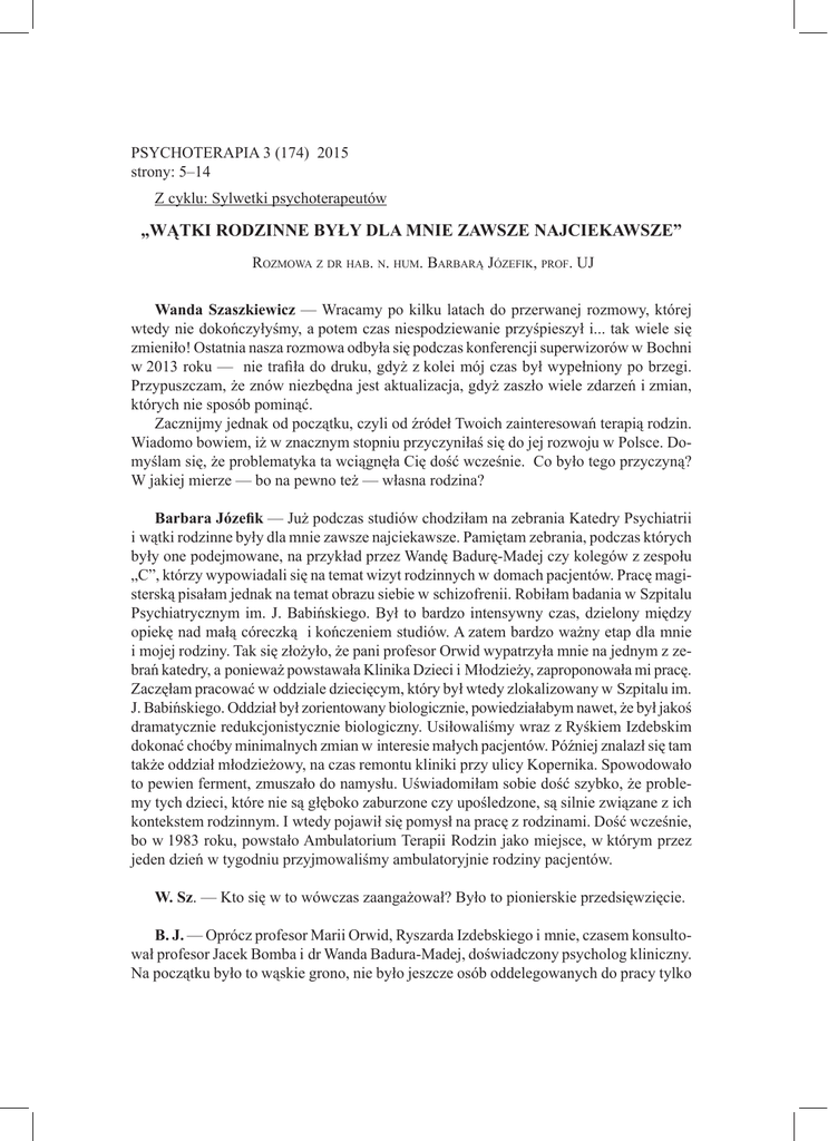 Psychoterapia 3 (174) 2015 strony: 5–14 Z cyklu: Sylwetki psychoterapeutów „Wątki rodzinne były dla mnie zawsze najciekawsze” Rozmowa z dr hab. n. hum. Barbarą Józefik, prof. UJ Wanda Szaszkiewicz — Wracamy po kilku latach do przerwanej rozmowy, której wtedy nie dokończyłyśmy, a potem czas niespodziewanie przyśpieszył i... tak wiele się zmieniło! Ostatnia nasza rozmowa odbyła się podczas konferencji superwizorów w Bochni w 2013 roku — nie trafiła do druku, gdyż z kolei mój czas był wypełniony po brzegi. Przypuszczam, że znów niezbędna jest aktualizacja, gdyż zaszło wiele zdarzeń i zmian, których nie sposób pominąć. Zacznijmy jednak od początku, czyli od źródeł Twoich zainteresowań terapią rodzin. Wiadomo bowiem, iż w znacznym stopniu przyczyniłaś się do jej rozwoju w Polsce. Domyślam się, że problematyka ta wciągnęła Cię dość wcześnie. Co było tego przyczyną? W jakiej mierze — bo na pewno też — własna rodzina? Barbara Józefik — Już podczas studiów chodziłam na zebrania Katedry Psychiatrii i wątki rodzinne były dla mnie zawsze najciekawsze. Pamiętam zebrania, podczas których były one podejmowane, na przykład przez Wandę Badurę-Madej czy kolegów z zespołu „C”, którzy wypowiadali się na temat wizyt rodzinnych w domach pacjentów. Pracę magisterską pisałam jednak na temat obrazu siebie w schizofrenii. Robiłam badania w Szpitalu Psychiatrycznym im. J. Babińskiego. Był to bardzo intensywny czas, dzielony między opiekę nad małą córeczką i kończeniem studiów. A zatem bardzo ważny etap dla mnie i mojej rodziny. Tak się złożyło, że pani profesor Orwid wypatrzyła mnie na jednym z zebrań katedry, a ponieważ powstawała Klinika Dzieci i Młodzieży, zaproponowała mi pracę. Zaczęłam pracować w oddziale dziecięcym, który był wtedy zlokalizowany w Szpitalu im. J. Babińskiego. Oddział był zorientowany biologicznie, powiedziałabym nawet, że był jakoś dramatycznie redukcjonistycznie biologiczny. Usiłowaliśmy wraz z Ryśkiem Izdebskim dokonać choćby minimalnych zmian w interesie małych pacjentów. Później znalazł się tam także oddział młodzieżowy, na czas remontu kliniki przy ulicy Kopernika. Spowodowało to pewien ferment, zmuszało do namysłu. Uświadomiłam sobie dość szybko, że problemy tych dzieci, które nie są głęboko zaburzone czy upośledzone, są silnie związane z ich kontekstem rodzinnym. I wtedy pojawił się pomysł na pracę z rodzinami. Dość wcześnie, bo w 1983 roku, powstało Ambulatorium Terapii Rodzin jako miejsce, w którym przez jeden dzień w tygodniu przyjmowaliśmy ambulatoryjnie rodziny pacjentów. W. Sz. — Kto się w to wówczas zaangażował? Było to pionierskie przedsięwzięcie. B. J. — Oprócz profesor Marii Orwid, Ryszarda Izdebskiego i mnie, czasem konsultował profesor Jacek Bomba i dr Wanda Badura-Madej, doświadczony psycholog kliniczny. Na początku było to wąskie grono, nie było jeszcze osób oddelegowanych do pracy tylko 6 Z cyklu: Sylwetki psychoterapeutów z rodzinami. Wprawdzie na oddziale młodzieżowym Marysia Orwid z Wandą Badurą prowadziły już wcześniej konsultacje rodzinne, ale terapia rodzin nie była obowiązującym standardem, tak jak jest to od wielu już lat. I oczywiście nie było wówczas pomysłu na ambulatoryjną psychoterapię dzieci i młodzieży, opartą o spotkania z całą rodziną. Ten model wypracowaliśmy z czasem. Trzeba też pamiętać, że w tamtym okresie w Polsce właściwie nie było ambulatoryjnej psychoterapii dzieci i młodzieży. Poradnie zdrowia psychicznego nastawione były na diagnozę psychiatryczną i leczenie farmakologiczne, poradnie psychologiczno-pedagogiczne, wtedy nazywane poradniami wychowawczo-zawodowymi, zajmowały się diagnozą i poradnictwem na podstawowym poziomie. Pamiętajmy, że nie było w tym okresie specjalizacji z psychologii klinicznej ani oczywiście też z psychologii klinicznej dzieci i młodzieży, nie było certyfikatów psychoterapeutów. Mało było podyplomowych szkoleń w tym zakresie, a studia nie przygotowywały należycie do pracy klinicznej. W. Sz. — Co ostatecznie przesądziło o randze terapii rodzin, o jej wprowadzeniu do praktyki klinicznej? Czy coś szczególnego na to wpłynęło? W owym czasie w USA oraz kilku krajach Europy, terapia rodzin stawała się coraz bardziej popularna. Ale nasze kontakty ze światem były wtedy bardzo ograniczone. B. J. — Było to nieuchronne. Z perspektywy czasu widać, że wszystkie nurty do nas wcześniej czy później docierają. Maria Orwid, która w latach 60. i 70. odbywała staż w ośrodkach psychoterapeutycznych w Anglii i w Finlandii, wróciła bardzo zainspirowana i zainteresowana terapią rodzin i jej rola w rozwoju tej terapii w Polsce jest nie do przecenienia. A jak pytasz o moje doświadczenie i moją perspektywę, to było tak, że jeden z moich pierwszych pacjentów, którego prowadziłam w oddziale, to był chłopiec, u którego ogromną rolę odgrywały problemy rodzinne. I to była pierwsza rodzina objęta konsekwentnie terapią, podczas jego hospitalizacji. Włączona była w to właśnie Marysia Orwid, która po latach wspominała, że był to moment, który ją przekonał, że warto jest zrobić coś odrębnego, nowego. Uznała, że warto powołać nowy zespół, który będzie rozwijał tę formę terapii. Do tej pory w naszej „małej klinice” (czyli Klinice Dzieci i Młodzieży, zwanej „małą” dla odróżnienia od Kliniki Psychiatrii Dorosłych) dominowało przekonanie, że lepiej być razem i blisko ze sobą, gdyż rozrastanie i oddzielanie niesie zawsze pewien stopień ryzyka. Zrobiliśmy to jednak i był to początek czegoś nowego: nowych zespołów w nowych miejscach. Najpierw powstało Ambulatorium Terapii Rodzin, potem kolejno: Zespół Leczenia Domowego, do którego ty później dołączyłaś, jeszcze później Oddział Dzienny. Każdy miał już własn