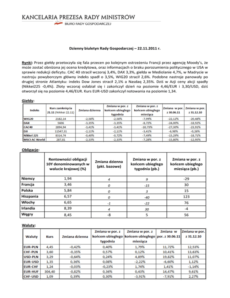Dzienny biuletyn Rady Gospodarczej – 22.11.2011 r. Rynki: Przez giełdy przetoczyła się fala przecen po kolejnym ostrzeżeniu Francji przez agencję Moody’s, że może zostad obniżona jej ocena kredytowa, oraz informacjach o braku porozumienia politycznego w USA w sprawie redukcji deficytu. CAC 40 stracił wczoraj 3,4%, DAX 3,3%, giełda w Mediolanie 4,7%, w Madrycie w nastroju powyborczym główny indeks spadł o 3,5%, WIG20 stracił 2,6%. Podobne nastroje panowały po drugiej stronie Atlantyku: indeks Dow Jones stracił 2,1% a Nasdaq 2,35%. Dziś w Azji ceny akcji spadły (Nikkei225 -0,4%). Złoty wczoraj osłabiał się i zakooczył dzieo na poziomie 4,46/EUR i 3,30/USD, dziś otworzył się na poziomie 4,46/EUR. Kurs EUR-USD zakooczył notowania na poziomie 1,34. Giełdy: Obligacje: Rentowności obligacji 10Y denominowanych w walucie krajowej (%) Zmiana dzienna (pkt. bazowe) Zmiana w por. z koocem ubiegłego tygodnia (pb.) Zmiana w por. z koocem ubiegłego miesiąca (pb.) Niemcy 1,94 4 9 -29 Francja 3,46 0 -15 30 Polska 5,84 0 3 15 Hiszpania 6,57 0 -40 123 Włochy 6,65 -1 -22 76 Irlandia 8,39 4 30 -4 Węgry 8,45 -8 5 56 Waluty: UE: MFW i KE otrzymały od rządu Węgier oficjalną prośbę o przygotowanie programu pomocowego. Trudna sytuacja Węgier wpływa na spadek zaufania do całego regionu: różnica oprocentowania austriackich i niemieckich obligacji osiągnęła rekordowy poziom i austriacki bank centralny wezwał największe banki – Erste, Raiffeisen i Bank Austria – do ograniczenia akcji pożyczkowej w Europie Środkowej. Według austriackiego regulatora zaangażowanie trzech banków w Europie Środkowej przewyższyło już PKB Austrii. W weekend zakooczyły się negocjacje projektu budżetu UE na 2012 r. Budżet wyniesie 129 mld euro i będzie wyższy jedynie o 2,02 % od tegorocznego, czyli poniżej spodziewanej inflacji oraz ponad dwukrotnie poniżej propozycji KE i oczekiwao Parlamentu. Projekt musi zostad teraz przyjęty przez PE i Radę. Inne: Agencja Moody's stwierdziła, że ostatni wzrost rentowności obligacji Francji i gorsze perspektywy wzrostu gospodarczego mogą byd negatywne dla ratingu. Agencja S&P poinformowała, że reformy zapowiedziane w expose premiera Tuska powinny stopniowo ograniczyd dług publiczny Polski, ale potrzeba więcej szczegółów, by ocenid ich wpływ na perspektywę ratingu. Specjalna dwupartyjna komisja Kongresu USA, której zadaniem było wypracowanie planu oszczędności na ponad 1 bln USD do 23 listopada 2011 r., ogłosiła brak porozumienia Republikanów i Demokratów. Oznacza to, że cięcia budżetowe nastąpią automatycznie, ale dopiero w 2013 r. Amerykaoski dług publiczny przekroczył w ubiegłym tygodniu 15 bln USD. Dane: Produkcja przemysłowa wzrosła w październiku mniej od oczekiwao – o 6,5% r/r wobec wzrostu o 7,7% r/r we wrześniu, co oznacza umiarkowane spowolnienie aktywności w przemyśle. Inflacja PPI przyspieszyła do 8,5% r/r z 8,4% r/r we wrześniu, wyżej od oczekiwao. Współpraca: Departament Analiz Strategicznych KPRM