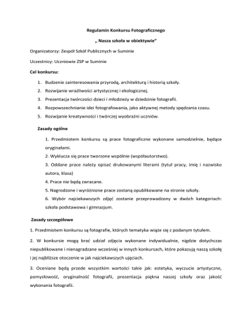 Regulamin Konkursu Fotograficznego „ Nasza szkoła w obiektywie” Organizatorzy: Zespół Szkół Publicznych w Suminie Uczestnicy: Uczniowie ZSP w Suminie Cel konkursu: 1. Budzenie zainteresowania przyrodą, architekturą i historią szkoły. 2. Rozwijanie wrażliwości artystycznej i ekologicznej. 3. Prezentacja twórczości dzieci i młodzieży w dziedzinie fotografii. 4. Rozpowszechnianie idei fotografowania, jako aktywnej metody spędzania czasu. 5. Rozwijanie kreatywności i twórczej wyobraźni uczniów. Zasady ogólne 1. Przedmiotem konkursu są prace fotograficzne wykonane samodzielnie, będące oryginałami. 2. Wyklucza się prace tworzone wspólnie (współautorstwo). 3. Oddane prace należy opisać drukowanymi literami (tytuł pracy, imię i nazwisko autora, klasa) 4. Prace nie będą zwracane. 5. Nagrodzone i wyróżnione prace zostaną opublikowane na stronie szkoły. 6. Wybór najciekawszych zdjęć zostanie przeprowadzony w dwóch kategoriach: szkoła podstawowa i gimnazjum. Zasady szczegółowe 1. Przedmiotem konkursu są fotografie, których tematyka wiąże się z podanym tytułem. 2. W konkursie mogą brać udział zdjęcia wykonane indywidualnie, nigdzie dotychczas niepublikowane i nienagradzane wcześniej w innych konkursach, które pokazują naszą szkołę i jej najbliższe otoczenie w jak najciekawszych ujęciach. 3. Oceniane będą przede wszystkim wartości takie jak: estetyka, wyczucie artystyczne, pomysłowość, oryginalność fotografii, prezentacja piękna naszej szkoły oraz jakość wykonania fotografii. 4. Technika wykonania fotografii jest dowolna. 3. Każdy uczestnik konkursu dostarcza jedną fotografię o formacie 15cmx21cm. ( UWAGA: PRACE MOŻNA DOSTARCZYĆ W FORMIE ELEKTRONICZNEJ, NA PŁYCIE CD!) 4. Fotografie, na których będą znajdować się jakiekolwiek oznaczenia, cyfry (np. daty) będą dyskwalifikowane. Terminy Prace wykonane zgodnie z wymogami organizatorów należy przekazać opiekunowi konkursu do dnia Ogłoszenie wyników i nagrody Oceny prac dokona jury, powołane przez Organizatora. Decyzje jury są ostateczne. Opiekun konkursu Justyna Ossowska
