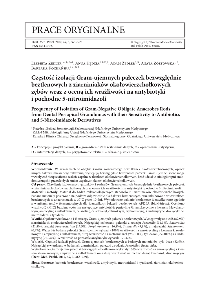 prace oryginalne Dent. Med. Probl. 2012, 49, 3, 363–369 ISSN 1644-387X © Copyright by Wroclaw Medical University and Polish Dental Society Elżbieta Zedler1 A, B, D–F, Anna Kędzia2, B,D,E, Adam Zedler3, B, Agata Żółtowska1, E, Barbara Kochańska1, A, D, E Częstość izolacji Gram-ujemnych pałeczek bezwzględnie beztlenowych z ziarniniaków okołowierzchołkowych zębów wraz z oceną ich wrażliwości na antybiotyki i pochodne 5-nitroimidazoli Frequency of Isolation of Gram-Negative Obligate Anaerobes Rods from Dental Periapical Granulomas with their Sensitivity to Antibiotics and 5-Nitroimidazole Derivatives Katedra i Zakład Stomatologii Zachowawczej Gdańskiego Uniwersytetu Medycznego Zakład Mikrobiologii Jamy Ustnej Gdańskiego Uniwersytetu Medycznego 3 Katedra i Klinika Chirurgii Szczękowo-Twarzowej i Stomatologicznej Gdańskiego Uniwersytetu Medycznego 1 2 A – koncepcja i projekt badania; B – gromadzenie i/lub zestawianie danych; C – opracowanie statystyczne; D – interpretacja danych; E – przygotowanie tekstu; F – zebranie piśmiennictwa Streszczenie Wprowadzenie. W zakażeniach w obrębie kanału korzeniowego oraz tkanek okołowierzchołkowych, oprócz innych bakterii mieszanego zakażenia, występują bezwzględnie beztlenowe pałeczki Gram-ujemne, które mogą wywoływać niespecyficzne reakcje zapalne w tkankach okołowierzchołkowych, brać udział w etiologii ropni endodontycznych i przewlekłych zmian zapalnych tkanek okołowierzchołkowych. Cel pracy. Określenie izolowanych gatunków i rodzajów Gram-ujemnych bezwzględnie beztlenowych pałeczek w ziarniniakach okołowierzchołkowych oraz ocena ich wrażliwości na antybiotyki i pochodne 5-nitroimidazoli. Materiał i metody. Materiał do badań mikrobiologicznych stanowiło 70 ziarniniaków okołowierzchołkowych. Badane materiały posiewano na podłoża odpowiednie dla bakterii beztlenowych oraz inkubowano w warunkach beztlenowych w anaerostatach w 37°C przez 10 dni. Wyhodowane bakterie beztlenowe identyfikowano zgodnie z wynikami testów fermentacyjnych dla identyfikacji bakterii beztlenowych API20A (bioMérieux). Oceniono wrażliwość (MIC) beztlenowców na następujące antybiotyki: penicylinę G, amoksycylinę z kwasem klawulanowym, ampicylinę z sulbaktamem, cefazolinę, cefadroksyl, cefuroksym, erytromycynę, klindamycynę, doksycyklinę, metronidazol i tynidazol. Wyniki. Ogółem wyizolowano 143 szczepy Gram-ujemnych pałeczek beztlenowych. Występowały one w 58 (82,9%) ziarniniakach okołowierzchołkowych. Najczęściej izolowano pałeczki z rodzaju Prevotella (34,3%), Bacteroides (21,8%), rzadziej Fusobacterium (17,5%), Porphyromonas (16,8%), Tannerella (9,8%), a najrzadziej Selenomonas (0,7%). Wszystkie badane pałeczki Gram-ujemne wykazały 100% wrażliwość na amoksycylinę z kwasem klawulanowym i ampicylinę z sulbaktamem, dużą wrażliwość na metronidazol (93–100%), tynidazol (95–100%) i klindamycynę (91–96%). Wrażliwość na pozostałe antybiotyki wynosiła 17–42%. Wnioski. Częstość izolacji pałeczek Gram-ujemnych beztlenowych z badanych materiałów była duża (82,9%). Najczęściej stwierdzano w badanych ziarniniakach pałeczki z rodzaju Prevotella i Bacteroides. Wyizolowane Gram-ujemne pałeczki bezwzględnie beztlenowe wykazały 100% wrażliwość na amoksycylinę z kwasem klawulanowym, ampicylinę z sulbaktamem oraz dużą wrażliwość na metronidazol, tynidazol, klindamycynę (Dent. Med. Probl. 2012, 49, 3, 363–369). Słowa kluczowe: bakterie beztlenowe, wrażliwość, antybiotyki, metronidazol i tynidazol, ziarniniak okołowierzchołkowy. 364 E. Zedler et al. Abstract Background. In infections within the root-canal and the periapical tissue besides other bacteria of mixed infection the Gram-negative strictly anaerobic bacteria occur. Those may cause non-specific inflammations of the periapical tissues or take part in creating an endodontic abcesses and chronic inflammatories of periapical tissue etiology. Objectives. To define the most frequently isolated species and genera of Gram-negative bacteria in obligate anaerobic periapical granuloma and their assessment of the sensitivity to antibiotics and derivatives 5-nitroimidasol. Material and Methods. The material for the microbiological study were 70 periapical granulomas. The tested materials were inoculated on substrates suitable for anaerobic bacteria and incubated at anaerobic in aerostats at 37°C for 10 days. Cultured anaerobic bacteria were identified in anaerobic conditions with applicable standards of identifying anaerobic bacteria API20A (bioMérieux). Sensitivity (MIC) of anaerobic bacteria to the following antibiotics: penicillin G, amoxicillin with clavulanic acid, ampicillin sulbactam with cefazolin, cefadroxil, cefuroxime, erythromycin, clindamycin, doxycycline, metronidazole and tynidazole was evaluated. Results. In total the 143 strains of Gram-negative anaerobic rods were isolated. They were found in 58 (82.9%) of periapical granulomas. The most frequently isolated were the rods from genera of Prevotella (34.3%), Bacteroides (21.8%), rarer Fusobacterium (17.5%), Porphyromonas (16.8%), Tannerella (9.8%), and least frequently Selenomonas (0.7%). All tested Gram-negative rods showed 100% sensitivity to amoxicillin with clavulanic acid, sulbactam and ampicillin, high sensitivity to metronidazole (93–100%), tynidazole (95–100%) and clindamycin (91–96%). Sensitivity to other antibiotics ranged from 17 to 42%. Conclusions The frequency of isolation of Gram-negative anaerobes from the tested materials was high (82.9%). The most frequently observed species in the studied granulomas, were Prevotella and Bacteroides. Isolated Gram-negative strictly anaerobic rods clearly showed 100% susceptibility to amoxicillin with clavulanic acid, sulbactam and ampicillin, high sensitivity to metronidazole, clindamycin and tynidazol (Dent. Med. Probl. 2012, 49, 3, 363–369). Key words: anaerobic bacter
