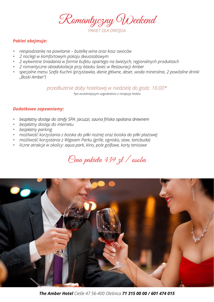 Romantyczny Weekend PAKIET DLA DWOJGA Pakiet obejmuje: • • • • • niespodziankę na powitanie – butelkę wina oraz kosz owoców 2 noclegi w komfortowym pokoju dwuosobowym 2 wykwintne śniadania w formie bufetu opartego na świeżych, regionalnych produktach 2 romantyczne obiadokolacje przy blasku świec w Restauracji Amber specjalne menu Szefa Kuchni (przystawka, danie główne, deser, woda mineralna, 2 powitalne drinki „Boski Amber”) przedłużenie doby hotelowej w niedzielę do godz. 16:00* *po wcześniejszym uzgodnieniu z recepcją Hotelu Dodatkowo zapewniamy: • • • • • • bezpłatny dostęp do internetu bezpłatny parking możliwość korzystania z boiska do piłki nożnej oraz boiska do piłki plażowej możliwość korzystania z Wigwam Parku (grille, ognisko, staw, tancbuda) liczne atrakcje w okolicy: aqua park, kino, pole golfowe, korty tenisowe Cena pakietu 439 zł / osoba The Amber Hotel Cieśle 47 56-400 Oleśnica 71 315 00 00 / 601 474 015