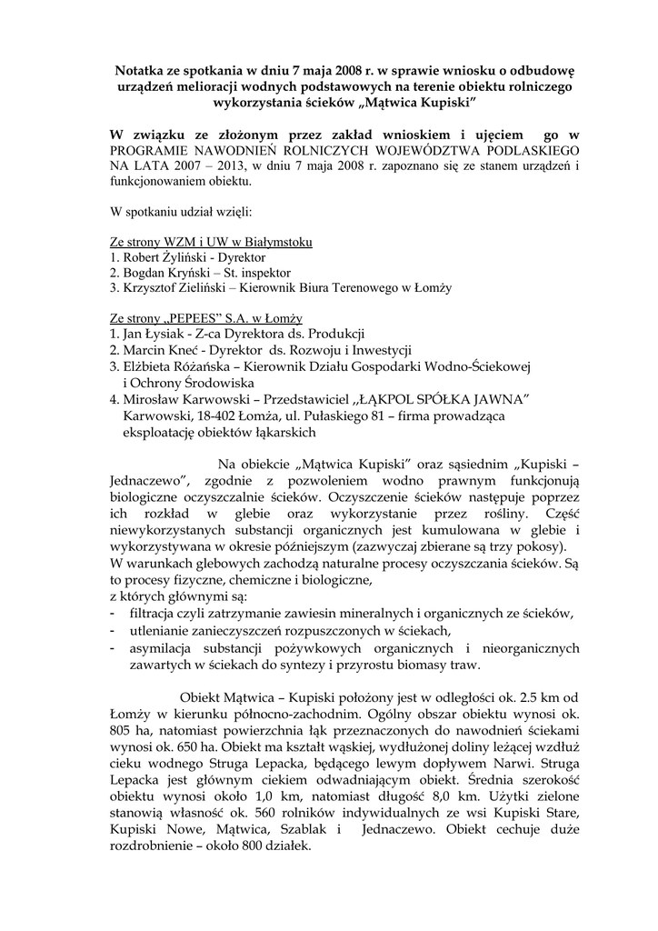 Notatka ze spotkania w dniu 7 maja 2008 r. w sprawie wniosku o odbudowę urządzeń melioracji wodnych podstawowych na terenie obiektu rolniczego wykorzystania ścieków „Mątwica Kupiski” W związku ze złożonym przez zakład wnioskiem i ujęciem go w PROGRAMIE NAWODNIEŃ ROLNICZYCH WOJEWÓDZTWA PODLASKIEGO NA LATA 2007 – 2013, w dniu 7 maja 2008 r. zapoznano się ze stanem urządzeń i funkcjonowaniem obiektu. W spotkaniu udział wzięli: Ze strony WZM i UW w Białymstoku 1. Robert Żyliński - Dyrektor 2. Bogdan Kryński – St. inspektor 3. Krzysztof Zieliński – Kierownik Biura Terenowego w Łomży Ze strony „PEPEES” S.A. w Łomży 1. Jan Łysiak - Z-ca Dyrektora ds. Produkcji 2. Marcin Kneć - Dyrektor ds. Rozwoju i Inwestycji 3. Elżbieta Różańska – Kierownik Działu Gospodarki Wodno-Ściekowej i Ochrony Środowiska 4. Mirosław Karwowski – Przedstawiciel ,,ŁĄKPOL SPÓŁKA JAWNA” Karwowski, 18-402 Łomża, ul. Pułaskiego 81 – firma prowadząca eksploatację obiektów łąkarskich Na obiekcie „Mątwica Kupiski” oraz sąsiednim „Kupiski – Jednaczewo”, zgodnie z pozwoleniem wodno prawnym funkcjonują biologiczne oczyszczalnie ścieków. Oczyszczenie ścieków następuje poprzez ich rozkład w glebie oraz wykorzystanie przez rośliny. Część niewykorzystanych substancji organicznych jest kumulowana w glebie i wykorzystywana w okresie późniejszym (zazwyczaj zbierane są trzy pokosy). W warunkach glebowych zachodzą naturalne procesy oczyszczania ścieków. Są to procesy fizyczne, chemiczne i biologiczne, z których głównymi są: - filtracja czyli zatrzymanie zawiesin mineralnych i organicznych ze ścieków, - utlenianie zanieczyszczeń rozpuszczonych w ściekach, - asymilacja substancji pożywkowych organicznych i nieorganicznych zawartych w ściekach do syntezy i przyrostu biomasy traw. Obiekt Mątwica – Kupiski położony jest w odległości ok. 2.5 km od Łomży w kierunku północno-zachodnim. Ogólny obszar obiektu wynosi ok. 805 ha, natomiast powierzchnia łąk przeznaczonych do nawodnień ściekami wynosi ok. 650 ha. Obiekt ma kształt wąskiej, wydłużonej doliny leżącej wzdłuż cieku wodnego Struga Lepacka, będącego lewym dopływem Narwi. Struga Lepacka jest głównym ciekiem odwadniającym obiekt. Średnia szerokość obiektu wynosi około 1,0 km, natomiast długość 8,0 km. Użytki zielone stanowią własność ok. 560 rolników indywidualnych ze wsi Kupiski Stare, Kupiski Nowe, Mątwica, Szablak i Jednaczewo. Obiekt cechuje duże rozdrobnienie – około 800 działek. W skład obiektu Mątwica – Kupiski wchodzą: komora samouspokojenia, z której ścieki kierowane są do doprowadzalników głównych A i D, - doprowadzalniki główne A, D oraz częściowo C, B, E, F, G wraz z siecią doprowadzalników szczegółowych na poszczególne kwatery poprzez system zasuw - zastawek, - system otwartych rowów odwadniających (odprowadzalników) połączonych ze Struga Lepacką, - 580 kwater łąkowych o powierzchni od 0.4 do 2.8 ha, - otwarty kanał przerzutowy wody z rzeki Łomżyczki do Strugi Lepackiej położony powyżej obiektu w pobliżu komory samouspokojenia, - budowle piętrzące na Strudze Lepackiej i rzece Łomżyczce pozwalające na przerzut wody z Łomżyczki lub z rzeki Narwi do Strugi Lepackiej oraz umożliwiające regulację intensywności odwodnienia obiektu. Długość Doprowadzalników „A” i „D” /podstawowych/ wynosi 15,12 km łącznie z kanałem przerzutowym łączącym Łomżyczkę i Strugę Lepacką. - Obiekt Mątwica – Kupiski jest nawadniany ściekami od 1964 r., kiedy rozpoczęto oczyszczać ścieki z krochmalni. Ścieki z zakładu tłoczone są do komory samouspokojenia, skąd poprzez doprowadzalniki główne i II rzędu rozprowadzane są na poszczególne kwatery systemem zalewowym. Na łąkach zachodzą naturalne procesy oczyszczania ścieków z wykorzystaniem przez roślinność łąkową substancji biogennych zawartych w ściekach. Rowy stanowią sieć odwadniającą obiektu, przechwytują oczyszczone w glebie ścieki i doprowadzają do Strugi Lepackiej, skąd dopływają do rzeki Narwi, która jak określa pozwolenie wodnoprawne, jest odbiornikiem oczyszczonych ścieków z obiektu. Ponieważ „PEPEES” S.A. prowadzi eksploatację obiektu, stara się stworzyć korzystne warunki wilgotnościowe na łąkach w celu zapewnienia rolnikom wysokich zbiorów traw. Dlatego jeśli występują niedobory wody w okresie wegetacyjnym, a ilość ścieków doprowadzanych na obiekt jest zbyt mała żeby pokryć niedobory, wówczas obiekt nawadniany jest wodą powierzchniową. Istniejące rozwiązania techniczne umożliwiają wykorzystanie wody do nawodnień użytków zielonych ze Strugi Lepackiej, Łomżyczki i Narwi. INFORMACJA O ZAKŁADZIE LOKALIZACJA. Przedsiębiorstwo Przemysłu Spożywczego ,,PEPEES” Spółka Akcyjna w Łomży zlokalizowane jest w południowo-zachodniej części miasta, w otoczeniu terenów przemysłowych i rolniczych wsi Kraska. Jest on oddalony od centrum miasta o ok. 3 km, w kierunku południowo-zachodnim. W odległości ok. 4 km od zakładu w kierunku północno-wschodnim przepływa rzeka Narew. Bezpośrednio przy granicy zakładu (od strony wschodniej) przepływa rzeka Łomżyczka, będąca dopływem Narwi. 2 ,,PEPEES” S.A. powstała z przekształcenia Przedsiębiorstwa Przemysłu Spożywczego w Łomży stanowiącego własność Skarbu Państwa., w dniu 21.06.1994 roku. INFORMACJE O RODZAJU PROWADZONEJ DZIAŁALNOŚCI. Zakład zajmuje się przetwórstwem ziemniaków. Główne produkty Łomżyńskiej Krochmalni to: • skrobia ziemniaczana ( mączka ziemniaczana ) z szerokim zastosowaniem w przemyśle spożywczym, a także włókienniczym, papierniczym, chemicznym, kosmetycznym i farmaceutycznym • syropy maltozowe stosowane są m.in. w produkcji karmelków, gum do żucia, galaretek owocowych, lodów i mrożonych deserów. Syropy zapewniają produktom odpowiednią strukturę i 