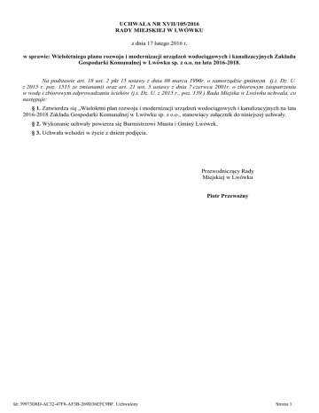UCHWAŁA NR XVII/105/2016 RADY MIEJSKIEJ W LWÓWKU z dnia 17 lutego 2016 r. w sprawie: Wieloletniego planu rozwoju i modernizacji urządzeń wodociągowych i kanalizacyjnych Zakładu Gospodarki Komunalnej w Lwówku sp. z o.o. na lata 2016-2018. Na podstawie art. 18 ust. 2 pkt 15 ustawy z dnia 08 marca 1990r. o samorządzie gminnym (j.t. Dz. U. z 2015 r. poz. 1515 ze zmianami) oraz art. 21 ust. 5 ustawy z dnia 7 czerwca 2001r. o zbiorowym zaopatrzeniu w wodę i zbiorowym odprowadzaniu ścieków (j.t. Dz. U. z 2015 r., poz. 139.) Rada Miejska w Lwówku uchwala, co następuje: § 1. Zatwierdza się „Wieloletni plan rozwoju i modernizacji urządzeń wodociągowych i kanalizacyjnych na lata 2016-2018 Zakładu Gospodarki Komunalnej w Lwówku sp. z o.o., stanowiący załącznik do niniejszej uchwały. § 2. Wykonanie uchwały powierza się Burmistrzowi Miasta i Gminy Lwówek. § 3. Uchwała wchodzi w życie z dniem podjęcia. Przewodniczący Rady Miejskiej w Lwówku Piotr Przewoźny Id: 39973D8D-AC32-47F8-AF3B-269D36EFC9BF. Uchwalony Strona 1 Załącznik do Uchwały nr XVII/105/2016 Rady Miejskiej w Lwówku z dnia 17 lutego 2016 r. WIELOLETNI PLAN ROZWOJU I MODERNIZACJI URZĄDZEŃ WODOCIĄGOWYCH I KANALIZACYJNYCH NA LATA 2016-2018 BĘDĄCYCH W POSIADANIU ZAKŁADU GOSPODARKI KOMUNALNEJ W LWÓWKU Sp. z o.o. Autor: Janusz Wesołek - Prezes Zarządu ZGK w Lwówku sp. z o.o. Lwówek, grudzień 2015 str. 1 Id: 39973D8D-AC32-47F8-AF3B-269D36EFC9BF. Uchwalony Strona 2 SPIS TREŚCI: str. 1. PODSUMOWANIE WYKONAWCZE 3 2. PODSTAWA PRAWNA 4 3. CEL OPRACOWANIA 5 4. ZAKRES OPRACOWANIA 5 5. KRYTERIA DOBORU ZADAŃ INWESTYCYJNYCH 6 6. PLANOWANY ZAKRES USŁUG WODOCIĄGOWO-KANALIZACYJNYCH 6 7. PRZEDSIĘWZIĘCIA ROZWOJOWO - MODERNIZACYJNE I RACJONALIZUJĄCE ZUŻYCIE WODY ORAZ WPROWADZANIE ŚCIEKÓW W LATACH 2016 – 2018 7 8. NAKŁADY INWESTYCYJNE W LATACH 2016 – 2018 8 9. SPOSOBY FINANSOWANIA PLANOWANYCH INWESTYCJI 8 10.ANALIZA WZROSTU CEN I OPŁAT W LATACH 2016-2018 8 str. 2 Id: 39973D8D-AC32-47F8-AF3B-269D36EFC9BF. Uchwalony Strona 3 1. Podsumowanie wykonawcze Niniejszy „Wieloletni plan rozwoju i modernizacji urządzeń wodociągowych i kanalizacyjnych na lata 2016 – 2018” jest kontynuacją wieloletniego planu rozwoju i modernizacji urządzeń wodociągowych i kanalizacyjnych na lata 2013 – 2015 oraz koncepcji inwestycyjnej wdrożonej przez Zakład Gospodarki Komunalnej w Lwówku sp. z o.o. pod nazwą koncepcja wodociągowania Gminy Lwówek i koncepcji programowej gospodarki ściekowej Gminy Lwówek. Celem tych działań jest: - Zapewnienie zgodnej z oczekiwaniami konsumentów jakości usług wodociągowo – kanalizacyjnych, spełniającej parametry ustanowione przez prawo polskie oraz Unię Europejską; - Zachowanie trwałości projektów wdrożonych przez Gminę Lwówek, - Stworzenie dalszych warunków do rozwoju infrastruktury wodociągowo – kanalizacyjnej w gminie Lwówek oraz pozyskanie nowych klientów indywidualnych i instytucjonalnych, - Osiągnięcie wymaganego bezpieczeństwa eksploatacji posiadanych środków trwałych, - Optymalizacja kosztów stałych i zmiennych funkcjonowania ZGK w Lwówku sp. z o.o., - Minimalizacja ryzyka związanego z mogącymi wystąpić sytuacjami nadzwyczajnymi. „Wieloletni plan rozwoju i modernizacji urządzeń wodociągowych i kanalizacyjnych na lata 2016 – 2018” obejmuje inwestycje, o wartości netto 2 540 000,00 złote. W ramach „Wieloletniego planu” zostaną wdrożone wodociągowe i kanalizacyjne inwestycje (modernizacje/budowa ), jak i zadania technologiczne. Zestawienie kwotowe zadań inwestycyjnych w podziale na branże zostało zaprezentowane w poniższej tabeli. WPRiM - propozycje do planu na lata 2016-2018 TEMAT Remont sieci i przyłączy ul. Rynek, Wittmanna. Bez odtworzenia nawierzchni Budowa sieci spinającej Pakosław – Władysławo Budowa sieci wodociągowej i kanalizacyjnej razem z pompownią w ul. Sadowej w Lwówku Budowa kanalizacji sanitarnej w Zębowie RAZEM KOSZT NETTO 120 000 zł. 700 000 zł. 220 000 zł. 1 500 000 zł. 2 540 000 zł. ROK REALIZACJI 2017-2018 2017-2018 2016 2016 UWAGI remont sieci budowa rozbudowa aglomeracja Lwówek Plan został opracowany przy założeniu konieczności minimalizacji wysokości taryf za usługi wodociągowo – kanalizacyjne w latach 2016 – 2018 w Lwówku. Podstawowym założeniem, leżącym u podstaw wdrożenia „Wieloletniego planu”, jest: - Wywiązanie się ze zobowiązań w zakresie jakości oraz dostępności usług dla mieszkańców zamieszkujących w gminie Lwówek, - Minimalne obciążenie budżetu gospodarstw domowych opłatami za usługi wodociągowo – kanalizacyjne , - Pełna zgodność planów inwestycyjnych z zapisami studium uwarunkowań i kierunków zagospodarowania przestrzennego Gminy Lwówek, - Wieloletni plan rozwoju i modernizacji urządzeń wodociągowych i kanalizacyjnych na lata 2016 – 2018 został przygotowany przez ZGK w Lwówku sp. z o.o. str. 3 Id: 39973D8D-AC32-47F8-AF3B-269D36EFC9BF. Uchwalony Strona 4 Przedmiotowy „Wieloletni Plan” zatwierdza Rada Miejska w Lwówku, jako mająca wpływ na politykę cenową (taryfową) Spółki. 2. Podstawa prawna Podstawą działalności Spółki jest - wydana na podstawie art. 16 ust 1 ustawy z dnia 7 czerwca 2001 r. o zbiorowym zaopatrzeniu w wodę i zbiorowym odprowadzaniu ścieków (j.t. Dz.U. z 2015 r., poz.139) - Decyzja nr 1/2011 Burmistrza Miasta i Gminy Lwówek z dnia 21 lutego 2011 roku w sprawie wydania zezwolenia przedsiębiorstwu wodociągowokanalizacyjnemu, pod nazwą Zakład Gospodarki Komunalnej w Lwówku sp. z o.o. z siedzibą w Lwówku, na prowadzenie działalności w zakresie zbiorowego zaopatrzenia w wodę i zbiorowego odprowadzania ścieków. Spółka skupia swoją działalność na najważniejszych obszarach, do których należą: - pobór, uzdatnianie i dystrybucja wody dla potrzeb domowych i przemysłowych, - odprowadzanie i oczyszczanie ścieków, a także - stacja kontroli pojazdów, - odb