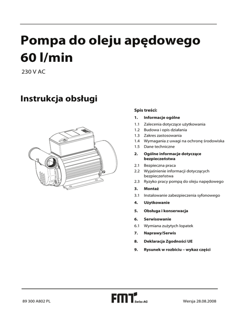 Pompa do oleju apędowego 60 l/min 230 V AC Instrukcja obsługi Spis treści: 1. Informacje ogólne 1.1 1.2 1.3 1.4 1.5 Zalecenia dotyczące użytkowania Budowa i opis działania Zakres zastosowania Wymagania z uwagi na ochronę środowiska Dane techniczne 2. Ogólne informacje dotyczące bezpieczeństwa 2.1 Bezpieczna praca 2.2 Wyjaśnienie informacji dotyczących bezpieczeństwa 2.3 Ryzyko pracy pompą do oleju napędowego 3. Montaż 3.1 Instalowanie zabezpieczenia syfonowego 4. Użytkowanie 5. Obsługa i konserwacja 6. Serwisowanie 6.1 Wymiana zużytych lopatek 89 300 A802 PL 7. Naprawy/Serwis 8. Deklaracja Zgodności UE 9. Rysunek w rozbiciu – wykaz części Wersja 28.08.2008 Instrukcja obsługi 1. 1.1 Pompa do oleju napędowego 60 l/min Informacje ogólne Zalecenia dotyczące użytkowania • Pompa do oleju napędowego powinna być stosowana wyłącznie do pompowania tego czynnika. • Nigdy nie wolno stosować jej do pompowania płynów wybuchowych, takich jak benzyna, lub inne o podobnym punkcie zaplonu! • Pompę można podłączać wyłącznie do sieci zasilającej 230 V AC. • Aby mieć pewność, żę spełniane są warunki użytkowania, należy uważnie przeczytać całą niniejszą instrukcję obsługi przed przystąpieniem do użytkowania pompy i przestrzegać wszystkich zaleceń. • Jakiekolwiek odstępstwo od warunków użytkowania (inny czynnik, użycie siły) lub modyfikacje wprowadzone przez użytkownika (zmiany, użycie części nie oryginalnych) może być niebezpieczne i jest traktowane jako niezalecany sposób użytkowania. • Użytkownik ponosi odpowiedzialność za szkodę wynikłą wskutek nieodpowiedniego użytkowania pompy. • Przy jakichkolwiek naprawach elementów elektrycznych należy przestrzegać wszelkich zasad bezpieczeństwa i higieny pracy. • Do wszelkich napraw należy stosować jedynie oryginalne części zamienne, w przeciwnym przypadku traci ważność gwarancja. 1.2 Budowa i opis działania • Pompa do oleju napędowego może być wyposażona w szereg akcesoriów z firmy FMT. • Aby zapobiec zanieczyszczeniu środowiska pompa do oleju napędowego jest wyposażona w układ zabezpieczenia syfonowego. Oznacza to, że w przypadku uszkodzenia przewodu wydającego, gdy pompa jest zatrzymana, dzięki działaniu syfonu nie dojdzie do opróżnienia zbiornika. 1.3 Zakres zastosowania Pompa nadaje się do pompowania oleju napędowego lub opałowego, ale tylko gdy nie są one podgrzane powyżej ich punktu zapłonu. Temperatura pompowanych płynów musi zawierać się w granicach –10 °C i +40 °C. Nie wolno przekroczyć tych wartości granicznych. Ponieważ silnik oraz włącznik nie są typu zabezpieczonego przez eksplozją nie wolno • użytkować pompy w środowisku, gdzie istnieje niebezpieczeństwo eksplozji. • stosować pompy do pompowania płynów należących do klasy zagrożenia A I, A II i B. 1.4 Wymagania z uwagi na ochronę środowiska Olej opałowy i napędowy są substancjami mogącymi zanieczyścić wodę. Z tego powodu należy przestrzegać określonych norm i przepisów krajowych dotyczących dostawy i przechowywania takich płynów. Zgodnie z § 19g WHG (Niemcy) instalacja do pompowania musi być tak skonstruowana i wykonana, utrzymywana i użytkowana, aby nie mogło dojść do zanieczyszczenia wody lub powstania innych zagrożeń dla środowiska. Użytkownik takiej instalacji, zgodnie z § 19i WHG (Niemcy) jest odpowiedzialny za ciągły jej nadzór, w celu spełnienia wymagań wyżej wymienionych przepisów. 2 Pompa do oleju napędowego 60 l/min 1.5 Instrukcja obsługi Dane techniczne Rok produkcji Siehe Typenschild Temperatura płynu °C -10 bis +40 Gwint złącza G 1“ i Prąd A 2,4 Moc W 380 Kondensator μF 450V – 12 μF ±5 % Ustawienie ciśnienia zadziałania zaworu bezpieczeństwa bar 1,8 Maks. wysokość zasysania m 5 Wydatek nominalny* L / min 58 Napięcie V / AC 230 Częstotliwość Hz 50 Prędkośc obrotowa min-1 2800 Klasa ochrony IP 54 Przewód zasilający m 1,8 Masa Kg 6,3 * przy swobodnym wypływie czynnika Tab. 1-1: Dane techniczne 2. 2.1 Ogólne informacje dotyczące bezpieczeństwa Bezpieczna praca • Pompa do oleju napędowego została skonstruowana i wykonana zgodnie z wymaganiami odpowiednich dyrektyw UE, dotyczącymi higieny i bezpieczeństwa. • Pomimo to, może wystąpić niebezpieczeństwo jeśli wyrób nie zostanie zainstalowany lub nie będzie użytkowany zgodnie z wymaganiami. • Dlatego, przed przystąpieniem do użytkowania pompy, należy uważnie przeczytać niniejszą instrukcję i udostępnić ją innym użytkownikom. • W czasie posługiwania się pompą należy przestrzegać lokalnych przepisów bezpieczeństwa i higieny pracy oraz wszelkich zaleceń dotyczących bezpieczeństwa, zawartych w niniejszej instrukcji. 2.2 Wyjaśnienie informacji dotyczących bezpieczeństwa Informacje dotyczące bezpieczestwa, podane w niniejszej instrukcji, są sklasyfikowane według poziomu zagrożenia: Poszczególne poziomy zagrożenia są oznakowane w niniejszej instrukcji za pomocą następujących symboli i określeń: 3 Instrukcja obsługi Symbol Pompa do oleju napędowego 60 l/min Sygnalizuje Rezultat nie przestrzegania przepisów bezpieczeństwa lub nie stosowania się do nich Zagrożenie Śmierć lub bardzo poważne uszkodzenie ciała Ostrzeżenie Możliwa śmierć lub poważne uszkodzenie ciała Uwaga Możliwe lekkie lub niezbyt poważne uszkodzenie ciała albo szkoda materialna Tab. 2-1: Klasyfikacja zagrożeń według rodzaju zagrożenia i jego powagi Dodatkowo stosowany jest inny symbol wskazujący na ogólne zalecenia dotyczące użytkowania wyrobu. Symbol Sygnalizuje Określenie Wskazówka Informacja dodatkowa lub zalecenie jak należy użytkować wyrób Tab. 2-2: Informacje ogólne 2.3 Ryzyko pracy pompą do oleju napędowego Zagrożenie! Nie można podejmować jakichkolwiek czynności przy pompie pracującej! Montaż lub demontaż elementów osprzętu lub akcesoriów można przeprowadz