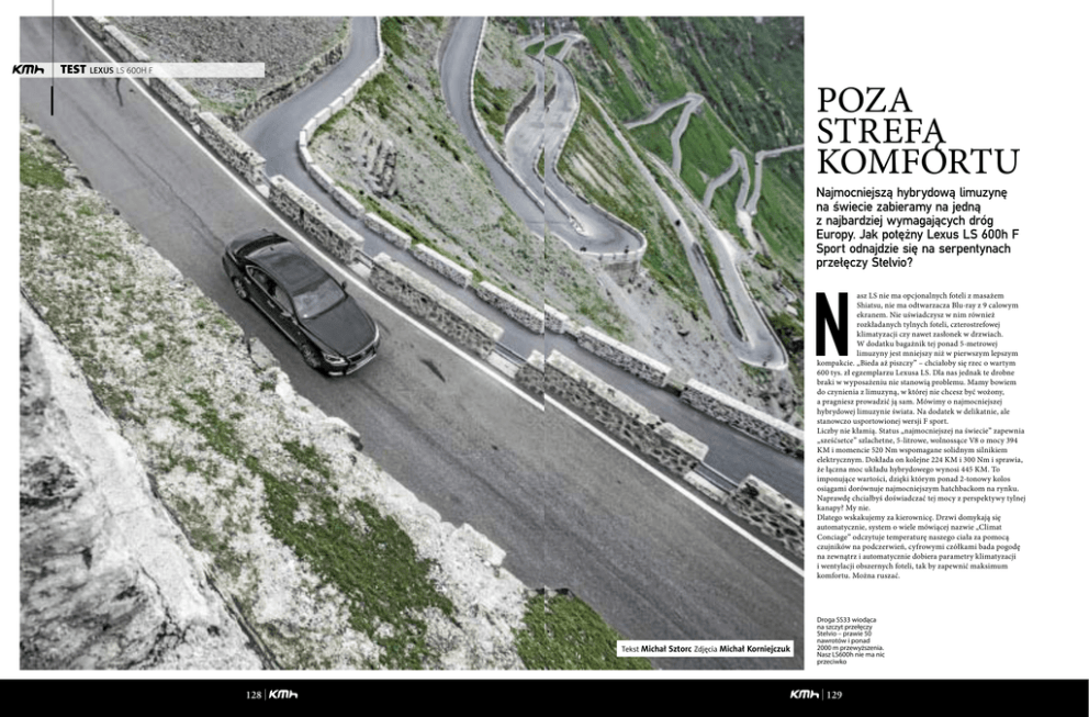 TEST Lexus LS 600h F Poza strefą komfortu Najmocniejszą hybrydową limuzynę na świecie zabieramy na jedną z najbardziej wymagających dróg Europy. Jak potężny Lexus LS 600h F Sport odnajdzie się na serpentynach przełęczy Stelvio? N asz LS nie ma opcjonalnych foteli z masażem Shiatsu, nie ma odtwarzacza Blu-ray z 9 calowym ekranem. Nie uświadczysz w nim również rozkładanych tylnych foteli, czterostrefowej klimatyzacji czy nawet zasłonek w drzwiach. W dodatku bagażnik tej ponad 5-metrowej limuzyny jest mniejszy niż w pierwszym lepszym kompakcie. „Bieda aż piszczy” – chciałoby się rzec o wartym 600 tys. zł egzemplarzu Lexusa LS. Dla nas jednak te drobne braki w wyposażeniu nie stanowią problemu. Mamy bowiem do czynienia z limuzyną, w której nie chcesz być wożony, a pragniesz prowadzić ją sam. Mówimy o najmocniejszej hybrydowej limuzynie świata. Na dodatek w delikatnie, ale stanowczo usportowionej wersji F sport. Liczby nie kłamią. Status „najmocniejszej na świecie” zapewnia „sześćsetce” szlachetne, 5-litrowe, wolnossące V8 o mocy 394 KM i momencie 520 Nm wspomagane solidnym silnikiem elektrycznym. Dokłada on kolejne 224 KM i 300 Nm i sprawia, że łączna moc układu hybrydowego wynosi 445 KM. To imponujące wartości, dzięki którym ponad 2-tonowy kolos osiągami dorównuje najmocniejszym hatchbackom na rynku. Naprawdę chciałbyś doświadczać tej mocy z perspektywy tylnej kanapy? My nie. Dlatego wskakujemy za kierownicę. Drzwi domykają się automatycznie, system o wiele mówiącej nazwie „Climat Conciage” odczytuje temperaturę naszego ciała za pomocą czujników na podczerwień, cyfrowymi czółkami bada pogodę na zewnątrz i automatycznie dobiera parametry klimatyzacji i wentylacji obszernych foteli, tak by zapewnić maksimum komfortu. Można ruszać. Tekst Michał Sztorc Zdjęcia Michał Korniejczuk 128 Droga SS33 wiodąca na szczyt przełęczy Stelvio – prawie 50 nawrotów i ponad 2000 m przewyższenia. Nasz LS600h nie ma nic przeciwko 129 TEST Lexus LS 600h F Szybko okazuje się, że polska sieć drogowa jest zbyt klaustrofobiczna, a autostrady zbyt krótkie dla potencjału drzemiącego w LS600h F sport. Przy 140 km/h auto zdaje się męczyć, nie wie co począć z rezerwami mocy, dusi się i prosi o więcej. Nic dziwnego, że stylowy zegarek na konsoli centralnej synchronizowany jest z aktualnym czasem za pomocą sygnału z GPS. W LS łatwo niepostrzeżenie zapędzić się w inną strefę czasową i nawet tego nie zauważyć. Na monstrualnym, chociaż już nieco oldschoolowym, 12,3-calowym ekranie nawigacji, za pomocą znanego fanom Lexusa joysticka, wybieramy ambitny cel podróży. Zobaczmy jak nasz F sport sprawdzi się w entourage’u, który będzie dla niego równie wielkim wyzwaniem, jak wcinanie ryżu za pomocą palaczek dla większości śmiertelników. Słowem, zabieramy LS-a poza jego strefę komfortu. Nasz punkt docelowy znajduje się na wysokości ponad 2800 m n.p.m. i ukryty jest gdzieś głęboko we wschodniej części Alp. Prowadzi do niego jedna z najbardziej wymagających dróg Europy. A na pewno najbardziej wymagająca, jakie przyszły nam do głowy. Zgadliście, mowa o przełęczy Stelvio… Fotograf ze sprzętem ląduje na tylnej kanapie, w zbiorniku paliwa 85 litrów bezołowiowej i pod osłoną nocy wyruszamy w kierunku Alp. Już droga na przełęcz jest celem samym w sobie. Blisko 800 km pokonujemy niemieckimi autostradami, gdzie obowiązujący limit prędkości to ten wyznaczony elektronicznie przez inżynierów Lexusa. W naszym przypadku – 250 km/h. Szybkość i konsekwencja, z jaką wskazówka zapędza się w graniczne rejony prędkościomierza jest zatrważająca i imponująca zarazem. LS aż do „limitu” nie traci wigoru, ani na chwilę nie łapie zadyszki i jasno daje do zrozumienia, że z chęcią pognałby jeszcze szybciej. Jeszcze w Polsce, przy prędkościach rzędu 140 km/h, LS600h imponuje wyciszeniem wnętrza. To zupełnie inny poziom akustycznej izolacji w porównaniu do aut za marne 200-300 tys. zł. Przechwałki Lexusa, że LS to jeden z najlepiej wyciszonych sedanów na świecie wcale nie są próżne. 19-calowe felgi z kutego aluminium posiadają nawet specjalne komory, które pochłaniają hałas opon, a drgania akustyczne przekształcają w energię kinetyczną. Po przekroczeniu 200 km/h, we wnętrzu nadal słychać jedynie delikatny szum. Kiedy staje się on zbyt Stały napęd na wszystkie koła i regulowany prześwit pozwala śmiało wybierać mniej konwencjonalne drogi. Lexus LS600h to obecnie najmocniejsza, hybrydowa limuzyna na świecie. A wersja F sport to jej najlepsza odmiana. 130 Podświetlenie i wygląd tablicy zegarów zmienia się w zależności od wybranego trybu jazdy. Centrum dowodzenia LS. Lewarek bezstopniowej skrzyni, pokrętło wyboru trybu jazdy, joystick do obsługi nawigacji. 131 test Lexus LS 600h F 5-litrowe V8 i silnik elektryczny sprawiają, że potężny LS600h osiągami dorównuje najszybszym hatchbackom na rynku. monotonny, w sukurs przychodzi 19-głośnikowy system audio firmowany przez pana Marka Levinosona. Całość pod względem wizualnym może nie jest tak spektakularna jak Bang&Olufsen w Audi, jednak w kwestii brzmienia to bezsprzecznie jedno z lepszych nagłośnień montowanych w samochodach. Wszechogarniający komfort potęgowany jest przez charakterystykę pneumatycznego zawieszenia. W wersji F Sport fachowcy pracujący wcześniej przy LF-A, obniżyli je o 10 mm. Mimo tego wciąż otrzymujemy to wyjątkowe odczucie unoszenia się kilka milimetrów nad asfaltem. Wspierani dodatkowo aktywnym tempomatem oraz nową generacją adaptacyjnych świateł drogowych niepostrzeżenie docieramy do serca Alp. Pogodny lipcowy ranek witamy u podnóży przełęczy Stelvio. Od szczytu dzieli nas ponad 40 nawrotów o 180 stopni i solidna wspinaczka. Droga otwarta jest zaledwie kilka miesięcy w roku, a w dodatku jesteśmy tu w środku sezonu urlopowe