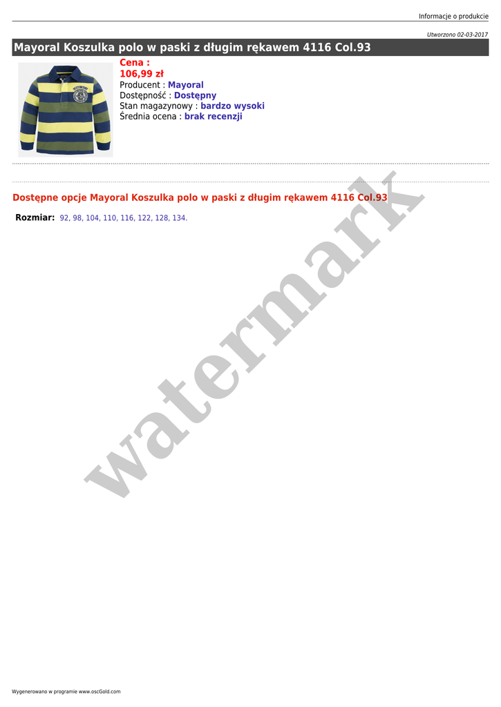 Informacje o produkcie Utworzono 02-03-2017 Mayoral Koszulka polo w paski z długim rękawem 4116 Col.93 Cena : 106,99 zł Producent : Mayoral Dostępność : Dostępny Stan magazynowy : bardzo wysoki Średnia ocena : brak recenzji er m ar k Dostępne opcje Mayoral Koszulka polo w paski z długim rękawem 4116 Col.93 w at Rozmiar: 92, 98, 104, 110, 116, 122, 128, 134. Wygenerowano w programie www.oscGold.com