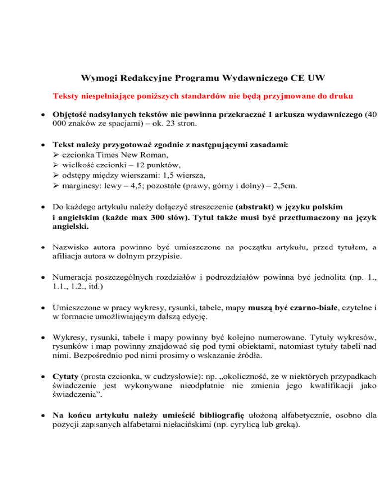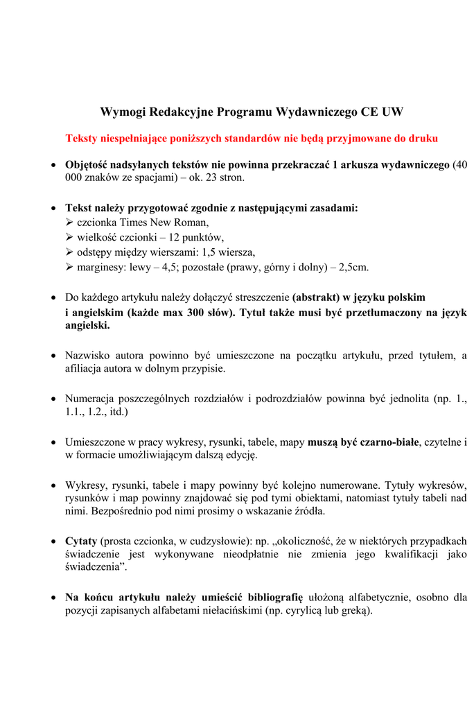 Wymogi Redakcyjne Programu Wydawniczego CE UW Teksty niespełniające poniższych standardów nie będą przyjmowane do druku Objętość nadsyłanych tekstów nie powinna przekraczać 1 arkusza wydawniczego (40 000 znaków ze spacjami) – ok. 23 stron. Tekst należy przygotować zgodnie z następującymi zasadami: czcionka Times New Roman, wielkość czcionki – 12 punktów, odstępy między wierszami: 1,5 wiersza, marginesy: lewy – 4,5; pozostałe (prawy, górny i dolny) – 2,5cm. Do każdego artykułu należy dołączyć streszczenie (abstrakt) w języku polskim i angielskim (każde max 300 słów). Tytuł także musi być przetłumaczony na język angielski. Nazwisko autora powinno być umieszczone na początku artykułu, przed tytułem, a afiliacja autora w dolnym przypisie. Numeracja poszczególnych rozdziałów i podrozdziałów powinna być jednolita (np. 1., 1.1., 1.2., itd.) Umieszczone w pracy wykresy, rysunki, tabele, mapy muszą być czarno-białe, czytelne i w formacie umożliwiającym dalszą edycję. Wykresy, rysunki, tabele i mapy powinny być kolejno numerowane. Tytuły wykresów, rysunków i map powinny znajdować się pod tymi obiektami, natomiast tytuły tabeli nad nimi. Bezpośrednio pod nimi prosimy o wskazanie źródła. Cytaty (prosta czcionka, w cudzysłowie): np. „okoliczność, że w niektórych przypadkach świadczenie jest wykonywane nieodpłatnie nie zmienia jego kwalifikacji jako świadczenia”. Na końcu artykułu należy umieścić bibliografię ułożoną alfabetycznie, osobno dla pozycji zapisanych alfabetami niełacińskimi (np. cyrylicą lub greką). Podstawowe skróty: DzU (Dziennik Ustaw) Dz.Urz. (Dziennik Urzędowy) r. (rok) w. (wiek) tys. (skrót zamiast trzech zer) mln (zamiast sześciu zer) Wzory przypisów i bibliografii dla potrzeb Programu Wydawniczego CE UW Przypisy powinny znajdować się wyłącznie na dole strony, numerowane numeracją łączną, cyframi arabskimi. Rodzaj czcionki w przypisie Times New Roman, jej wielkość – 10 pkt, interlinia 1. Numer przypisu w tekście powinien znajdować się przed znakiem przestankowym, tzn. przed kropką, przecinkiem, średnikiem. Przykłady Źródła przypisów: Książka B. Góralczyk, Przebudzenie smoka. Powrót Chin na scenę globalną, Rambler, Warszawa 2012, s. 33. Rozdział w pracy zbiorowej W. Jankowski, Stosunki Ukrainy z Mołdawią w: Ukraina w Stosunkach Międzynarodowych, red. M. Pietraś, T. Kapuśniak, Wydawnictwo UMCS, Lublin 2007, s. 225. Artykuł z czasopisma D. Milczarek, Rozszerzenie Unii Europejskiej na Wschód – geneza, rezultaty, perspektywy, „Studia Europejskie” 1/2014, s.11. Artykuł z czasopisma umieszczonego w zasobach WWW A. Jarosiewicz, K. Strachota, Turcja a problem uchodźców syryjskich, „Komentarze OSW”, nr. 186/2015, s. 3-4, http://www.osw.waw.pl/sites/default/files/komentarze_186.pdf [dostęp 10.12.2015]. Strona internetowa: http://ec.europa.eu/economy_finance/eu_borrower/macro-financial_assistance/index_en.htm [dostęp 10.12.2015]. Dokument Sprawozdanie Komisji dla Parlamentu Europejskiego i Rady. Przegląd dyrektywy Parlamentu Europejskiego i Rady 2010/30/UE z dnia 19 maja 2010 r. w sprawie wskazania poprzez etykietowanie oraz standardowe informacje o produkcie, zużycia energii oraz innych zasobów przez produkty związane z energią, COM(2015) 345 final, Bruksela 15.7.2015 r. W przypadku powtarzania się przypisu: A. Kowalski, Historia integracji europejskiej, PWN, Warszawa 1995, s. 23–45, 54. Jeżeli przypis następuje bezpośrednio jeden po drugim, piszemy: Ibidem, s. 56. Jeżeli przypis następuje dalej, piszemy: A. Kowalski, op.cit., s. 27. lub Por.: A. Kowalski, op.cit. Jeżeli cytowanych jest więcej dzieł tego samego autora, precyzujemy, o które chodzi: A. Kowalski, Historia integracji..., op.cit., s. 29–41. Bibliografia Bibliografia powinna być zbiorcza, ułożona alfabetycznie według poniższych przykładów: Książka Góralczyk B., Przebudzenie smoka. Powrót Chin na scenę globalną, Rambler, Warszawa 2012. Rozdział z pracy zbiorowej Jankowski W., Stosunki Ukrainy z Mołdawią w: Ukraina w Stosunkach Międzynarodowych, red. M. Pietraś, T. Kapuśniak, Wydawnictwo UMCS, Lublin 2007. Artykuł z czasopisma Milczarek D., Rozszerzenie Unii Europejskiej na Wschód – geneza, rezultaty, perspektywy, „Studia Europejskie” 1/2014. Artykuł z czasopisma umieszczonego w zasobach WWW Jarosiewicz A., Strachota K., Turcja a problem uchodźców syryjskich, „Komentarze OSW”, nr. 186/2015, http://www.osw.waw.pl/sites/default/files/komentarze_186.pdf [dostęp 13.10.2015].