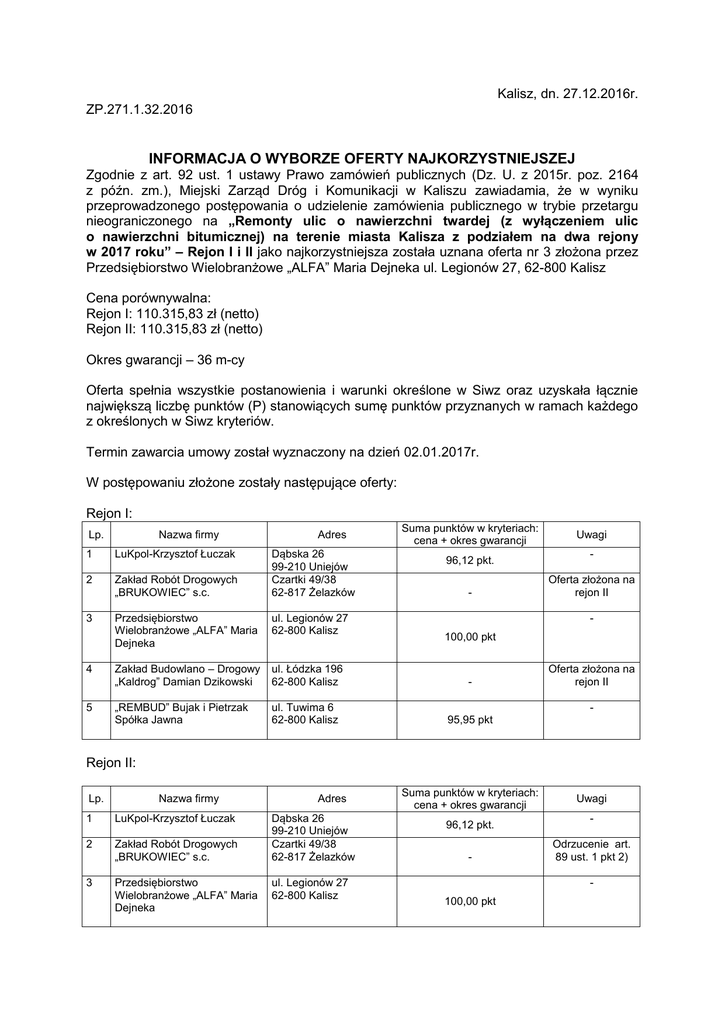 Kalisz, dn. 27.12.2016r. ZP.271.1.32.2016 INFORMACJA O WYBORZE OFERTY NAJKORZYSTNIEJSZEJ Zgodnie z art. 92 ust. 1 ustawy Prawo zamówień publicznych (Dz. U. z 2015r. poz. 2164 z późn. zm.), Miejski Zarząd Dróg i Komunikacji w Kaliszu zawiadamia, że w wyniku przeprowadzonego postępowania o udzielenie zamówienia publicznego w trybie przetargu nieograniczonego na „Remonty ulic o nawierzchni twardej (z wyłączeniem ulic o nawierzchni bitumicznej) na terenie miasta Kalisza z podziałem na dwa rejony w 2017 roku” – Rejon I i II jako najkorzystniejsza została uznana oferta nr 3 złożona przez Przedsiębiorstwo Wielobranżowe „ALFA” Maria Dejneka ul. Legionów 27, 62-800 Kalisz Cena porównywalna: Rejon I: 110.315,83 zł (netto) Rejon II: 110.315,83 zł (netto) Okres gwarancji – 36 m-cy Oferta spełnia wszystkie postanowienia i warunki określone w Siwz oraz uzyskała łącznie największą liczbę punktów (P) stanowiących sumę punktów przyznanych w ramach każdego z określonych w Siwz kryteriów. Termin zawarcia umowy został wyznaczony na dzień 02.01.2017r. W postępowaniu złożone zostały następujące oferty: Rejon I: Lp. Nazwa firmy 1 LuKpol-Krzysztof Łuczak 2 Zakład Robót Drogowych „BRUKOWIEC” s.c. 3 4 5 Adres Dąbska 26 99-210 Uniejów Czartki 49/38 62-817 Żelazków Suma punktów w kryteriach: cena + okres gwarancji 96,12 pkt. - Przedsiębiorstwo Wielobranżowe „ALFA” Maria Dejneka ul. Legionów 27 62-800 Kalisz Zakład Budowlano – Drogowy „Kaldrog” Damian Dzikowski ul. Łódzka 196 62-800 Kalisz - „REMBUD” Bujak i Pietrzak Spółka Jawna ul. Tuwima 6 62-800 Kalisz 95,95 pkt Uwagi Oferta złożona na rejon II - 100,00 pkt Oferta złożona na rejon II - Rejon II: Lp. Nazwa firmy 1 LuKpol-Krzysztof Łuczak 2 Zakład Robót Drogowych „BRUKOWIEC” s.c. 3 Przedsiębiorstwo Wielobranżowe „ALFA” Maria Dejneka Adres Dąbska 26 99-210 Uniejów Czartki 49/38 62-817 Żelazków ul. Legionów 27 62-800 Kalisz Suma punktów w kryteriach: cena + okres gwarancji 96,12 pkt. - Uwagi Odrzucenie art. 89 ust. 1 pkt 2) - 100,00 pkt 4 5 Zakład Budowlano – Drogowy „Kaldrog” Damian Dzikowski ul. Łódzka 196 62-800 Kalisz 97,17 pkt „REMBUD” Bujak i Pietrzak Spółka Jawna ul. Tuwima 6 62-800 Kalisz - - Podpisał /…/ p.o. Dyrektor Miejskiego Zarządu Dróg i Komunikacji w Kaliszu inż. Krzysztof Gałka dn. 27.12.2016r. Oferta złożona na rejon I