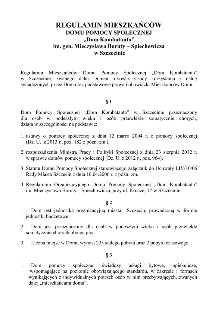 REGULAMIN MIESZKAŃCÓW DOMU POMOCY SPOŁECZNEJ „Dom Kombatanta” im. gen. Mieczysława Boruty – Spiechowicza w Szczecinie Regulamin Mieszkańców Domu Pomocy Społecznej „Dom Kombatanta” w Szczecinie, zwanego dalej Domem określa zasady korzystania z usług świadczonych przez Dom oraz podstawowe prawa i obowiązki Mieszkańców Domu. §1 Dom Pomocy Społecznej „Dom Kombatanta” w Szczecinie przeznaczony dla osób w podeszłym wieku i osób przewlekle somatycznie chorych, działa w szczególności na podstawie: 1. ustawy o pomocy społecznej z dnia 12 marca 2004 r. o pomocy społecznej (Dz. U. z 2013 r., poz. 182 z późn. zm.), 2. rozporządzenia Ministra Pracy i Polityki Społecznej z dnia 23 sierpnia 2012 r. w sprawie domów pomocy społecznej (Dz. U. z 2012 r., poz. 964), 3. Statutu Domu Pomocy Społecznej stanowiącego załącznik do Uchwały LIV/10/06 Rady Miasta Szczecin z dnia 10.04.2006 r. z późn. zm. 4. Regulaminu Organizacyjnego Domu Pomocy Społecznej „Dom Kombatanta” im. Mieczysława Boruty – Spiechowicza, przy ul. Kruczej 17 w Szczecinie. §2 1. Dom jest jednostką organizacyjną miasta jednostki budżetowej. 2. 3. 1. Szczecin, prowadzoną w formie Dom jest przeznaczony dla osób w podeszłym wieku i osób przewlekle somatycznie chorych obojga płci. Liczba miejsc w Domu wynosi 235 stałego pobytu oraz 2 pobytu czasowego. §3 Dom pomocy społecznej świadczy usługi bytowe, opiekuńcze, wspomagające na poziomie obowiązującego standardu, w zakresie i formach wynikających z indywidualnych potrzeb osób w nim przebywających, zwanych dalej „mieszkańcami domu”. 2. 3. 4. 5. 6. 7. Organizacja domu pomocy społecznej, zakres i poziom usług świadczonych przez dom uwzględnia w szczególności: wolność, intymność, godność i poczucie bezpieczeństwa mieszkańców domu oraz stopień ich fizycznej i psychicznej sprawności. Dom funkcjonuje w oparciu o indywidualne potrzeby mieszkańca domu. Zakres usług realizowany w odniesieniu do indywidualnych potrzeb mieszkańca określony jest w Indywidualnym Planie Wsparcia Mieszkańca opracowywanym i realizowanym przez zespół terapeutyczno-opiekuńczy z udziałem mieszkańca. Wydatki związane z zapewnieniem całodobowej opieki mieszkańcom oraz zaspokajaniem ich niezbędnych potrzeb bytowych i społecznych w całości pokrywa dom pomocy społecznej. Dom umożliwia i organizuje mieszkańcom pomoc w korzystaniu ze świadczeń zdrowotnych przysługujących im na podstawie odrębnych przepisów. Dom pokrywa opłaty ryczałtowe i częściową odpłatność do wysokości limitu ceny leków, przewidziane w przepisach o powszechnym ubezpieczeniu zdrowotnym w Narodowym Funduszu Zdrowia. Dom może pokryć wydatki ponoszone na niezbędne usługi pielęgnacyjne w zakresie wykraczającym poza uprawnienia wynikające z przepisów o świadczeniach opieki zdrowotnej finansowanych ze środków publicznych. §4 1. Pobyt w Domu jest odpłatny – wysokość, zasady i tryb odpłatności ustalają odrębne przepisy. 2. Za prawidłowe funkcjonowanie Domu oraz całego personelu odpowiada Dyrektor Domu. 3. Dyrektor reprezentuje Dom na zewnątrz. §5 Zadania Domu 1. Dom powinien zastąpić swoim mieszkańcom dom rodzinny, a atmosfera w nim panująca powinna być nacechowana życzliwością, wyrozumiałością i zaufaniem. 2. Dom świadczy usługi: 1) w zakresie potrzeb bytowych, zapewniając: a) miejsce zamieszkania, b) wyżywienie, c) odzież i obuwie, d) utrzymanie czystości; 2) opiekuńcze, polegające na: a) udzielaniu pomocy w podstawowych czynnościach życiowych, b) pielęgnacji, c) niezbędnej pomocy w załatwianiu spraw osobistych; 3) wspomagające, polegające na: a) umożliwieniu udziału w terapii zajęciowej, b) podnoszeniu sprawności i aktywizowaniu mieszkańców domu, c) umożliwieniu zaspokojenia potrzeb religijnych i kulturalnych, d) zapewnieniu warunków do rozwoju samorządności mieszkańców domu, e) stymulowaniu nawiązywania, utrzymywania i rozwijania kontaktu z rodziną i społecznością lokalną, f) działaniu zmierzającym do usamodzielnienia mieszkańca domu, w miarę jego możliwości, g) pomocy usamodzielniającemu się mieszkańcowi domu w podjęciu pracy, szczególnie mającej charakter terapeutyczny, jeżeli mieszkaniec spełnia warunki do takiego usamodzielnienia, h) zapewnieniu bezpiecznego przechowywania środków pieniężnych i przedmiotów wartościowych, i) finansowaniu mieszkańcowi domu nieposiadającemu własnego dochodu wydatków na niezbędne przedmioty osobistego użytku, w kwocie nieprzekraczającej 30% zasiłku stałego, o którym mowa w art. 37 ust. 2 pkt 1 ustawy o pomocy społecznej, j) zapewnieniu przestrzegania praw mieszkańców domu oraz zapewnieniu mieszkańcom dostępności do informacji o tych prawach, k) sprawnym wnoszeniu i załatwianiu skarg i wniosków mieszkańców domu. 3. Zasady korzystania z usług świadczonych na terenie Domu określone są w załącznikach do niniejszego regulaminu w następującym układzie: Załącznik nr 1. Zasady korzystania z punktu usług fryzjerskich. Załącznik nr 2. Zasady korzystania z usług punktu krawieckiego. Załącznik nr 3. Zasady korzystania z pokoju gościnnego. Załącznik nr 4. Zasady korzystania z usług pralniczych. Załącznik nr 5. Zasady nieplanowanego wyjścia mieszkańców poza teren Domu. Załącznik nr 6. Zasady przyjmowania przedmiotów do magazynu mieszkańców. Załącznik nr 7. Zasady przyjmowania wartościowych depozytów mieszkańców. §6 Prawa mieszkańców Mieszkaniec Domu ma prawo do: 1. godnego traktowania, z poszanowaniem prawa do intymności i poczucia bezpieczeństwa, 2. współdecydowania w sprawach dotyczących swojej osoby, 3. korzystania z wszelkich usług świadczonych przez Dom, 4. organizowania czasu wolnego według własnego uznania, 5. pomocy ze strony pracownika pierwszego kontaktu i pracownika socjalnego w rozwiązywaniu osobistych problemów, 6. praktykowania wyznawanej religii, uczestn