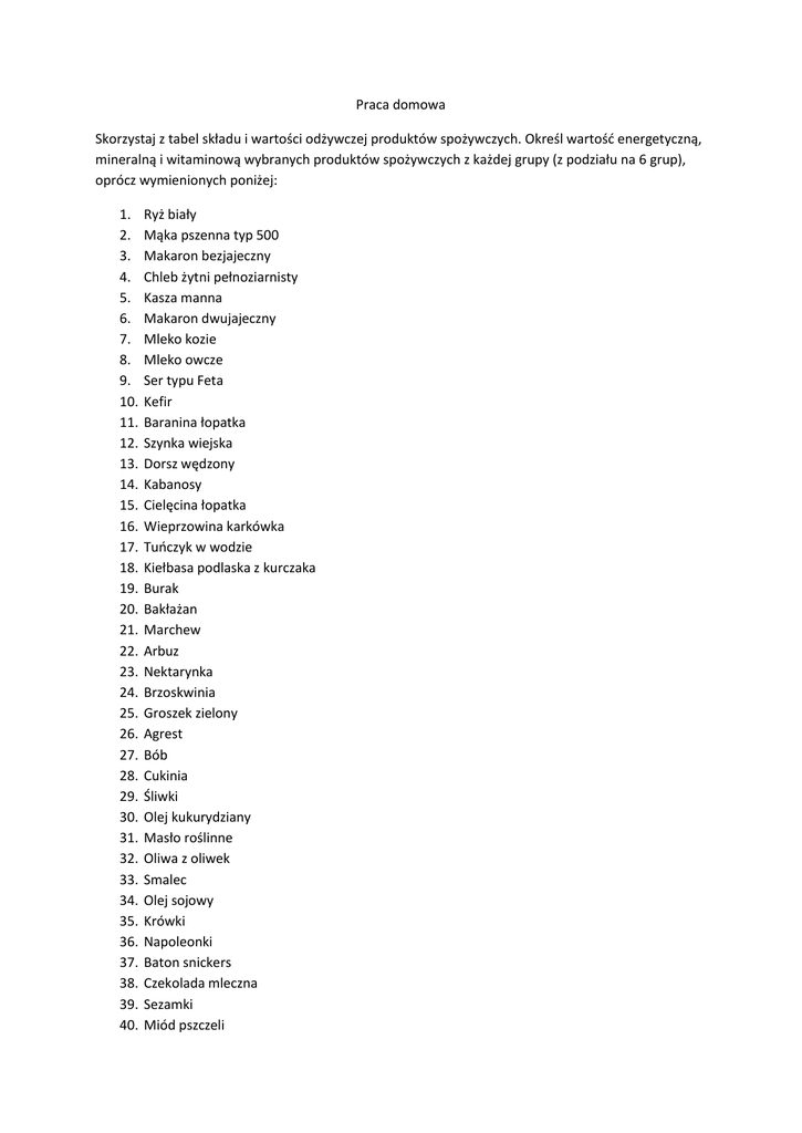 Praca domowa Skorzystaj z tabel składu i wartości odżywczej