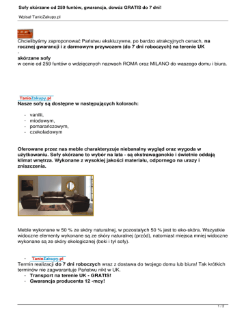 Sofy skórzane od 259 funtów, gwarancja, dowóz GRATIS do 7 dni! Wpisał TanioZakupy.pl Chcielibyśmy zaproponować Państwu ekskluzywne, po bardzo atrakcyjnych cenach, na rocznej gwarancji i z darmowym przywozem (do 7 dni roboczych) na terenie UK skórzane sofy w cenie od 259 funtów o wdzięcznych nazwach ROMA oraz MILANO do waszego domu i biura. Nasze sofy są dostępne w następujących kolorach: - vanilii, miodowym, pomarańczowym, czekoladowym Oferowane przez nas meble charakteryzuje niebanalny wygląd oraz wygoda w użytkowaniu. Sofy skórzane to wybór na lata - są ekstrawaganckie i świetnie oddają klimat wnętrza. Wykonane z wysokiej jakości materiału, odpornego na urazy i zniszczenia. Meble wykonane w 50 % ze skóry naturalnej, w pozostałych 50 % jest to eko-skóra. Wszystkie widoczne elementy wykonane są ze skóry naturalnej (przód), natomiast miejsca mniej widoczne wykonane są ze skóry ekologicznej (boki i tył sofy). Termin realizacji do 7 dni roboczych wraz z dostawa do twojego domu lub biura! Tak krótkich terminów nie zagwarantuje Państwu nikt w UK. - Transport na terenie UK - GRATIS! - Gwarancja producenta 12 -mcy! 1/2 Sofy skórzane od 259 funtów, gwarancja, dowóz GRATIS do 7 dni! Wpisał TanioZakupy.pl Sprawdź na naszej stronie internetowej naszą najnowszą ofertę - kliknij tutaj... Nasze ceny na skórzane sofy wraz z dostawa zaczynają się już od 259 funtów! 2/2