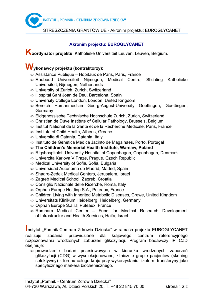 STRESZCZENIA GRANTÓW UE - Akronim projektu: EUROGLYCANET Akronim projektu: EUROGLYCANET Koordynator projektu: Katholieke Universiteit Leuven, Leuven, Belgium. Wykonawcy projektu (kontraktorzy): • Assistance Publique – Hopitaux de Paris, Paris, France • Radboud Universiteit Nijmegen, Medical Centre, Stichting Katholieke Universiteit, Nijmegen, Netherlands • University of Zurich, Zurich, Switzerland • Hospital Sant Joan de Deu, Barcelona, Spain • University College London, London, United Kingdom • Bereich Humanmedizin Georg-August-University Goettingen, Goettingen, Germany • Eidgenossische Technische Hochschule Zurich, Zurich, Switzerland • Christian de Duve Institute of Cellular Pathology, Brussels, Belgium • Institut National de la Sante et de la Recherche Medicale, Paris, France • Institute of Child Health, Athens, Greece • Universita di Catania, Catania, Italy • Instituto de Genetica Medica Jacinto de Magalhaes, Porto, Portugal • The Children’s Memorial Health Institute, Warsaw, Poland • Rigshospitalet, University Hospital of Copenhagen, Copenhagen, Denmark • Univerzita Karlova V Praze, Prague, Czech Republic • Medical University of Sofia, Sofia, Bulgaria • Universidad Autonoma de Madrid, Madrid, Spain • Shaare-Zedek Medical Centers, Jerusalem, Israel • Zagreb Medical School, Zagreb, Croatia • Consiglio Nazionale delle Ricerche, Roma, Italy • Orphan Europe Holding S.A., Puteaux, France • Children Living with Inherited Metabolic Diseases, Crewe, United Kingdom • Universitats Klinikum Heidelberg, Heidelberg, Germany • Orphan Europe S.a.r.l, Puteaux, France • Rambam Medical Center – Fund for Medical Research Development of Infrastructur and Health Services, Haifa, Israel Instytut „Pomnik-Centrum Zdrowia Dziecka” w ramach projektu EUROGLYCANET realizuje zadania przewidziane dla krajowego centrum referencyjnego rozpoznawania wrodzonych zaburzeń glikozylacji. Program badawczy IP CZD obejmuje: • prowadzenie badań przesiewowych w kierunku wrodzonych zaburzeń glikozylacji (CDG) w wyselekcjonowanej klinicznie grupie pacjentów (skrining selektywny) z terenu całego kraju przy wykorzystaniu izoform transferyny jako specyficznego markera biochemicznego. Instytut „Pomnik - Centrum Zdrowia Dziecka” 04-730 Warszawa, Al. Dzieci Polskich 20, T: +48 22 815 70 00 strona 1 z 2 STRESZCZENIA GRANTÓW UE - Akronim projektu: EUROGLYCANET • potwierdzenie albo wykluczenie obecności wrodzonego zaburzenia glikozylacji u pacjentów z nieprawidłowym wzorem izoform transferyny przy użyciu zestawu testów klinicznych i biochemicznych. • kwalifikację pacjentów ze wstępnym rozpoznaniem CDG na badania biochemiczne, molekularne i inne w specjalistycznych laboratoriach partnerów projektu (po konsultacji z ekspertami z ośrodków wiodących projektu oraz zgłoszeniu pacjenta do centralnej bazy danych). • zabezpieczanie materiału biologicznego pacjentów (surowica, DNA, fibroblasty) ze wstępnym rozpoznaniem CDG i jego przesyłanie do specjalistycznych laboratoriów celem ustalenia typu wrodzonego zaburzenia glikozylacji i rozpoczęcia leczenia jeżeli jest ono dostępne. Instytut „Pomnik - Centrum Zdrowia Dziecka” 04-730 Warszawa, Al. Dzieci Polskich 20, T: +48 22 815 70 00 strona 2 z 2