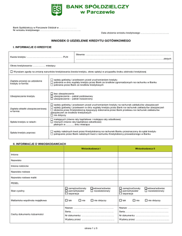Bank Spółdzielczy w Parczewie Oddział w . . . . . . . . . . . . . Nr wniosku kredytowego ………………………………………….. Data złożenia wniosku kredytowego …………………………….. WNIOSEK O UDZIELENIE KREDYTU GOTÓWKOWEGO I. INFORMACJE O KREDYCIE Słownie: ……………………………..…………………….……………………………………… Kwota kredytu: …………….………………………. PLN ………………….………………………………..…………………………………………złotych Okres kredytowania: …………… miesięcy Wyrażam zgodę na zmianę warunków kredytowania (kwota kredytu, okres spłaty) w przypadku braku zdolności kredytowej Zapłata prowizji za udzielenie kredytu w formie: wpłaty gotówką / przelewem przed uruchomieniem kredytu pobrania w dniu wypłaty kredytu przez Bank ze środków zgromadzonych na rachunku w Banku pobrania przez Bank ze środków kredytowych Ubezpieczenie kredytu bez ubezpieczenia ubezpieczenie – pakiet podstawowy ubezpieczenie – pakiet rozszerzony Zapłata składki ubezpieczeniowej w formie: wpłaty gotówką / przelewem przed uruchomieniem kredytu na rachunek zakładu/ów ubezpieczeń wpłaty gotówką / przelewem w dniu wypłaty kredytu przez Bank na rachunek zakładu/ów ubezpieczeń złożenia przez Kredytobiorcę dyspozycji dokonania przez Bank przelewu na rachunek zakładu/ów ubezpieczeń ze środków kredytowych nie dotyczy Spłata kredytu w ratach: malejących (równe raty kapitałowe i malejące raty odsetkowe) równych (równe raty kapitałowo-odsetkowe) płatnych w ………. dniu miesiąca Spłata kredytu poprzez: wpłaty należnych kwot przez Kredytobiorcę na rachunek Banku przeznaczony do spłat kredytu potrącanie przez Bank należnych kwot z rachunku Kredytobiorcy prowadzonego w Banku II. INFORMACJE O WNIOSKODAWCACH Wnioskodawca I Wnioskodawca II Imiona Nazwisko Imiona rodziców Nazwisko rodowe Nazwisko rodowe matki PESEL Stan cywilny zamężna/żonaty panna/kawaler separacja Małżeńska wspólnota majątkowa tak Cechy dokumentu tożsamości nie wdowa/wdowiec rozwiedziona/y nie dotyczy zamężna/żonaty panna/kawaler separacja tak nie wdowa/wdowiec rozwiedziona/y nie dotyczy Nazwa: …………………………………………. Nazwa: ………………………….………………. Seria…………………………………………….. Seria…………………………….……………….. Nr dokumentu: ……………….………………… Nr dokumentu: …………….…….……………… Wydany przez: ................................................ Wydany przez: ................................................. strona 1 z 5 Wnioskodawca I Adres zamieszkania Adres do korespondencji Nr telefonu (do wyboru) Wnioskodawca II Ulica: ………………………….…………………. Ulica: ……………………………………………... Nr domu: ………………….…………………….. Nr domu: …………………………………………. Nr lokalu………………….……………………… Nr lokalu: …………………….…………………… Kod: ……………………………………………... Kod: …………………………….………………… Miejscowość: …………………….……………… Miejscowość………………….………………….. Kraj: ……………………………………………... Kraj: ………………………….…………………… Ulica……...………………………….…………… Ulica……...…………………….….……………… Nr domu: ……...………………………………… Nr domu: ……...…………………….…………… Nr lokalu: ……...……………...………………… Nr lokalu: ……...…………….…………………… Kod……...………….……….…………………… Kod……...………..…………….………………… Miejscowość: ……...…………………………… Miejscowość: …………....……………………… Kraj: ……...……………………………………… Kraj: ……...…………….………………………… stacjonarny…………………………….………… stacjonarny: ……………………………………… komórkowy: ………………………….………….. komórkowy: ……………………….……………… E-mail: Wykształcenie wyższe magisterskie licencjat/inżynier średnie zasadnicze zawodowe podstawowe/gimnazjalne wyższe magisterskie licencjat/inżynier średnie zasadnicze zawodowe podstawowe/gimnazjalne nie posiadam posiadam ................. nie posiadam posiadam ................. Wykonywany zawód Rachunek w ofercie Banku BPS III. INFORMACJE O DOCHODACH I WYDATKACH Wnioskodawca I Wnioskodawca II Całkowity staż pracy (w latach) Okres zatrudnienia u obecnego pracodawcy/czas prowadzenia obecnej dział. gospodarczej (w latach) Informacje o pracodawcy (nazwa, adres) Stanowisko Miesięczny dochód netto: Źródła dochodu właściciel firmy wyższa kadra zarządzająca średnia kadra zarządzająca urzędnik specjalista pracownik inne ..................................... PLN, w tym: umowa o pracę: .................................... emerytura: ............................................ renta: .................................................... zasiłek przedemerytalny: ...................... wolne zawody: ...................................... działalność gospodarcza: ..................... działalność rolnicza: ............................. umowa cywilno-prawna: ....................... umowa najmu: ...................................... umowa o pracę na czas określony do…….................: ............................... odsetki z aktywów finansowych: ............................................................. dywiden