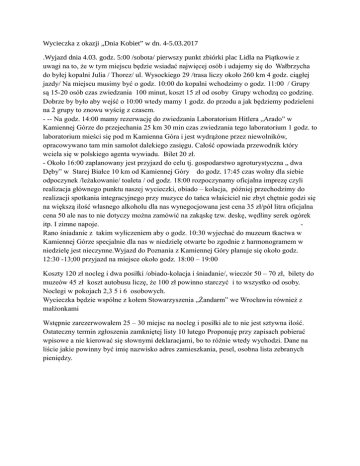 Wycieczka z okazji „Dnia Kobiet” w dn. 4-5.03.2017 .Wyjazd dnia 4.03. godz. 5:00 /sobota/ pierwszy punkt zbiórki plac Lidla na Piątkowie z uwagi na to, że w tym miejscu będzie wsiadać najwięcej osób i udajemy się do Wałbrzycha do byłej kopalni Julia / Thorez/ ul. Wysockiego 29 /trasa liczy około 260 km 4 godz. ciągłej jazdy/ Na miejscu musimy być o godz. 10:00 do kopalni wchodzimy o godz. 11:00 / Grupy są 15-20 osób czas zwiedzania 100 minut, koszt 15 zł od osoby Grupy wchodzą co godzinę. Dobrze by było aby wejść o 10:00 wtedy mamy 1 godz. do przodu a jak będziemy podzieleni na 2 grupy to znowu wyścig z czasem. - -- Na godz. 14:00 mamy rezerwację do zwiedzania Laboratorium Hitlera „Arado” w Kamiennej Górze do przejechania 25 km 30 min czas zwiedzania tego laboratorium 1 godz. to laboratorium mieści się pod m Kamienna Góra i jest wydrążone przez niewolników, opracowywano tam min samolot dalekiego zasięgu. Całość opowiada przewodnik który wciela się w polskiego agenta wywiadu. Bilet 20 zł. - Około 16:00 zaplanowany jest przyjazd do celu tj. gospodarstwo agroturystyczna „ dwa Dęby” w Starej Białce 10 km od Kamiennej Góry do godz. 17:45 czas wolny dla siebie odpoczynek /leżakowanie/ toaleta / od godz. 18:00 rozpoczynamy oficjalna imprezę czyli realizacja głównego punktu naszej wycieczki, obiado – kolacja, później przechodzimy do realizacji spotkania integracyjnego przy muzyce do tańca właściciel nie zbyt chętnie godzi się na większą ilość własnego alkoholu dla nas wynegocjowana jest cena 35 zł/pół litra oficjalna cena 50 ale nas to nie dotyczy można zamówić na zakąskę tzw. deskę, wędliny serek ogórek itp. I zimne napoje. Rano śniadanie z takim wyliczeniem aby o godz. 10:30 wyjechać do muzeum tkactwa w Kamiennej Górze specjalnie dla nas w niedzielę otwarte bo zgodnie z harmonogramem w niedzielę jest nieczynne.Wyjazd do Poznania z Kamiennej Góry planuje się około godz. 12:30 -13;00 przyjazd na miejsce około godz. 18:00 – 19:00 Koszty 120 zł nocleg i dwa posiłki /obiado-kolacja i śniadanie/, wieczór 50 – 70 zł, bilety do muzeów 45 zł koszt autobusu liczę, że 100 zł powinno starczyć i to wszystko od osoby. Noclegi w pokojach 2,3 5 i 6 osobowych. Wycieczka będzie wspólne z kołem Stowarzyszenia „Żandarm” we Wrocławiu również z małżonkami Wstępnie zarezerwowałem 25 – 30 miejsc na nocleg i posiłki ale to nie jest sztywna ilość. Ostateczny termin zgłoszenia zamkniętej listy 10 lutego Proponuję przy zapisach pobierać wpisowe a nie kierować się słownymi deklaracjami, bo to różnie wtedy wychodzi. Dane na liście jakie powinny być imię nazwisko adres zamieszkania, pesel, osobna lista zebranych pieniędzy.