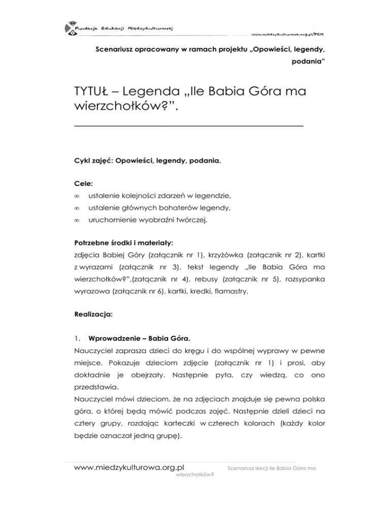 Scenariusz opracowany w ramach projektu „Opowieści, legendy, podania” TYTUŁ – Legenda „Ile Babia Góra ma wierzchołków?”. ___________________________________ Cykl zajęć: Opowieści, legendy, podania. Cele: • ustalenie kolejności zdarzeń w legendzie, • ustalenie głównych bohaterów legendy, • uruchomienie wyobraźni twórczej. Potrzebne środki i materiały: zdjęcia Babiej Góry (załącznik nr 1), krzyŜówka (załącznik nr 2), kartki z wyrazami (załącznik nr 3), tekst legendy „Ile Babia Góra ma wierzchołków?”,(załącznik nr 4), rebusy (załącznik nr 5), rozsypanka wyrazowa (załącznik nr 6), kartki, kredki, flamastry. Realizacja: 1. Wprowadzenie – Babia Góra. Nauczyciel zaprasza dzieci do kręgu i do wspólnej wyprawy w pewne miejsce. Pokazuje dzieciom zdjęcie (załącznik nr 1) i prosi, aby dokładnie je obejrzały. Następnie pyta, czy wiedzą, co ono przedstawia. Nauczyciel mówi dzieciom, Ŝe na zdjęciach znajduje się pewna polska góra, o której będą mówić podczas zajęć. Następnie dzieli dzieci na cztery grupy, rozdając karteczki w czterech kolorach (kaŜdy kolor będzie oznaczał jedną grupę). ________________________________________________________________________________________ www.miedzykulturowa.org.pl wierzchołków? Scenariusz lekcji Ile Babia Góra ma Prosi dzieci, aby usiadły w grupach i rozwiązały krzyŜówkę (załącznik nr 2). Kiedy wszystkie grupy wypełnią całą krzyŜówkę, nauczyciel pyta, jakie jest rozwiązanie. Mówi uczniom, Ŝe to właśnie ta góra będzie tematem ich dzisiejszych zajęć. MoŜe równieŜ zapytać, czy któreś z dzieci słyszało kiedyś o Babiej Górze, a moŜe było na Babiej Górze. 2. Trudne słowa. Nauczyciel mówi dzieciom, Ŝe na temat Babiej Góry istnieją róŜne legendy i opowieści. Są one jednak bardzo stare i niektóre słowa w nich uŜywane mogą obecnie wydawać się trudne i często niezrozumiałe. Dlatego proponuje dzieciom, aby spróbowały odgadnąć niektóre słowa z regionu Babiej Góry. Na jednej połowie tablicy przypina kartki z trudnymi wyrazami, a na drugiej kartki z ich tłumaczeniami (załącznik nr 3). Prosi dzieci, aby dokładnie przeczytały wyrazy na kartkach, a następnie spróbowały je do siebie dopasować. Kiedy wszystkie wyrazy zostaną połączone, dzieci razem z nauczycielem czytają na głos trudne wyrazy oraz ich tłumaczenia. 3. Legenda „Ile Babia Góra ma wierzchołków?”. Nauczyciel mówi dzieciom, Ŝe za chwilę przeczyta opowieść pod tytułem „Ile Babia Góra ma wierzchołków?”. Prosi uczniów, aby dokładnie słuchali i postarali się zapamiętać jak najwięcej szczegółów. Nauczyciel czyta treść legendy (załącznik nr 4). Po przeczytaniu, zadaje dzieciom pytania do tekstu: - Gdzie przybywali studenci i ilu ich było? - Co zrobili studenci gdy przyszła noc? - Kto pojawił się o północy przy ognisku? - O czym głośno rozmyślała potwora? - W jaki sposób zakończyła się legenda i ile było wierzchołków? Po udzieleniu przez uczniów odpowiedzi na wszystkie pytania, nauczyciel rozdaje dzieciom rebusy (załącznik nr 5) i prosi, aby je rozwiązać. Po wspólnym ustaleniu rozwiązania rebusów, nauczyciel ________________________________________________________________________________________ www.miedzykulturowa.org.pl wierzchołków? Scenariusz lekcji Ile Babia Góra ma mówi, Ŝe student i potwora to główne postacie w przeczytanej legendzie. Pyta dzieci, dlaczego student i potwora są tak waŜni. Nauczyciel proponuje dzieciom, aby raz jeszcze odtworzyły nowopoznaną legendę. Prosi dzieci, aby usiadły w grupach (takich jak poprzednio) i rozdaje kaŜdej grupie rozsypanki wyrazowe (załącznik nr 6). KaŜda grupa układa zdanie, a następnie wszyscy wspólnymi siłami ustalają kolejność zdarzeń. Nauczyciel moŜe wszystkie zdania w odpowiedniej kolejności przyczepić na tablicy. 4. Tworzenie potwory. Nauczyciel rozmawia z dziećmi na temat wyglądu potwory. Pyta, jak mogła ona wyglądać. Proponuje dzieciom, aby kaŜdy narysował na kartce taką potworę, jaką – według niego – mógł spotkać student na Babiej Górze. ________________________________________________________________________________________ www.miedzykulturowa.org.pl wierzchołków? Scenariusz lekcji Ile Babia Góra ma Załącznik nr 1 – zdjęcia Babiej Góry http://pl.wikipedia.org/w/index.php?title=Plik:Babia_G%C3%B3ra_g%C3%B3rne_partie.jpg&filetimesta mp=20060927230540 http://pl.wikipedia.org/w/index.php?title=Plik:Babia_G%C3%B3ra_BW282.JPG&filetimestamp=20100209225929 ________________________________________________________________________________________ www.miedzykulturowa.org.pl wierzchołków? Scenariusz lekcji Ile Babia Góra ma Załącznik nr 3 – kartki z wyrazami wierszki zrachować boch rozlegli potwora jach kiery jeny ________________________________________________________________________________________ www.miedzykulturowa.org.pl wierzchołków? Scenariusz lekcji Ile Babia Góra ma kole chnet nakładli nie naszła policzyć wierzchołki szczyty połoŜyć stwór potwór ________________________________________________________________________________________ www.miedzykulturowa.org.pl wierzchołków? Scenariusz lekcji Ile Babia Góra ma jak bo nie znalazła która tylko przy szybko ________________________________________________________________________________________ www.miedzykulturowa.org.pl wierzchołków? Scenariusz lekcji Ile Babia Góra ma Załącznik nr 4 ILE BABIA GÓRA MA WIERZCHOŁKÓW? W Polsce na Babiej Górze jest moc wierszków, co ich Ŝaden nie mógł porachować. A tam straszyło. Jakby tam był kto na noc został, tak go zamordowało. Posłali dwanaście studentów, Ŝe ich oni muszą zrachować, a jak ich nie zrachują, Ŝe karę dostaną. Szli aŜ tam przyszli i chodzili przez dzień a rachowali. Ale nie mogli porachować. Ścignęła ich noc i oni tam musieli zanocować. Ale tam nie było