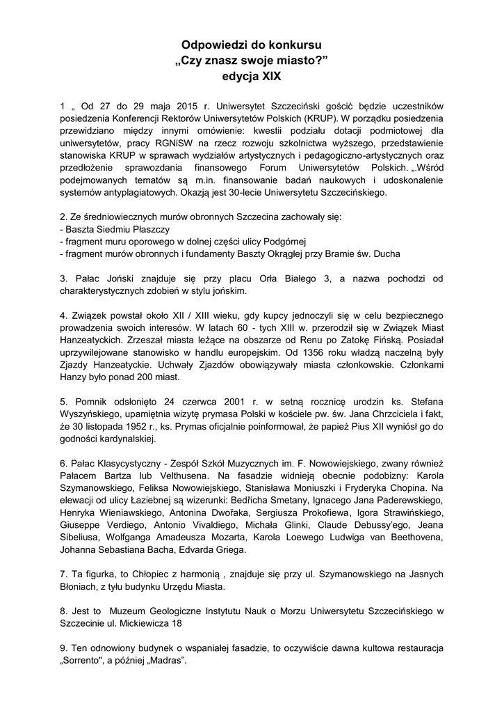 Odpowiedzi do konkursu „Czy znasz swoje miasto?” edycja XIX 1 „ Od 27 do 29 maja 2015 r. Uniwersytet Szczeciński gościć będzie uczestników posiedzenia Konferencji Rektorów Uniwersytetów Polskich (KRUP). W porządku posiedzenia przewidziano między innymi omówienie: kwestii podziału dotacji podmiotowej dla uniwersytetów, pracy RGNiSW na rzecz rozwoju szkolnictwa wyższego, przedstawienie stanowiska KRUP w sprawach wydziałów artystycznych i pedagogiczno-artystycznych oraz przedłożenie sprawozdania finansowego Forum Uniwersytetów Polskich. „.Wśród podejmowanych tematów są m.in. finansowanie badań naukowych i udoskonalenie systemów antyplagiatowych. Okazją jest 30-lecie Uniwersytetu Szczecińskiego. 2. Ze średniowiecznych murów obronnych Szczecina zachowały się: - Baszta Siedmiu Płaszczy - fragment muru oporowego w dolnej części ulicy Podgórnej - fragment murów obronnych i fundamenty Baszty Okrągłej przy Bramie św. Ducha 3. Pałac Joński znajduje się przy placu Orła Białego 3, a nazwa pochodzi od charakterystycznych zdobień w stylu jońskim. 4. Związek powstał około XII / XIII wieku, gdy kupcy jednoczyli się w celu bezpiecznego prowadzenia swoich interesów. W latach 60 - tych XIII w. przerodził się w Związek Miast Hanzeatyckich. Zrzeszał miasta leżące na obszarze od Renu po Zatokę Fińską. Posiadał uprzywilejowane stanowisko w handlu europejskim. Od 1356 roku władzą naczelną były Zjazdy Hanzeatyckie. Uchwały Zjazdów obowiązywały miasta członkowskie. Członkami Hanzy było ponad 200 miast. 5. Pomnik odsłonięto 24 czerwca 2001 r. w setną rocznicę urodzin ks. Stefana Wyszyńskiego, upamiętnia wizytę prymasa Polski w kościele pw. św. Jana Chrzciciela i fakt, że 30 listopada 1952 r., ks. Prymas oficjalnie poinformował, że papież Pius XII wyniósł go do godności kardynalskiej. 6. Pałac Klasycystyczny - Zespół Szkół Muzycznych im. F. Nowowiejskiego, zwany również Pałacem Bartza lub Velthusena. Na fasadzie widnieją obecnie podobizny: Karola Szymanowskiego, Feliksa Nowowiejskiego, Stanisława Moniuszki i Fryderyka Chopina. Na elewacji od ulicy Łaziebnej są wizerunki: Bedřicha Smetany, Ignacego Jana Paderewskiego, Henryka Wieniawskiego, Antonina Dwořaka, Sergiusza Prokofiewa, Igora Strawińskiego, Giuseppe Verdiego, Antonio Vivaldiego, Michała Glinki, Claude Debussy’ego, Jeana Sibeliusa, Wolfganga Amadeusza Mozarta, Karola Loewego Ludwiga van Beethovena, Johanna Sebastiana Bacha, Edvarda Griega. 7. Ta figurka, to Chłopiec z harmonią , znajduje się przy ul. Szymanowskiego na Jasnych Błoniach, z tyłu budynku Urzędu Miasta. 8. Jest to Muzeum Geologiczne Instytutu Nauk o Morzu Uniwersytetu Szczecińskiego w Szczecinie ul. Mickiewicza 18 9. Ten odnowiony budynek o wspaniałej fasadzie, to oczywiście dawna kultowa restauracja „Sorrento", a później „Madras”. 10. Fontanna znajduje się przy ul. Karola Szymanowskiego, za gmachem Urzędu Miejskiego. Misa w kształcie muszli, u styku misy z cokołem jest paszcza ryby (może to być sum). Na cokole stoi nasz Chłopiec z harmonią z pytania 7. Ciekawe zestawienie.