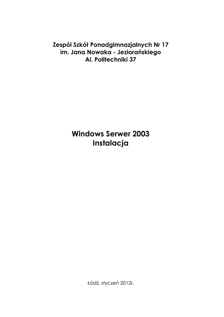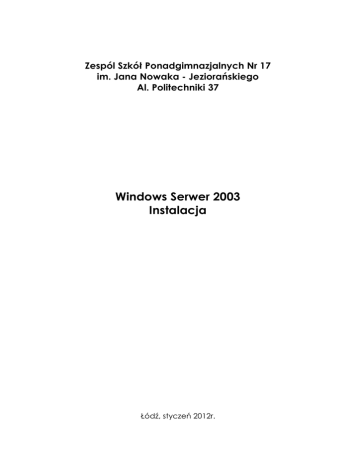 Zespól Szkół Ponadgimnazjalnych Nr 17 im. Jana Nowaka - Jeziorańskiego Al. Politechniki 37 Windows Serwer 2003 Instalacja Łódź, styczeń 2012r. Zespól Szkół Ponadgimnazjalnych Nr 17 im. Jana Nowaka - Jeziorańskiego Al. Politechniki 3 SPIS TREŚCI Strona Wstęp …………………………………………………………………… ............................ 3 INSTALOWANIE SYSTEMU WINDOWS SERWER 2003 Przygotowanie instalacji serwera ……………………………… .…………………….4 1.1. Minimalne wymagania sprzętowe ………………… ....………………..……….4 1.2. Przygotowanie potrzebnych informacji …………… .....……………………….4 Instalacja systemu Windows Serwer 2003 R2 ……… ................. ……….………….5 2.1. Zaproszenie do instalacji ……….………….....................………………………..5 2.2. Instalacja nowego systemu lub naprawa istniejącego..... ………………….5 2.3. Zapoznanie się z licencją oprogramowania ….……………………………….6 2.4. Podział dysku na partycje ...........................................…………………..……..6 2.5. Formatowanie partycji … ......................................………………………………7 2.5.1. Rodzaj ……… ......................................................................…………………….7 2.5.2. System plików …… ........................................................... ……………………..7 2.6. Opcje regionalne i językowe ..................................... ………………………..…8 2.7. Personalizacja oprogramowania … .............................………………………..9 2.8. Wybór trybu licencjonowania … ............................... ……………….………….9 2.9. Wybór nazwy komputera i hasła administratora .......... …………………….10 2.10. Zmiana daty i godziny …………………………………..… ......……………….10 2.11. Zmiana ustawień sieciowych ……………………... ……………………..……11 2.11.1. Ustawienia typowe ………………………………………. ….………………..11 2.11.2. Ustawienia niestandardowe…..……………………… .....…..……………..11 2.12. Podłączenie do domeny lub grupy roboczej ……… . …………………….11 2.13. Zakończenie instalacji ………………………… . …………………………..…..12 2.14. Logowanie …………….………… ............................... …………………………12 2.15. Aktualizacja zabezpieczeń ……… ................................ …………………….13 2.16. Zarządzanie rolami …….……… ...................................……………………….14 2.17. Inne metody instalacji ………… ..................................... …………………….14 Podsumowanie i wnioski ………………………………………… ...... ………..…..…15 Spis literatury …………………………… ...........……………………………………..…15 2 Zespól Szkół Ponadgimnazjalnych Nr 17 im. Jana Nowaka - Jeziorańskiego Al. Politechniki 3 Wstęp Celem pracy jest instalacja systemu operacyjnego Windows Obecnie jest dostępna wersja Windows Serwer 2008, w pracy opisana została instalacja dostępnej mi wersji 2003 R2. Windows Serwer 2003 jest pełnym sieciowym systemem operacyjnym pracującym jako: - Serwer plików i drukowania - umożliwia dostęp do plików danych i kontroluje dostęp do wielu drukarek. - Serwer WWW - służy do przechowywania stron WWW i może też tworzyć zespoły serwerów - Serwer aplikacji – dołączone aplikacje tworzą usługi terminalowe i serwerowe jak DNS (system nazw Domain Name System)i DHCP (dynamiczne przydzielanie adresów Dynamic Host Configuration Protocol) - Windows .Net Aplication Host – odgrywanie roli systemu macierzystego dla Windows .NET Framework Wersje systemu Windows Serwer2003 Windows Serwer2003 Web Edition – system dla serwerów WWW. Windows Serwer2003 Standard Edition – typowa dla serwera plików, drukarek, infrastruktury (DHCP, DNS itp.) i kontrolera domeny. Windows Serwer2003 Enterprise Edition – dla systemów serwerowych o dużych wymaganiach sprzętowych (do 8 procesorów 64 bitowych) Windows Serwer2003 Datacenter dedykowanymi systemami. 3 Edition – duże organizacje z Zespól Szkół Ponadgimnazjalnych Nr 17 im. Jana Nowaka - Jeziorańskiego Al. Politechniki 3 INSTALOWANIE SYSTEMU WINDOWS SERWER 2003 1. Przygotowanie instalacji serwera 1.1. Minimalne wymagania sprzętowe Tabela 1. Wymagania Standard Server Enterprise Server 133 MHz 133 MHz dla procesor. x86 733 MHz dla procesor. Itanium Zalecana szybkość CPU 550 MHz 733 MHz Minimalna pamięć RAM 128 MB 128 MB Zalecana pamięć RAM 256 MB 256 MB Maksymalna pamięć RAM 4 GB 32 GB dla procesorów x86 64 GB dla Itanium Maksymalna liczba obsługiwanych procesorów do 4 do 8 Miejsce na dysku wymagane na instalację 1,5 GB 2,0 GB dla Itanium_ Minimalna szybkość CPU 1.2. Przygotowanie potrzebnych informacji: 1.2.1. Nazwa komputera – unikalna w sieci do 15 znaków, duże i małe litery cyfry. 1.2.2. Nazwa domeny do której będzie podłączony serwer, lub grupa robocza. 1.2.3. Adres IP – statyczny lub dynamiczny. Dla serwera raczej statyczny. 4 Zespól Szkół Ponadgimnazjalnych Nr 17 im. Jana Nowaka - Jeziorańskiego Al. Politechniki 3 2. Instalacja systemu Windows Serwer 2003 R2 System instalujemy z płyt CD. Z płyty Nr 1 – system, z drugiej dodatki. 2.1. Zaproszenie do instalacji 2.2. Instalacja nowego systemu lub naprawa istniejącego Wybrana instalacja nowego(ENTER). 5 Zespól Szkół Ponadgimnazjalnych Nr 17 im. Jana Nowaka - Jeziorańskiego Al. Politechniki 3 2.3. Zapoznanie się z licencją oprogramowania Zgodę można wyrazić (klawisz F8) bez konieczności przewijania całego tekstu 2.4. Podział