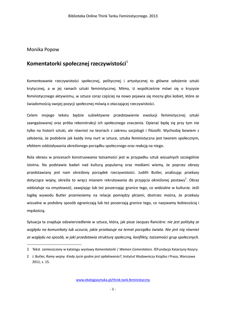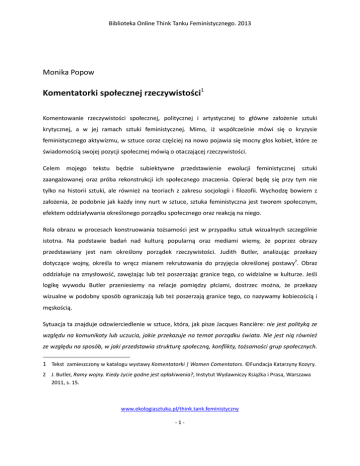 Biblioteka Online Think Tanku Feministycznego. 2013 Monika Popow Komentatorki społecznej rzeczywistości1 Komentowanie rzeczywistości społecznej, politycznej i artystycznej to główne założenie sztuki krytycznej, a w jej ramach sztuki feministycznej. Mimo, iż współcześnie mówi się o kryzysie feministycznego aktywizmu, w sztuce coraz częściej na nowo pojawia się mocny głos kobiet, które ze świadomością swojej pozycji społecznej mówią o otaczającej rzeczywistości. Celem mojego tekstu będzie subiektywne przedstawienie ewolucji feministycznej sztuki zaangażowanej oraz próba rekonstrukcji ich społecznego znaczenia. Opierać będę się przy tym nie tylko na historii sztuki, ale również na teoriach z zakresu socjologii i filozofii. Wychodzę bowiem z założenia, że podobnie jak każdy inny nurt w sztuce, sztuka feministyczna jest tworem społecznym, efektem oddziaływania określonego porządku społecznego oraz reakcją na niego. Rola obrazu w procesach konstruowania tożsamości jest w przypadku sztuk wizualnych szczególnie istotna. Na podstawie badań nad kulturą popularną oraz mediami wiemy, że poprzez obrazy przedstawiany jest nam określony porządek rzeczywistości. Judith Butler, analizując przekazy dotyczące wojny, określa to wręcz mianem rekrutowania do przyjęcia określonej postawy2. Obraz oddziałuje na zmysłowość, zawężając lub też poszerzając granice tego, co widzialne w kulturze. Jeśli logikę wywodu Butler przeniesiemy na relacje pomiędzy płciami, dostrzec można, że przekazy wizualne w podobny sposób ograniczają lub też poszerzają granice tego, co nazywamy kobiecością i męskością. Sytuacja ta znajduje odzwierciedlenie w sztuce, która, jak pisze Jacques Rancière: nie jest polityką ze względu na komunikaty lub uczucia, jakie przekazuje na temat porządku świata. Nie jest nią również ze względu na sposób, w jaki przedstawia strukturę społeczną, konflikty, tożsamości grup społecznych. 1 Tekst zamieszczony w katalogu wystawy Komentatorki | Women Comentators. ©Fundacja Katarzyny Kozyry. 2 J. Butler, Ramy wojny. Kiedy życie godne jest opłakiwania?, Instytut Wydawniczy Książka i Prasa, Warszawa 2011, s. 15. www.ekologiasztuka.pl/think.tank.feministyczny -1- Biblioteka Online Think Tanku Feministycznego. 2013 Sztuka jest polityką przez sam dystans przybierany wobec swoich funkcji, przez wprowadzany typ czasu oraz przestrzeni, przez sposób w jaki dzieli ten czas i zaludnia tę przestrzeń3. Sztuka jako obszar polityczny polega na ustanawianiu widzialności i niewidzialności, na wprowadzaniu nowych podmiotów i przedmiotów, uwidacznianiu tego, co nie było widoczne oraz ujmowaniu jako istoty mówiące tych, którzy byli postrzegani jako hałaśliwe zwierzęta4 Sztuka jest zatem przestrzenią, w której zachodzi walka o określony obraz świata, o to co i kto jest w nim widoczny, kto natomiast nie. Każde działanie artystyczne może modyfikować ustanowiony obraz świata. I o to również toczy się gra. Komentarz polityczny w sztuce feministycznej Komentowanie, opiniowanie, bycie ekspertką nie było przez stulecia w Europie rolą kulturowo przypisywaną kobietom. Podobnie jak w przypadku artysty, rola komentatora zarezerwowana była dla mężczyzn, zwłaszcza tych o wysokim statusie społecznym. Brak dostępu do edukacji formalnej wykluczał kobiety zarówno z posiadania wiedzy naukowej, jak i uprawiania sztuki. Kobiety wykształcone, posiadające wiedzę, czy specjalistyczne umiejętności do XIX wieku stanowiły odosobnione przypadki. Szeroki napływ kobiet do świata nauki i sztuki datuje się na drugą połowę XIX wieku wraz ze zwiększającym się dostępem do kształcenia uniwersyteckiego, w tym do szkół artystycznych. Rozwój kobiecego komentowania rzeczywistości w filozofii i sztuce również przypada w Europie na koniec XIX wieku. Podobnie działo się na ziemiach polskich, gdzie kobiety, poza nielicznymi wyjątkami, studiować zaczęły dopiero pod koniec XIX wieku. Od lat 70. XIX wieku zaczęły pojawiać się prywatne kursy zawodowe rzemiosła artystycznego dla kobiet. W Warszawie w tym czasie istniało kilkanaście takich szkół. Powstawały również specjalne kursy. Najbardziej znanymi były istniejące w latach 1876-1901 kursy dla kobiet przy Szkole Rysunkowej Wojciecha Gersona w Warszawie oraz Wydział Artystyczny na Wyższych Kursach, założony w Krakowie w 1868 r., który ukończyła między innymi Olga Boznańska. Niewątpliwie dostęp do edukacji uniwersyteckiej i artystycznej jest w Europie oraz w Stanach Zjednoczonych zasługą ruchu emancypacji kobiet, a więc ówczesnych aktywistek, które chcąc uzyskać 3 J. Rancière, Estetyka jako polityka, Wydawnictwo Krytyki Politycznej, Warszawa 2007, s. 24. 4 Tamże, s. 25. www.ekologiasztuka.pl/think.tank.feministyczny -2- Biblioteka Online Think Tanku Feministycznego. 2013 swoje cele polityczne, musiały oddziaływać na opinię publiczną. Nie był to rzecz jasna dostęp nieograniczony. Dotyczył kobiet białych, z klasy średniej i wyższej, które jako pierwsze weszły do świata nauki i sztuki. Pomimo tych ograniczeń otwarcie kształcenia akademickiego oraz artystycznego dla kobiet spowodowało gwałtowny rozwój sztuki kobiet, a w późniejszym czasie, w drugiej połowie XX wieku, sztuki feministycznej. Nieodłącznym jej elementem było komentowanie rzeczywistości społecznej pod kątem sytuacji kobiet. Gdy w 1965 r. Yoko Ono podczas performance’u Cut Piece poprosiła widzów, aby nożyczkami odcięli po kawałku jej ubranie, pokazała m.in. czym jest bierność kobiet w kulturze, a także jak konstruowana jest ich seksualność. Podobnie, gdy w 1970 r. artystki skupione wokół WAR (!Women Art Revolution) protestowały przeciwko dyskryminacji kobiet w świecie sztuki, ich celem była interwencja oraz zmiana zastanej, patriarchalnej rzeczywistości. Biorąc pod uwagę zagadnienie komentarza politycznego, istotnym pu