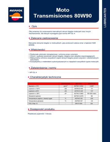 ■ Opis Olej smarowy do smarowania manualnych skrzyń biegów motocykli oraz innych mechanizmów, dla których wymagana jest norma API GL-4. ■ Zalecane zastosowania Manualne skrzynie biegów w motocyklach, gdy producent zaleca smar o lepkości SAE 80W90. ■ Właściwości Doskonałe zdolności obciążeniowe i ochrona przez zużyciem. Chroni i wydłuża żywotność skrzyń biegów, biegów oraz układów wspomagających. Maksymalna ochrona wszystkich części skrzyni biegów przed zużyciem i ekstremalnymi warunkami. Kompatybilny z materiałami wykorzystywanymi w napędach wszystkich typów motocykli. ■ Zatwierdzenia i normy • API GL-4 ■ Charakterystyki techniczne JEDNOSTKA Gęstość w 15⁰C g/cm 3 METODA WARTOŚĆ ASTM D 4052 0,897 Lepkość w 100⁰C cSt ASTM D 445 14 Lepkość w 40⁰C cSt ASTM D 445 137 Lepkość w -26⁰C cP ASTM D 2983 150 000 maks. Wskaźnik lepkości - ASTM D 2270 99 Temperatura zapłonu, otwarty tygiel ⁰C ASTM D 92 230 Temperatura płynięcia ⁰C ASTM D 97 -33 - DIN 51354 Zal. FZG, Etap 12 ■ Dostępność produktu Plastikowe pojemniki 1-litrowe.