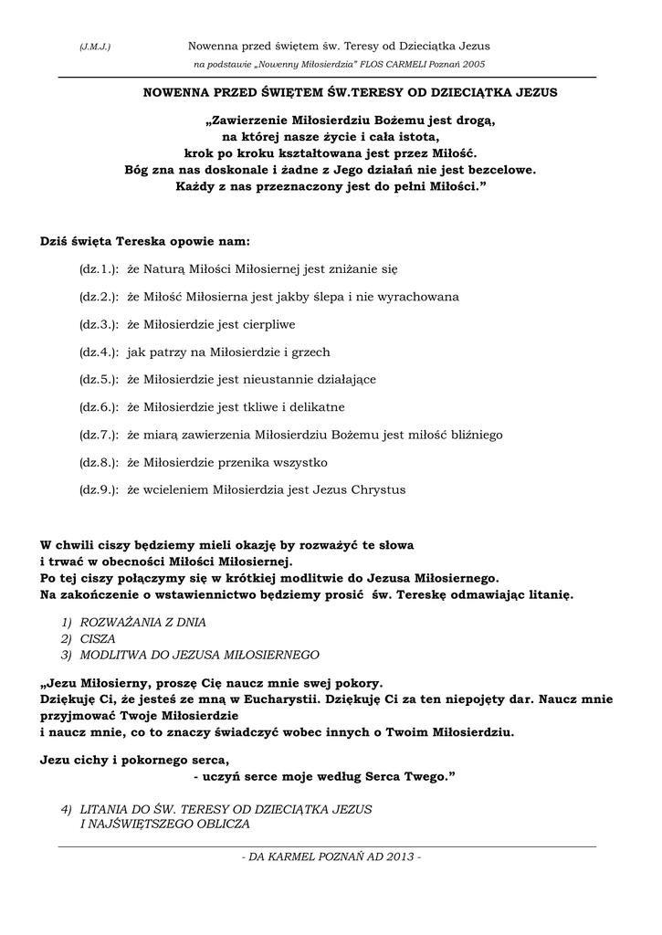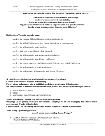 (J.M.J.) Nowenna przed świętem św. Teresy od Dzieciątka Jezus na podstawie „Nowenny Miłosierdzia” FLOS CARMELI Poznań 2005 NOWENNA PRZED ŚWIĘTEM ŚW.TERESY OD DZIECIĄTKA JEZUS „Zawierzenie Miłosierdziu Bożemu jest drogą, na której nasze życie i cała istota, krok po kroku kształtowana jest przez Miłość. Bóg zna nas doskonale i żadne z Jego działań nie jest bezcelowe. Każdy z nas przeznaczony jest do pełni Miłości.” Dziś święta Tereska opowie nam: (dz.1.): że Naturą Miłości Miłosiernej jest zniżanie się (dz.2.): że Miłość Miłosierna jest jakby ślepa i nie wyrachowana (dz.3.): że Miłosierdzie jest cierpliwe (dz.4.): jak patrzy na Miłosierdzie i grzech (dz.5.): że Miłosierdzie jest nieustannie działające (dz.6.): że Miłosierdzie jest tkliwe i delikatne (dz.7.): że miarą zawierzenia Miłosierdziu Bożemu jest miłość bliźniego (dz.8.): że Miłosierdzie przenika wszystko (dz.9.): że wcieleniem Miłosierdzia jest Jezus Chrystus W chwili ciszy będziemy mieli okazję by rozważyć te słowa i trwać w obecności Miłości Miłosiernej. Po tej ciszy połączymy się w krótkiej modlitwie do Jezusa Miłosiernego. Na zakończenie o wstawiennictwo będziemy prosić św. Tereskę odmawiając litanię. 1) ROZWAŻANIA Z DNIA 2) CISZA 3) MODLITWA DO JEZUSA MIŁOSIERNEGO „Jezu Miłosierny, proszę Cię naucz mnie swej pokory. Dziękuję Ci, że jesteś ze mną w Eucharystii. Dziękuję Ci za ten niepojęty dar. Naucz mnie przyjmować Twoje Miłosierdzie i naucz mnie, co to znaczy świadczyć wobec innych o Twoim Miłosierdziu. Jezu cichy i pokornego serca, - uczyń serce moje według Serca Twego.” 4) LITANIA DO ŚW. TERESY OD DZIECIĄTKA JEZUS I NAJŚWIĘTSZEGO OBLICZA - DA KARMEL POZNAŃ AD 2013 - (J.M.J.) Nowenna przed świętem św. Teresy od Dzieciątka Jezus na podstawie „Nowenny Miłosierdzia” FLOS CARMELI Poznań 2005 Dzień 1: Naturą Miłości Miłosiernej jest zniżanie się Miłosierdzie Boże z natury swej pochyla się nad nędzą swych stworzeń, aby uzupełniać ich braki, podnosić je i przemieniać w siebie. Jego potęga i wielkość tym bardziej się ujawnia, im bardziej Bóg zniża się do swych stworzeń. Święta Teresa przepięknie o tym opowiada: Zrozumiałam także, że miłość Naszego Pana objawia się równie dobrze w najprostszej duszy, która w niczym nie opiera się Jego łasce, jak i w duszy najbardziej wzniosłej, gdyż w istocie właściwością miłości jest uniżenie się, gdyby wszystkie dusze były podobne do dusz Świętych doktorów, którzy oświecili Kościół jasnością swej doktryny, wydaje się, że Dobry Bóg nie zszedłby dość nisko, przychodząc do ich serca, ale On stworzył dziecko, które niczego nie umie i jedynie cicho kwili, On stworzył biednego dzikusa, który za przewodnika ma jedynie prawo natury i właśnie aż do ich serc raczył On uniżać się, to właśnie są Jego polne kwiaty, których prostota Go zachwyca… Schodząc w ten sposób, Dobry Bóg pokazuje swoją nieskończoną wielkość. Tak samo jak słońce równocześnie ogrzewa cedry i każdy mały kwiatek, jak gdyby był on sam na ziemi, tak samo Nasz Pan zajmuje się każdą poszczególną duszą, jakby nie miała do siebie podobnych i jak w przyrodzie wszystkie pory roku są ułożone w taki sposób, ze sprawiają, iż w wyznaczonym dniu rozkwita najbardziej uboga stokrotka, tak samo wszystko odpowiada dobru każdej duszy. (A 2v-3r) Od razu, pierwszego dnia wypływamy na głębię. Rozważamy pokorę Miłosiernego Boga, która zachwyca Teresę. Tajemnicę ZNIŻANIA SIĘ, UMNIEJSZANIA, CZY MALEŃKOŚCI BOGA, kontempluje Ona w misterium WCIELENIA, MĘKI I EUCHARYSTII. W tych trzech zwierciadłach ogląda i uczy się MĄDROŚCI MIŁOWANIA. Tutaj znajduje się źródło chrześcijańskiego życia. Teresa odkrywa w misterium Chrystusa, że On istniejąc w postaci Bożej, nie korzysta z żadnej możliwości, by ujawnić swą boską chwałę, ale z miłości do nas ukrywa swój blask i upodabnia się do nas we wszystkim, z wyjątkiem grzechu. Wcielenie i życie ukryte objawia ogrom miłości Boga, który wybiera bycie maleńkim i ubogim. Dlatego Teresa napisze na pożegnanie do o. Bellière: Nie mogę się lękać Boga, który dla mnie stał się tak mały… kocham Go!... ponieważ On jest tylko miłością i miłosierdziem! (LT 266) Pokory i uniżenia możemy uczyć się od naszego Boga. Można powiedzieć, że wszystko co dalej podejmiemy w tej naszej drodze, jest tajemnicą uniżenia i niezwykłej hojności Boga, który na wiele sposobów pragnie okazać nam miłość, szanując jednak naszą wolność. - DA KARMEL POZNAŃ AD 2013 - (J.M.J.) Nowenna przed świętem św. Teresy od Dzieciątka Jezus na podstawie „Nowenny Miłosierdzia” FLOS CARMELI Poznań 2005 Dzień 2: Miłość Miłosierna jest jakby ślepa i nie wyrachowana Tak wielkie uniżenie Boga ma swoje konsekwencje. Przyglądając się Chrystusowi w Ewangelii wraz z Teresą dostrzegamy, że właściwością Miłości (Bożej) jest zniżanie się. Tak aby Miłość była w pełni zaspokojona, mówi Teresa, trzeba, by uniżała się do nicości i żeby tę nicość przekształciła w ogień… (1Krl 18.38) (M 3v) – czyli nas! Nasze grzechy, słabości i wszystko, co w nas znajduje Bóg, chce przemienić w miłość! Bóg więc, widząc naszą słabość, nie tylko nie zraża się naszymi upadkami, lecz jest przez nie niejako przyciągany. Pochyla się nad nami i podnosi nas, zniża się aż do nicości, aż do głębi naszej słabości, oczyszcza i podnosi przemieniając dusze w ogień Bożej Miłości. Im niżej schodzi człowiek, upadlając swe życie i godność, tym niżej schodzi Miłosierdzie Boga, by człowieka ocalić i przebóstwić. To pragnienie miłowania swych stworzeń jest w Bogu tak wielkie, iż czyni Go w pewnym sensie ślepym, co dla Teresy jest synonimem miłosierdzia. Pewnej nowicjuszce, która nie była pewna, czy Jezus jest 
