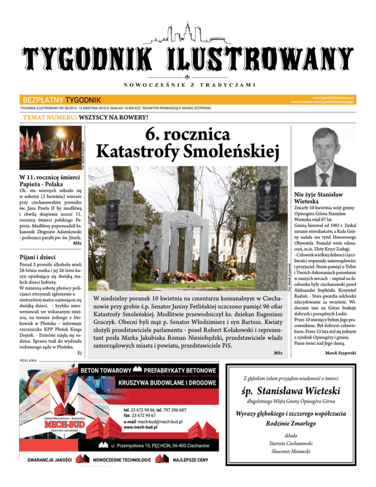 bezpłatny tygodnik www.tygodnikilustrowany.pl www.facebook.com/tygodnikilustrowanypl TYGODNIK ILUSTROWANY NR 58/2016. 12 KWIETNIA 2016 R. NAKŁAD: 10.000 EGZ. REDAKTOR PROWADZĄCY: MAREK SZYPERSKI. TEMAT NUMERU: WSZYSCY NA ROWERY! 6. rocznica Katastrofy Smoleńskiej W 11. rocznicę śmierci Papieża - Polaka Ok. stu wiernych zebrało się w sobotni (2 kwietnia) wieczór przy ciechanowskim pomniku św. Jana Pawła II by modlitwą i chwilą skupienia uczcić 11. rocznicę śmierci polskiego Papieża. Modlitwę poprowadził ks. kanonik Zbigniew Adamkowski - proboszcz parafii pw. św. Józefa. Nie żyje Stanisław Wieteska MSz Pijani i dzieci Ponad 2 promile alkoholu mieli 28-letnia matka i jej 26-letni kuzyn opiekujący się dwójką małych dzieci kobiety. W minioną sobotę płońscy policjanci otrzymali zgłoszenie o nietrzeźwej matce zajmującej się dwójką dzieci. - Szybko interweniowali we wskazanym miejscu, na terenie jednego z blokowisk w Płońsku – informuje rzeczniczka KPP Płońsk Kinga Drężek. - Dziećmi zajęła się rodzina. Sprawa trafi do wydziału rodzinnego sądu w Płońsku. Ej W niedzielny poranek 10 kwietnia na cmentarzu komunalnym w Ciechanowie przy grobie ś.p. Senator Janiny Fetlińskiej uczczono pamięć 96 ofiar Katastrofy Smoleńskiej. Modlitwie przewodniczył ks. dziekan Eugeniusz Graczyk. Obecni byli mąż p. Senator Włodzimierz i syn Bartosz. Kwiaty złożyli przedstawiciele parlamentu - poseł Robert Kołakowski i reprezentant posła Marka Jakubiaka Roman Niesiobędzki, przedstawiciele władz samorządowych miasta i powiatu, przedstawiciele PiS. Zmarły 10 kwietnia wójt gminy Opinogóra Górna Stanisław Wieteska miał 67 lat. Gminą kierował od 1983 r. Zyskał uznanie mieszkańców, a Rada Gminy nadała mu tytuł Honorowego Obywatela. Posiadał wiele odznaczeń, m.in. Złoty Krzyż Zasługi. - Człowiek wielkiej dobroci i życzliwości wspaniały samorządowiec i przyjaciel. Stasiu pamięć o Tobie i Twoich dokonaniach pozostanie w naszych sercach – napisał na facebooku były ciechanowski poseł Aleksander Sopliński. Krzysztof Radoń: - Stara gwardia odchodzi zdecydowanie za wcześnie. Widocznie tam na Górze brakuje dobrych i porządnych Ludzi. Przez 10 miesięcy byłem Jego pracownikiem. Był dobrym człowiekiem. Przez 33 lata stał się jednym z symboli Opinogóry i gminy. Panie świeć nad Jego duszą. MSz Marek Szyperski reklama Z głębokim żalem przyjąłem wiadomość o śmierci śp. Stanisława Wieteski długoletniego Wójta Gminy Opinogóra Górna Wyrazy głębokiego i szczerego współczucia Rodzinie Zmarłego składa Starosta Ciechanowski Sławomir Morawski 2 | TEMAT NUMERU 12 kwietnia 2016 | www.tygodnikilustrowany.pl | TYGODNIK ILUSTROWANY Cykliści z Korony rozpoczęli sezon Ciechanowski Klub Korona 2 kwietnia zorganizował pierwszy w tym roku, a 13. z kolei rajd rowerowy. Cykliści wystartowali sprzed Zamku Książąt Mazowieckich, a metę połączoną z wiosennym piknikiem wyznaczyli sobie w hotelu Korona. Uczestnicy rajdu (podkreślić warto, że to osoby po 50-tce) przejechali ok. 20 km zdobywając po drodze wiedzę o historii regionu. Trasa rajdu biegła obwodnicą Cie- chanowa, a szczególnymi przystankami były: Zamek Książąt Mazowieckich, koszary, tzw. Dom Żyda, Aleksandrówka, cmentarz na ul. Płońskiej gdzie zapalono znicze. Ciekawą prelekcję o tych miejscach przedstawił aktywny uczestnik rajdu Jacek Hryniewicz. - Do zobaczenia na następnym Rajdzie Rowerowym w pierwszą sobotę maja - zapowiada Roman Niesiobędzki z sekcji turystyki rowerowej Klubu Korona w Ciechanowie. Red MTB w Otwocku i Legionowie – pierwsze przepalenie płuc W żargonie kolarskim pierwsze starty w sezonie sportowym to tzw. przepalenie płuc. A dlaczego? Ponieważ przy pierwszym starcie organizm kolarza a co za tym idzie jego płuca są poddane dużemu obciążeniu – wysiłkowi fizycznemu aby dostarczyć zwiększoną dawkę tlenu do intensywnie pracujących mięśni, towarzyszy temu pieczenie płuc. Pierwsze starty to także weryfikacja okresu przygotowawcze- go do sezonu. Sprawdzenie na ile dokładnie i sumiennie trenował i przygotowywał się kolarz. Nowy sezon sportowy 2016 to niezwykły okres dla Stowarzyszenia Ciechanowska Grupa Rowerowa, otóż pierwszy raz pozyskała sponsora tytularnego i od tego roku startować będzie pod nazwą T4B Bike Team. Firma T4B powierzyła zaufanie zawodnikom ciechanowskiej drużyny aby ją reprezentowała wśród osób aktyw- nych fizycznie. Pierwszym miejscem na weryfikację przygotowań do sezonu okazał się podwarszawski Otwock gdzie miała miejsce w sobotę 2 kwietnia inauguracja Lotto Poland Bike. Na starcie stawiło się 1100 zawodni- ków i poziom jaki reprezentowała czołówka kolarzy był naprawdę wysoki. Do pokonania organizator przygotował dwa dystanse max 59km i mini 29km. Trasa była perfekcyjnie przygotowana pod ściganie się MTB, trudna technicznie, reklama Biuro poselskie Posła RP Marka Jakubiaka w Ciechanowie ul. Kilińskiego 8 zaprasza w każdy wtorek w godz. 16.00 - 18.00 nieodpłatne porady prawne. Przyjdź do Autoryzowanego Salonu Forda i poznaj ofertę wyprzedaży MODELI Z ROCZNIKA 2015. Zużycie paliwa oraz emisja CO2: Ford Fiesta 1.0 EcoBoost 100 KM; 4,6 l/100 km, 105 g/km; Ford Kuga FWD 2.0 TDCI 150 KM; 4,7 l/100 km, 122 g/km; Ford Focus 1.0 EcoBoost 100 KM; 4,8 l/100 km, 109 g/km (zgodnie z rozporządzeniem WE 715/2007 z późniejszymi zmianami w WE 692/2008, cykl mieszany). Na zdjęciu samochody z wyposażeniem opcjonalnym. Oferta detaliczna ograniczona w czasie i ilości. Budmat Auto 2 Sp. z o.o., ul. Sońska 2, 06-400 Ciechanów tel. 23 674 81 00 www.budmatauto.pl interwałowa, non stop trzymała w siodle i ani na chwile nie można było odpuścić. W Otwocku na trasie najlepszy spośród 12 osobowego składu był: Sławek Sokolnicki (12 miejsce kategorii wiekowej i 55 w open), Kraśniewski Piotr (25 miejsce w kat wiekowej i 59 w open). Dla tych którym sobota to 