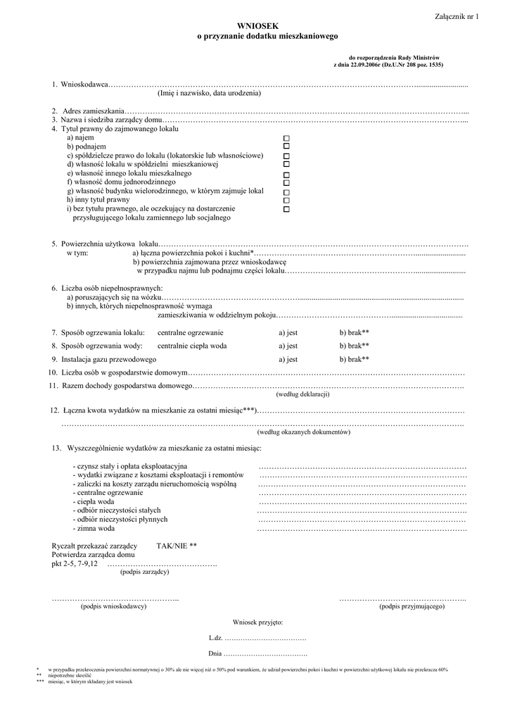Załącznik nr 1 WNIOSEK o przyznanie dodatku mieszkaniowego do rozporządzenia Rady Ministrów z dnia 22.09.2006r (Dz.U.Nr 208 poz. 1535) 1. Wnioskodawca…………………………………………………………………………………………………………........................... (Imię i nazwisko, data urodzenia) 2. Adres zamieszkania……………………………………………………………………………………………………………………... 3. Nazwa i siedziba zarządcy domu………………………………………………………………………………………………………... 4. Tytuł prawny do zajmowanego lokalu a) najem b) podnajem c) spółdzielcze prawo do lokalu (lokatorskie lub własnościowe) d) własność lokalu w spółdzielni mieszkaniowej e) własność innego lokalu mieszkalnego f) własność domu jednorodzinnego g) własność budynku wielorodzinnego, w którym zajmuje lokal h) inny tytuł prawny i) bez tytułu prawnego, ale oczekujący na dostarczenie przysługującego lokalu zamiennego lub socjalnego 5. Powierzchnia użytkowa lokalu…………………………………………………………………………………………………………. w tym: a) łączna powierzchnia pokoi i kuchni*……………………………………………………….......................... b) powierzchnia zajmowana przez wnioskodawcę w przypadku najmu lub podnajmu części lokalu…………………………………………….......................... 6. Liczba osób niepełnosprawnych: a) poruszających się na wózku………………………………………………..................................................................................... b) innych, których niepełnosprawność wymaga zamieszkiwania w oddzielnym pokoju………………………………………..................................... 7. Sposób ogrzewania lokalu: centralne ogrzewanie a) jest b) brak** 8. Sposób ogrzewania wody: centralnie ciepła woda a) jest b) brak** a) jest b) brak** 9. Instalacja gazu przewodowego 10. Liczba osób w gospodarstwie domowym……………………………………………………………………………………………… 11. Razem dochody gospodarstwa domowego……………………………………………………………………………………………. (według deklaracji) 12. Łączna kwota wydatków na mieszkanie za ostatni miesiąc***)……………………………………………………………………… …………………………………………………………………………………………………………………………………………. (według okazanych dokumentów) 13. Wyszczególnienie wydatków za mieszkanie za ostatni miesiąc: - czynsz stały i opłata eksploatacyjna - wydatki związane z kosztami eksploatacji i remontów - zaliczki na koszty zarządu nieruchomością wspólną - centralne ogrzewanie - ciepła woda - odbiór nieczystości stałych - odbiór nieczystości płynnych - zimna woda ……………………………………………………………………… ……………………………………………………………………… ……………………………………………………………………… ……………………………………………………………………… ……………………………………………………………………… ………………………………………………………………………. ……………………………………………………………………… ………………………………………………………………………. Ryczałt przekazać zarządcy TAK/NIE ** Potwierdza zarządca domu pkt 2-5, 7-9,12 ……………………………………. (podpis zarządcy) ………………………………………….. ………………………………………….. (podpis przyjmującego) (podpis wnioskodawcy) Wniosek przyjęto: L.dz. ……………………………… Dnia ………………………………. * w przypadku przekroczenia powierzchni normatywnej o 30% ale nie więcej niż o 50% pod warunkiem, że udział powierzchni pokoi i kuchni w powierzchni użytkowej lokalu nie przekracza 60% ** niepotrzebne skreślić *** miesiąc, w którym składany jest wniosek ..................... .......................... (miejscowość) (data) .................................................. ............... (imię i nazwisko składającego deklarację) ................................................................. …………………………………………. (dokładny adres) Deklaracja o wysokości dochodów za okres ...................................................................................................................................... (pełnych trzech miesięcy kalendarzowych poprzedzających datę złożenia wniosku) Oświadczam, że moje gospodarstwo domowe składa się z następujących osób: 1.Imię i nazwisko......................................................................................... wnioskodawca, data urodzenia...............................................PESEL 2.Imię i nazwisko ..........................................................stopień pokrewieństwa………………….. data urodzenia...............................................PESEL 3.Imię i nazwisko ...........................................................stopień pokrewieństwa…………………. data urodzenia...............................................PESEL 4.Imię i nazwisko .............................................................stopień pokrewieństwa…………………. data urodzenia...............................................PESEL 5.Imię i nazwisko .............................................................stopień pokrewieństwa…………………. data urodze