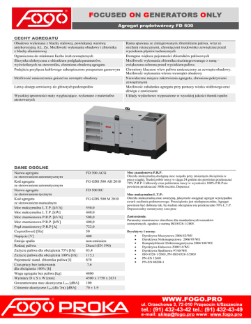 Agregat prądotwórczy FD 500 CECHY AGREGATU Obudowa wykonana z blachy stalowej, powlekanej warstwą antykorozyjną AL. Zn. Możliwość wykonania obudowy i zbiornika z blachy aluminiowej Ograniczona do minimum liczba śrub zewnętrznych Skrzynka elektryczna z okienkiem podglądu parametrów, wyświetlanych na sterowniku, chroniona obudową agregatu Podejście przyłącza kablowego zabezpieczone przepustem gumowym Możliwość umieszczenia gniazd na zewnątrz obudowy Łatwy dostęp serwisowy do głównych podzespołów Wysokiej sprawności maty wygłuszające, wykonane z materiałów atestowanych Rama spawana ze zintegrowanym zbiornikiem paliwa, wraz ze strefami retencyjnymi, chroniącymi środowisko zewnętrzne przed wyciekiem płynów technicznych Dostępne większe pojemności zbiorników paliwowych Możliwość wykonania zbiornika niezintegrowanego z ramą – zwiększona ochrona przed wyciekiem paliwa Chroniony kluczem wlew paliwa umieszczony za zewnątrz obudowy. Możliwość wykonania wlewu wewnątrz obudowy Niewidoczne miejsca zakotwienia agregatu, chronione pokrywami zewnętrznymi Możliwość załadunku agregatu przy pomocy wózka widłowego oraz dźwigu z zawiesiami Układy wydechowe wyposażone w wysokiej jakości tłumiki spalin DANE OGÓLNE Nazwa agregatu ze sterowaniem automatycznym Kod agregatu ze sterowaniem automatycznym Nazwa agregatu ze sterowaniem ręcznym Kod agregatu ze sterowaniem manualnym Moc maksymalna L.T.P. [kVA] Moc maksymalna L.T.P. [kW] Moc znamionowa P.R.P. [kVA] Moc znamionowa P.R.P. [kW] Prąd znamionowy P.R.P [A] Częstotliwość [Hz] Napięcie [V] Emisja spalin Rodzaj paliwa Zużycie paliwa dla obciążenia 75% [l/h] Zużycie paliwa dla obciążenia 100% [l/h] Pojemność stand. zbiornika paliwa [l] Czas pracy bez tankowania dla obciążenia 100% [h] Waga agregatu bez paliwa [kg] Wymiary D x S x W [mm] Gwarantowana moc akustyczna Lwa [dBA] Ciśnienie akustyczne Lpa (dla 7m) [dBA] FD 500 ACG FG GDS 500 AH 2010 Moc znamionowa P.R.P: Określa maksymalną dostępną moc zespołu przy zmiennym obciążeniu w pracy ciągłej. Średni pobór mocy w ciągu 24 godzin nie powinien przekraczać 70% P.R.P. Całkowity czas pobierania mocy w wysokości 100% P.R.P nie powinien przekraczać 500h rocznie. Dopuszcz FD 500 RC FG GDS 500 M 2010 550,0 440,0 500,0 400,0 722,0 50 400 non-emission Diesel (EN 590) 83,4 115,1 870 7,6 4800 4500 x 1750 x 2631 100 70 ± 1,9 Moc maksymalna L.T.P.: Określa maksymalną moc awaryjną, jaką może osiągnąć agregat w przypadku awarii zasilania podstawowego. Przeciążenie jest niedopuszczalne. Agregat powinien być dobrany tak, by średnie obciążenie nie przekraczało 70% L.T.P. Dopuszczalny sumaryczny czas prac Zastrzeżenia: Parametry znamionowe określone dla standardowych warunków zewnętrznych, zgodnie z normą ISO 8528-1:2005. Dyrektywy i normy: Dyrektywa Maszynowa 2006/42/WE Dyrektywa Niskonapięciowa 2006/95/WE Kompatybilność Elektromagnetyczna 2004/108/WE Dyrektywa Hałasowa 2000/14/WE Dyrektywa Spalinowa 97/68/WE ISO 8528-1/2005, PN-ISO 8528-5/2005 PN-EN 12601 PN-EN 60204-1 Agregat prądotwórczy FD 500 STEROWNIK STANDARD Kod sterownika: 2010 Intuicyjny interfejs graficzny Dziennik zdarzeń: do 119 pozycji Pomiar wartości prądu w 3 fazach Pomiar wartości napięć fazowych i przewodowych Pomiar mocy czynnej, biernej i pozornej Licznik czasu pracy Pomiar napięcia akumulatora Pomiar poziomu paliwa Ochrona generatora (częstotliwość, napięcie, asymetria) Komunikacja RS 232 (wymagany moduł IL-NT RS232 lub IL-NT RS232-485) Komunikacja RS 485 Modbus (wymagany moduł IL-NT RS232-485) Obsługa zdalna przez GPRS (wymagany moduł IL-NT GPRS) Obsługa zdalna przez Internet (wymagany moduł IB-Lite) Darmowy system InteliMonitor do podglądu parametrów agregatów lub WebSupervisor do zarządzania flotą urządzeń Darmowa aplikacja WebSupervisor dla Android lub iOS do podglądu floty agregatów Wysyłanie powiadomień o błędach poprzez SMS lub e-mail (wymagany moduł IL-NT GPRS lub IB-Lite SILNIK Producent silnika Typ silnika Kraj produkcji Moc silnika netto [kW] Emisja spalin* Obroty [obr/min] Regulacja obrotów Klasa wykonania** Pojemność silnika [l] Liczba cylindrów Instalacja [V] Płyn chłodzący Pojemność cieczy chłodzącej [l] Olej silnikowy Pojemność miski olejowej [l] Rodzaj paliwa Zużycie paliwa dla obciążenia 75% [l/h] Zużycie paliwa dla obciążenia 100% [l/h] PRĄDNICA Doosan DP158LD Korea Płd. 448,0 non-emission 1500 elektroniczna G2 14,6 8 24 Shell Anti Freeze 79,0 Shell Rimula R4L 22,0 Diesel (EN 590) 83,4 115,1 Zgodnie z Dyrektywą 97/68/WE dotyczącą ograniczenia emisji zanieczyszczeń gazowych i pyłowych z silników spalinowych, montowanych w maszynach samojezdnych, nieporuszających się po drogach. ** Zgodnie z normą PN-ISO 8528-5/1997 * Producent prądnicy Typ prądnicy Kraj produkcji Moc prądnicy (40 ºC, 1000m n.p.m.) [kVA] Moc prądnicy (27 ºC, 1000m n.p.m.) [kVA] Sprawność prądnicy [%] Stabilizacja napięcia Poziom stabilizacji napięcia [%] Ochrona Klasa izolacji Odkształcenia harmoniczne prądu THD [%] Reaktancja Xd’’ [%] Sincro* SK355MS Chorwacja 500,0 545,0 94,2 AVR cyfrowy +/- 0,25 IP 23 H <2 12.7 * Możliwość zabudowy prądnicy firmy STAMFORD lub innej, wskazanej przez klienta. Dane znamionowe agregatu mogą w takim przypadku ulec zmianie. Agregat prądotwórczy FD 500 WYPOSAŻENIE STANDARDOWE WYPOSAŻENIE I USŁUGI OPCJONALNE Sterownik MRS10 (2010) Wyłącznik główny agregatu Wyłącznik sterownika Szynowe przyłącze odbioru mocy Wyłącznik główny agregatu Eaton LZMN4AE800 Ręczna pompa do spustu oleju Filtr paliwa z separatorem wody Grzałka silnika z termostatem (ster. ręczne) Cewka podnapięciowa (ster. ręczne) lub wzrostowa (ster. automatyczne) wyłącznika głównego Cyfrowy 3 fazowy AVR Sygnalizator dźwiękowy awarii Przycisk awaryjnego zatrzymania Akumulator rozruchowy Ładowarka akumulatora (ster. automatyczne) Grzałka silnika z termostatem (
