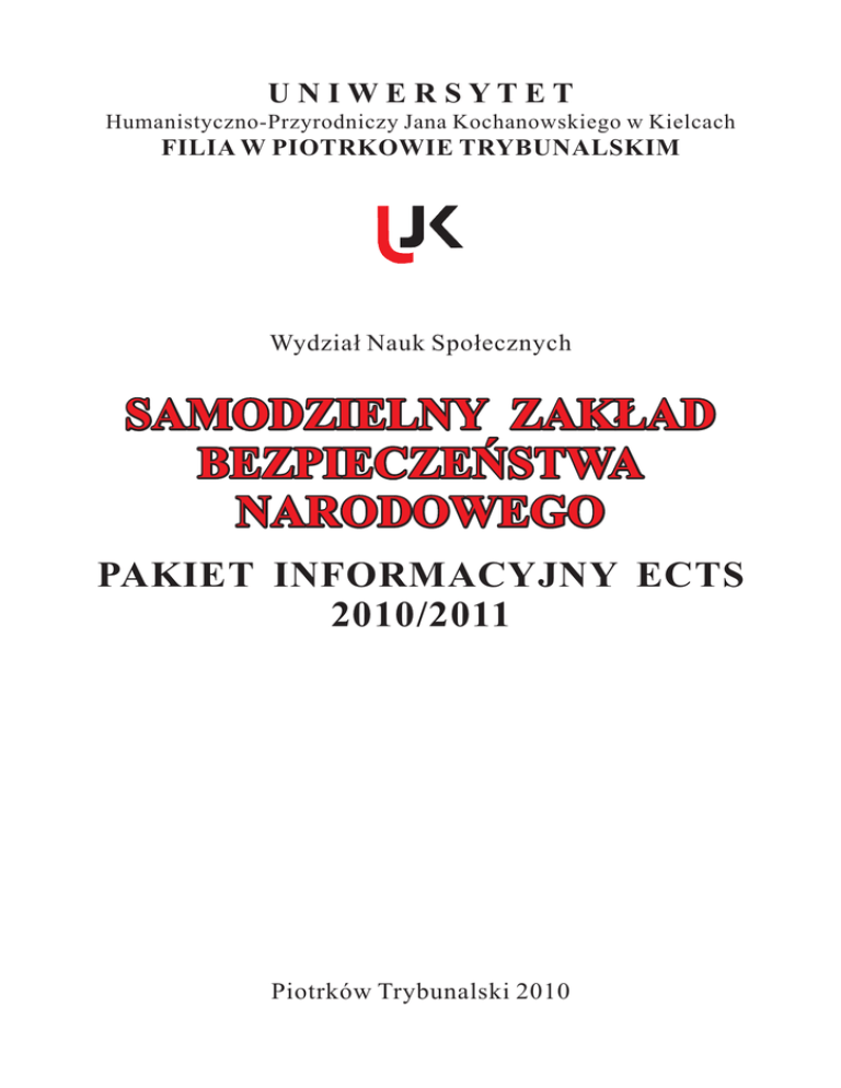 UNIWERSYTET Humanistyczno-Przyrodniczy Jana Kochanowskiego w Kielcach FILIA W PIOTRKOWIE TRYBUNALSKIM Wydział Nauk Społecznych SAMODZIELNY ZAKŁAD BEZPIECZEŃSTWA NARODOWEGO PAKIET INFORMACYJNY ECTS 2010/2011 Piotrków Trybunalski 2010 PRZEWODNIK ECTS 2010/2011 Zespół redakcyjny: Agata Bury Jacek Jarczyski Marek Kulisz Stanisław Leszto Ewa Opala Władysław Skarbek Andrzej Witusik Spis treĞci Wstp...................................................................................... 7 Rozdział 1: Uczelnia............................................................... 9 Rozdział 2: Studia i studenci................................................. 17 Rozdział 3: Wydział Nauk Społecznych............................... 29 Rozdział 4: Objanienia i definicje ....................................... 37 Rozdział 5: Samodzielny Zakład Bezpieczestwa Narodowego...................................................... 41 WstĊp Europejski System Transferu Punktów (w skrócie ECTS od angielskiej nazwy: European Credit Transfer System) to system ułatwiający zaliczanie okresu studiów odbytych przez studenta w uczelni partnerskiej (w tym uczelni zagranicznej) przez jego uczelniĊ macierzystą. System ECTS został opracowany w drugiej połowie lat 80. i wprowadzony w wielu szkołach wyĪszych krajów Europy Zachodniej. ECTS stanowi kodeks sprawdzonych rozwiązaĔ dotyczących uznawania (okresu) studiów. Oznacza to, Īe okres studiów odbyty w uczelni partnerskiej (w tym egzaminy lub inne formy oceny) zastĊpuje porównywalny okres studiów w uczelni macierzystej, niezaleĪnie od tego, Īe treĞü uzgodnionego programu studiów w uczelni partnerskiej moĪe siĊ róĪniü od programu w uczelni macierzystej. Podstawą systemu ECTS jest przejrzystoĞü programu studiów i zasad zaliczania zajĊü. ECTS ułatwia instytucjom uznawanie osiągniĊü studentów w nauce, przez stosowanie punktów ECTS oraz wspólnej skali ocen. Przewodnik dla uĪytkowników ECTS (we wszystkich jĊzykach UE), instrukcje dotyczące przedstawiania w Internecie pakietów informacyjnych ECTS oraz ogólne informacje o ECTS dostĊpne są na stronie Komisji Europejskiej: http://ec.europa.eu/education/lifelong-learning-policy/doc48_en.htm Punkty ECTS stanowią wartoĞü liczbową przyporządkowaną poszczególnym przedmiotom, odpowiadającą nakładowi pracy, jaką winien wykonaü student, aby otrzymaü zaliczenie z danego przedmiotu. Liczba punktów, którą uzyskuje student po zaliczeniu danego przedmiotu, opisuje wzglĊdny nakład pracy koniecznej do zaliczenia tego przedmiotu w odniesieniu do całkowitego nakładu pracy, wymaganego do zaliczenia pełnego roku akademickiego studiów na danym kierunku. Punkty ECTS przypisane kaĪdemu z przedmiotów koĔczących siĊ zaliczeniem z oceną odzwierciedlają wzglĊdne obciąĪenie studenta związanego z udziałem w róĪnych formach zajĊü związanych z realizacją danego przedmiotu. Obejmują one zarówno zajĊcia grupowe: wykłady, üwiczenia, konwersatoria, seminaria, prace terenowe itp., jak i pracĊ indywidualną oraz egzaminy i inne formy oceny. Punkty ECTS przypisuje siĊ równieĪ praktykom i przedmiotom obieralnym, stanowiącym integralną czĊĞü programu studiów, o ile koĔczą siĊ oceną. W systemie ECTS iloĞü pracy wymaganej do zaliczenia całego roku akademickiego odpowiada 60 punktom, na semestr przypada zwykle 30 punktów. O liczbie punktów przypisywanej poszczególnym przedmiotom decyduje instytucja uczestnicząca w systemie ECTS. Podstawowymi dokumentami systemu ECTS są trzy dokumenty: 1. Pakiet informacyjny (information package) zawierający informacje na temat uczelni, wydziału/instytutów, organizacji i struktury studiów oraz przedmiotów. Pełni rolĊ przewodnika dla nauczycieli i studentów uczelni macierzystej, jak i uczelni partnerskich. Obejmuje ogólne informacje o uczelni macierzystej, wydziale/instytucie, kalendarzu akademickim, planach i programach studiów. Opis planów i programów studiów dotyczy przede wszystkim programu przedmiotów, formy zajĊü, okresu trwania, wymagaĔ wstĊpnych, sposobu oceny, wartoĞci punktowej oraz innych informacji na temat przedmiotów wchodzących w skład oferty dydaktycznej danej jednostki. Pakiet informacyjny, aktualizowany co rok powinien byü dostĊpny w formie elektronicznej oraz w wersji obcojĊzycznej. 2. Porozumienie o programie zaj (learning agreement), to umowa trójstronna pomidzy studentem a uczelniami – macierzystą i partnerską, przygotowana przed rozpoczĊciem przez studenta okresu studiów w uczelni partnerskiej. Umowa zobowiązuje studenta do zrealizowania okreĞlonego umową programu zajĊü, uczelniĊ, przyjmującą do zapewnienia studentowi udziału w wymienionych w porozumieniu zajĊciach, a uczelnie, macierzystą do uznania zaliczonych przedmiotów według uzgodnionej punktacji i skali ocen. 3. Wykaz zaliczeĔ (transcript of records) przedstawiający jakoĞciowy i iloĞciowy opis osiągniĊü studenta w nauce. Przygotowuje siĊ go zarówno przed wyjazdem studenta, jak i po zakoĔczeniu okresu studiów w uczelni partnerskiej. W wykazie wymienione są wszystkie przedmioty, w których student uczestniczył wraz z uzyskana liczbą punktów i ocenami przyznanymi zgodnie ze skalą stosowaną w danej uczelni oraz w systemie ECTS. Student zainteresowany odbyciem okresu studiów w uczelni partnerskiej, po zapoznaniu siĊ z pakietem informacyjnym tej uczelni, przygotowuje w porozumieniu z właĞciwym koordynatorem w uczelni macierzystej plan studiów w czasie pobytu w uczelni partnerskiej. Wypełnia formularz zgłoszeniowy (student application form), który obok danych osobowych kandydata obejmuje informacjĊ o liczbie punktów jaką planuje uzyskaü w uczelni przyjmującej. Do formularza dołącza uzgodnione z koordynatorem porozumienie o programie zajĊü oraz opis dotychczasowego przebiegu studiów w formie wykazu zaliczeĔ. Porozumienie o programie zajĊü podpisuje student i koordyna