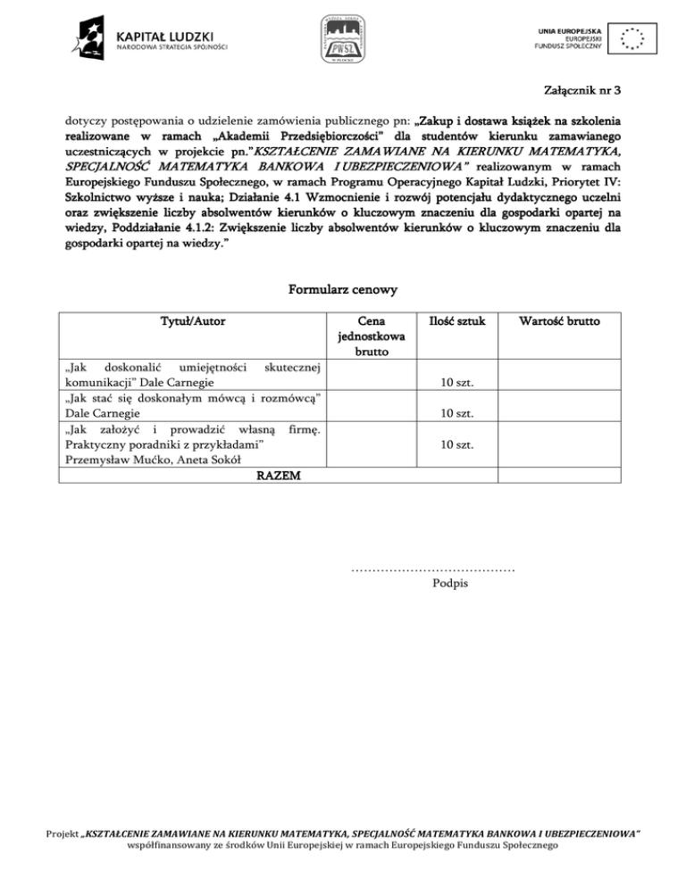 Załącznik nr 3 dotyczy postępowania o udzielenie zamówienia publicznego pn: „Zakup i dostawa książek na szkolenia realizowane w ramach „Akademii Przedsiębiorczości” dla studentów kierunku zamawianego uczestniczących w projekcie pn.”KSZTAŁCENIE ZAMAWIANE NA KIERUNKU MATEMATYKA, SPECJALNOŚĆ MATEMATYKA BANKOWA I UBEZPIECZENIOWA” realizowanym w ramach Europejskiego Funduszu Społecznego, w ramach Programu Operacyjnego Kapitał Ludzki, Priorytet IV: Szkolnictwo wyższe i nauka; Działanie 4.1 Wzmocnienie i rozwój potencjału dydaktycznego uczelni oraz zwiększenie liczby absolwentów kierunków o kluczowym znaczeniu dla gospodarki opartej na wiedzy, Poddziałanie 4.1.2: Zwiększenie liczby absolwentów kierunków o kluczowym znaczeniu dla gospodarki opartej na wiedzy.” Formularz cenowy Tytuł/Autor „Jak doskonalić umiejętności skutecznej komunikacji” Dale Carnegie „Jak stać się doskonałym mówcą i rozmówcą” Dale Carnegie „Jak założyć i prowadzić własną firmę. Praktyczny poradniki z przykładami” Przemysław Mućko, Aneta Sokół RAZEM Cena jednostkowa brutto Ilość sztuk Wartość brutto 10 szt. 10 szt. 10 szt. ………………………………… Podpis Projekt „KSZTAŁCENIE ZAMAWIANE NA KIERUNKU MATEMATYKA, SPECJALNOŚĆ MATEMATYKA BANKOWA I UBEZPIECZENIOWA” współfinansowany ze środków Unii Europejskiej w ramach Europejskiego Funduszu Społecznego
