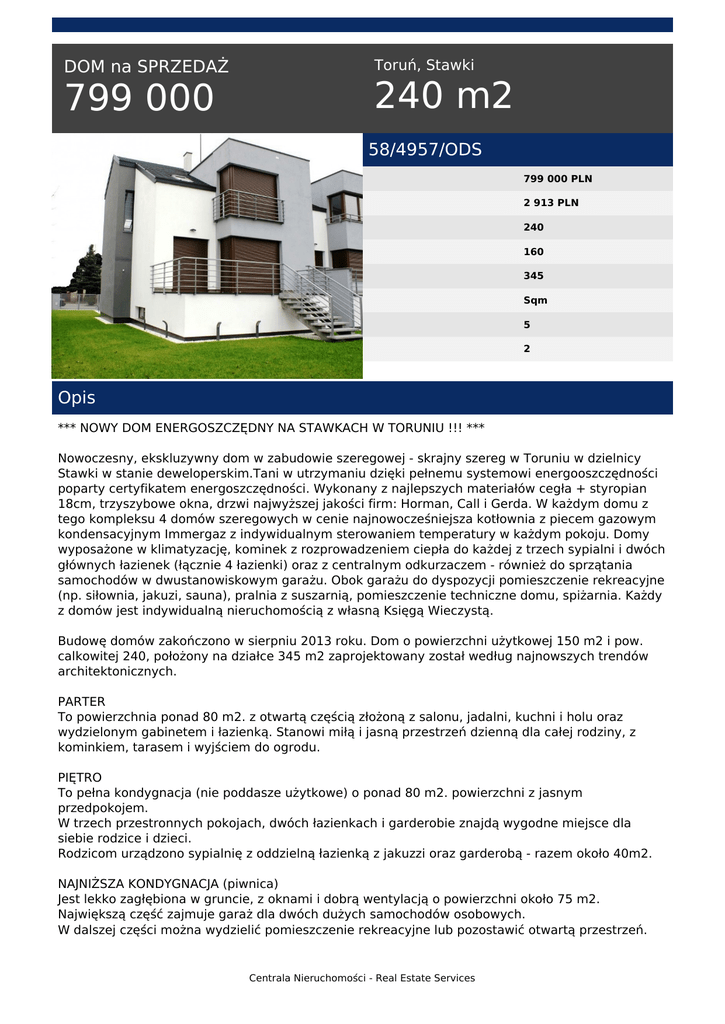 DOM na SPRZEDAŻ 799 000 Toruń, Stawki 240 m2 58/4957/ODS 799 000 PLN 2 913 PLN 240 160 345 Sqm 5 2 Opis *** NOWY DOM ENERGOSZCZĘDNY NA STAWKACH W TORUNIU !!! *** Nowoczesny, ekskluzywny dom w zabudowie szeregowej - skrajny szereg w Toruniu w dzielnicy Stawki w stanie deweloperskim.Tani w utrzymaniu dzięki pełnemu systemowi energooszczędności poparty certyfikatem energoszczędności. Wykonany z najlepszych materiałów cegła + styropian 18cm, trzyszybowe okna, drzwi najwyższej jakości firm: Horman, Call i Gerda. W każdym domu z tego kompleksu 4 domów szeregowych w cenie najnowocześniejsza kotłownia z piecem gazowym kondensacyjnym Immergaz z indywidualnym sterowaniem temperatury w każdym pokoju. Domy wyposażone w klimatyzację, kominek z rozprowadzeniem ciepła do każdej z trzech sypialni i dwóch głównych łazienek (łącznie 4 łazienki) oraz z centralnym odkurzaczem - również do sprzątania samochodów w dwustanowiskowym garażu. Obok garażu do dyspozycji pomieszczenie rekreacyjne (np. siłownia, jakuzi, sauna), pralnia z suszarnią, pomieszczenie techniczne domu, spiżarnia. Każdy z domów jest indywidualną nieruchomością z własną Księgą Wieczystą. Budowę domów zakończono w sierpniu 2013 roku. Dom o powierzchni użytkowej 150 m2 i pow. calkowitej 240, położony na działce 345 m2 zaprojektowany został według najnowszych trendów architektonicznych. PARTER To powierzchnia ponad 80 m2. z otwartą częścią złożoną z salonu, jadalni, kuchni i holu oraz wydzielonym gabinetem i łazienką. Stanowi miłą i jasną przestrzeń dzienną dla całej rodziny, z kominkiem, tarasem i wyjściem do ogrodu. PIĘTRO To pełna kondygnacja (nie poddasze użytkowe) o ponad 80 m2. powierzchni z jasnym przedpokojem. W trzech przestronnych pokojach, dwóch łazienkach i garderobie znajdą wygodne miejsce dla siebie rodzice i dzieci. Rodzicom urządzono sypialnię z oddzielną łazienką z jakuzzi oraz garderobą - razem około 40m2. NAJNIŻSZA KONDYGNACJA (piwnica) Jest lekko zagłębiona w gruncie, z oknami i dobrą wentylacją o powierzchni około 75 m2. Największą część zajmuje garaż dla dwóch dużych samochodów osobowych. W dalszej części można wydzielić pomieszczenie rekreacyjne lub pozostawić otwartą przestrzeń. Centrala Nieruchomości - Real Estate Services W wydzielonych pomieszczeniach znajdują się pralnia z suszarnią, część techniczna domu, ubikacja oraz wyjście do ogrodu i pod taras, gdzie można przechowywać meble ogrodowe. Dom wyposażony został w : * okna 3-szybowe (0,7kW/mkw.), drzwi wejściowe drewniane "CAL", garażowe "HORMAN" z napęd. elekt. * ogrzewanie gazowe kondensacyjne, podłogowe z elektroniczną regulacją temperatury w poszczególnych pomieszczeniach, np w pokoju kąpielowym 25 st.C, w sypialni 19 st.C, w salonie 22, w korytarzu, 17st.C lub jak Państwo lubią - energooszczędne gospodarowanie ciepłem z programowaniem tygodniowym, * kocioł C.O. pracuje w zakresie temperatur od 25 do 40 st.C - naprawdę 109% efektywności, * podgrzewacz CWU 160 litrów z cyrkulacją do wszystkich punktów poboru ciepłej wody, * kominek w salonie z rozprowadzeniem ciepłego powietrza do wszystkich pomieszczeń na piętrze automatycznie ograniczy zapotrzebowanie na ogrzewanie gazowe, * klimatyzacja pomieszczenia salonu, jadalni, kuchni może być uruchamiana automatycznie przez centralę "inteligentny dom" * rolety zewnętrzne na południowej stronie budynku z napędami elektrycznymi francuskimi "Simu" (dwie witryny narożne 2,5x2,35metra, okno balkonowe 1,8x2.35metra, okno garażu) - możliwość automatycznego uruchomiania przez "inteligentny dom". MATERIAŁY Z JAKICH ZOSTAŁ WYKONANY: 1.Dachówka ceramiczna niemieckiego producenta "MEYER HOLSEN - PIANO", 2.Obróbki blacharskie z blachy TYTANOWO-CYNKOWEJ i blachy powlekanej grafitowej, 3.Schody zewnętrzne i parapety zewnętrzne z LITEGO GRANITU, 4.Balustrady zewnętrzne cynkowane i malowane proszkowo, 5.Okna dachowe ROTO 85 o NISKIEJ PRZENIKALNOŚCI TERMICZNEJ, 6.Okna fasadowe 3-SZYBOWE z niemieckim profilem, 7.Ogrodzenie CYNKOWANE ogniowo i malowane proszkowo. ZALETY BUDYNKU: Położenie w cichej, zagospodarowanej i czystej okolicy, Instalacja alarmowa pod tynkiem, alarm z monitoringiem i patrolem ochrony, Instalacja centralnego odkurzacza, Pełne uzbrojenie terenu - woda, kanalizacja, odprowadzenie deszczówki do studzienek burzowych, energia elektryczna,gaz. Kotłownia gazowa, najnowocześniejsza, kondensacyjna, energooszczędna ze sterowaniem elektronicznym temp.w każdym pomieszczeniu (max. 500zł/miesiąc - przy największych mrozach), Instalacja elektryczna wyposażona w zegar astronomiczny i zegar czasowy (podłączone oświetlenie zewnętrzne) Instalacja elektryczna przygotowana do sterowania "INTELIGENTNY DOM" NAJNOWSZA FORMA SPRZEDAŻY:(wynajem do czasu zorganizowania zapłaty) - wynajem od zaraz - kwoty za wynajem wliczamy w cenę zakupu, - niska cena wynajmu - 2.000zł, - czas na zakup nawet do 2 lat (przez ten czas zapłacisz za dom prawie 50tys.zł), - nie tracisz pieniędzy na wynajem - stajesz się właścicielem. - OFERTA DO INDYWIDUALNYCH UZGODNIEŃ - TYLKO DLA KUPUJĄCYCH. OPIS LOKALIZACJI: Aquapark, szkoła - ok. 500 m, Przedszkole - ok. 500 m, Kościół - 300 m Sklepy: Biedronka, Lidl, Polo market, Park, Przystanki MZK, dworzec Głowny PKP - dojdziesz pieszo, Do Starówki Torunia ok. 3 km Żadnego zagrożenia powstaniem obwodnicy, autostrady w istniejących planach i koncepcjach miasta. Więcej informacji na www.centralanieruchomosci.pl tel. 663 899 715 Centrala Nieruchomości - Real Estate Services Centrala Nieruchomości: ZAPEWNIAMY BEZPŁATNE I PROFESJONALNE DORADZTWO ZARÓWNO W ZAKRESIE NIERUCHOMOŚCI JAK I POZYSKIWANIU POD NIE KREDYTÓW HIPOTECZNYCH Powyższe informacje zostały sporządzone na podstawie oświadczeń właścicieli i nie są ofertą w rozumieniu przepisów Kodeksu Cywilnego. Mają one jedynie charakter informacyjny. Większość naszych