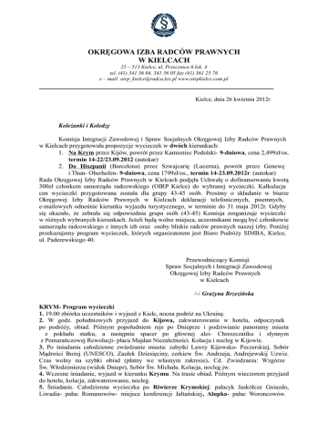 OKRĘGOWA IZBA RADCÓW PRAWNYCH W KIELCACH 25 – 513 Kielce, ul. Przecznica 6 lok. 4 tel. (41) 341 56 04, 341 56 05 fax (41) 361 25 76 e – mail: [email protected] www.oirpkielce.com.pl Kielce, dnia 26 kwietnia 2012r Koleżanki i Koledzy Komisja Integracji Zawodowej i Spraw Socjalnych Okręgowej Izby Radców Prawnych w Kielcach przygotowała propozycje wycieczek w dwóch kierunkach: 1. Na Krym przez Kijów, powrót przez Kamieniec Podolski- 9-dniowa, cena 2,499zł/os. termin 14-22/23.09.2012 (autokar) 2. Do Hiszpanii (Barcelona) przez Szwajcarię (Lucerna), powrót przez Genewę i Thun- Oberhofen- 9-dniowa, cena 1799zł/os., termin 14-23.09.2012r. (autokar) Rada Okręgowej Izby Radców Prawnych w Kielcach podjęła Uchwałę o dofinansowaniu kwotą 300zł członkom samorządu radcowskiego (OIRP Kielce) do wybranej wycieczki. Kalkulacja cen wycieczki przygotowana została dla grupy 43-45 osób. Prosimy o składanie w biurze Okręgowej Izby Radców Prawnych w Kielcach deklaracji telefonicznych, pisemnych, e-mailowych odnośnie kierunku wyjazdu turystycznego, w terminie do 31 maja 2012r. Gdyby się okazało, że zebrała się odpowiednia grupa osób (43-45) Komisja zorganizuje wycieczki w różnych wybranych kierunkach. Jeżeli będą wolne miejsca, uczestnikami mogą być członkowie samorządu radcowskiego z innych izb oraz osoby bliskie radców prawnych naszej izby. Poniżej przekazujemy program wycieczek, których organizatorem jest Biuro Podróży SIMBA, Kielce, ul. Paderewskiego 40. Przewodniczący Komisji Spraw Socjalnych i Integracji Zawodowej Okręgowej Izby Radców Prawnych w Kielcach /-/ Grażyna Brzezińska KRYM- Program wycieczki 1. 19.00 zbiórka uczestników i wyjazd z Kielc, nocna podróż na Ukrainę. 2. W godz. południowych przyjazd do Kijowa, zakwaterowanie w hotelu, odpoczynek po podróży, obiad. Późnym popołudniem rejs po Dnieprze i podziwianie panoramy miasta z pokładu statku, a następnie spacer po głównej alei- Chreszczatiku i słynnym z Pomarańczowej Rewolucji- placu Majdan Niezależności. Kolacja i nocleg w Kijowie. 3. Po śniadaniu całodzienne zwiedzanie miasta: zabytki Lawry Kijowsko- Peczerskiej, Sobór Mądrości Bożej (UNESCO), Zaułek Dziesięciny, cerkiew Św. Andrzeja, Andrejewskij Uzwiz. Czas wolny na szybki obiad (płatny we własnym zakresie). Cd. Zwiedzania: Wzgórze Św. Włodzimierza (widok Dniepr), Sobór Św. Michała. Kolacja, nocleg jw. 4. Wczesne śniadanie, wyjazd w kierunku Krymu. Na trasie obiad. Późnym wieczorem przyjazd do hotelu, kolacja, zakwaterowanie, nocleg. 5. Śniadanie. Całodzienna wycieczka po Riwierze Krymskiej: pałacyk Jaskółcze Gniazdo, Liwadia- pałac Romanowów- miejsce konferencji Jałtańskiej, Ałupka- pałac Woroncowów. Po południu czas wolny na obiad i spacer po bulwarze nadmorskim w Jałcie a następnie wizyta w winiarni Massandra i degustacja win krymskich. Powrót do hotelu, kolacja, nocleg jw. 6. Śniadanie, przejazd do Bakczysaraju- zwiedzanie unikalnego kompleksu pałacowego chanów krymskich (Wielki Meczet, Sala Dywanu, Dziedziniec Fontann, harem, sale reprezentacyjne) a następnie piesza wędrówka do wykutego w skale klasztoru Uspieńskiego. Po południu wizyta w Pałacu Aleksandra III oraz Nikitskim Ogrodzie Botanicznym*. Powrót do hotelu, czas wolny, kolacja, nocleg jw. 7. Po śniadaniu (10.00) wyjazd do Odessy. Na trasie obiad. Zakwaterowanie, kolacja, nocleg. 8. Śniadanie, wykwaterowanie. Panoramiczny objazd miasta (port morski, Latarnia Woroncowa, Nowa Giełda, Plac Grecki, cerkiew Św. Trójcy) a następnie spacer Primorskim Bulwarem (pomnik Puszkina i Richelieu, schody Potiomkinowskie), oraz Pałac Woroncowa, Opera, kościół Św. Pawła, ulica Polska (tablica upamiętniająca A. Mickiewicza), Pałac Potockich. Czas wolny na obiad. W godz. Południowych wyjazd do Kamieńca Podolskiego. Zakwaterowanie, kolacja, nocleg. 9. Śniadanie, wykwaterowanie. Wizyta w twierdzy kamienieckiej (Stary i Nowy Zamek) a następnie spacer po Starym Mieście ( rynek, ratusz, katedra Św. Piotra i Pawła, kościół i klasztor Dominikanów) oraz dzielnicy ormiańskiej i żydowskiej. Ew. w miarę wolnego czasu przejazd do Okopów Św. Trójcy ( pozostałości twierdzy na przesmyku między Zbruczem a Dniestrem) i Chocimia. Po południu obiad i wyjazd w drogę powrotną do Polski. W godz. nocnych przejazd do Kielc. Cena obejmuje: -transport komfortowym autokarem, - 7 noclegów w hotelach 3* (2 w Kijowie, 3 na Krymie, 1 w Odessie, 1 w Kamieńcu) pokoje 2-3 os. z łazienkami, - wyżywienie: 7 śniadań, 4 obiady, 7 ciepłych kolacji, -program turystyczny, opieka pilota- przewodnika, ubezpieczenie KL/NW Dod. Płatne: wstępy do zwiedzanych obiektów 95€ HISZPANIA PRZEZ SZWAJCARIĘ- program wycieczki 1. 19.00 zbiórka uczestników i wyjazd z Kielc. Nocna podróż przez Niemcy do Szwajcarii. 2. W godz. południowych przyjazd nad Jezioro Bodeńskie, przeprawa promem, zwiedzanie największych w Europie wodospadów na Renie, a następnie krótki spacer po zabytkowym miasteczku Stein am Rhein. Przejazd w okolice Lucerny, kolacja, nocleg. 3. Po śniadaniu spacer po centrum Lucerny i nad Jezioro Czterech Kantonów, oglądanie zabytkowego Mostu Kaplicznego. Wyjazd do Hiszpanii (przez Francję). Późna kolacja, zakwaterowanie, nocleg, w hotelu na wybrzeżu Costa Brava (Calella/Lloret de Mar) 3 noclegi. 4. Śniadanie, czas wolny, obiad, wycieczka do Blanes (ogród botaniczny) kolacja, nocleg. 5. Po śniadaniu wyjazd na całodzienną wycieczkę do Barcelony i do Sanktuarium Maryjnego w Montserrat. W Barcelonie zwiedzanie min. Bazyliki Sagrada Familia i architektury słynnego modernisty Antoniego Gaudiego,- dzielnicy gotyckiej z ażurową Katedrą i labiryntem średniowiecznych uliczek, spacer po tętniącym życiem bulwarze Las Ramblas, stadion olimpijski na wzgórzu Montjuic, (Ew. stadion piłkarski FC Barcelona), kolacja, nocleg. 6. Śniadanie, spacer po Lloret de Mar lub Calelli, obiad, czas wolny, kolacja, 19.30- 