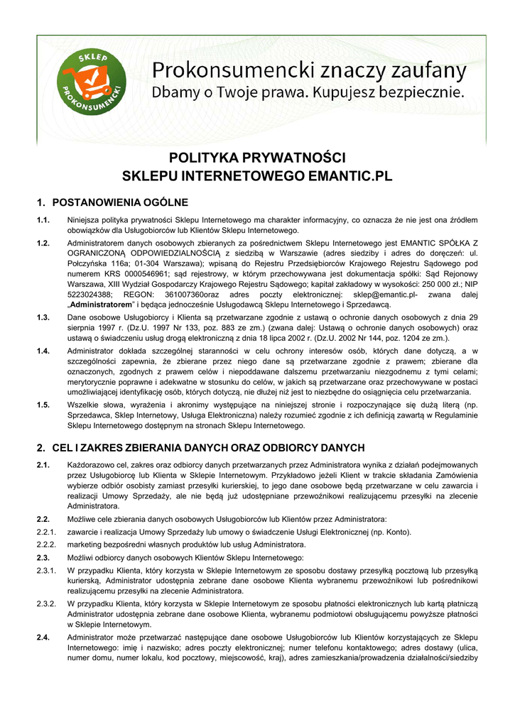 POLITYKA PRYWATNOŚCI SKLEPU INTERNETOWEGO EMANTIC.PL 1. POSTANOWIENIA OGÓLNE 1.1. Niniejsza polityka prywatności Sklepu Internetowego ma charakter informacyjny, co oznacza że nie jest ona źródłem obowiązków dla Usługobiorców lub Klientów Sklepu Internetowego. 1.2. Administratorem danych osobowych zbieranych za pośrednictwem Sklepu Internetowego jest EMANTIC SPÓŁKA Z OGRANICZONĄ ODPOWIEDZIALNOŚCIĄ z siedzibą w Warszawie (adres siedziby i adres do doręczeń: ul. Połczyńska 116a; 01-304 Warszawa); wpisaną do Rejestru Przedsiębiorców Krajowego Rejestru Sądowego pod numerem KRS 0000546961; sąd rejestrowy, w którym przechowywana jest dokumentacja spółki: Sąd Rejonowy Warszawa, XIII Wydział Gospodarczy Krajowego Rejestru Sądowego; kapitał zakładowy w wysokości: 250 000 zł.; NIP 5223024388; REGON: 361007360oraz adres poczty elektronicznej: [email protected] zwana dalej „Administratorem” i będąca jednocześnie Usługodawcą Sklepu Internetowego i Sprzedawcą. 1.3. Dane osobowe Usługobiorcy i Klienta są przetwarzane zgodnie z ustawą o ochronie danych osobowych z dnia 29 sierpnia 1997 r. (Dz.U. 1997 Nr 133, poz. 883 ze zm.) (zwana dalej: Ustawą o ochronie danych osobowych) oraz ustawą o świadczeniu usług drogą elektroniczną z dnia 18 lipca 2002 r. (Dz.U. 2002 Nr 144, poz. 1204 ze zm.). 1.4. Administrator dokłada szczególnej staranności w celu ochrony interesów osób, których dane dotyczą, a w szczególności zapewnia, że zbierane przez niego dane są przetwarzane zgodnie z prawem; zbierane dla oznaczonych, zgodnych z prawem celów i niepoddawane dalszemu przetwarzaniu niezgodnemu z tymi celami; merytorycznie poprawne i adekwatne w stosunku do celów, w jakich są przetwarzane oraz przechowywane w postaci umożliwiającej identyfikację osób, których dotyczą, nie dłużej niż jest to niezbędne do osiągnięcia celu przetwarzania. 1.5. Wszelkie słowa, wyrażenia i akronimy występujące na niniejszej stronie i rozpoczynające się dużą literą (np. Sprzedawca, Sklep Internetowy, Usługa Elektroniczna) należy rozumieć zgodnie z ich definicją zawartą w Regulaminie Sklepu Internetowego dostępnym na stronach Sklepu Internetowego. 2. CEL I ZAKRES ZBIERANIA DANYCH ORAZ ODBIORCY DANYCH 2.1. Każdorazowo cel, zakres oraz odbiorcy danych przetwarzanych przez Administratora wynika z działań podejmowanych przez Usługobiorcę lub Klienta w Sklepie Internetowym. Przykładowo jeżeli Klient w trakcie składania Zamówienia wybierze odbiór osobisty zamiast przesyłki kurierskiej, to jego dane osobowe będą przetwarzane w celu zawarcia i realizacji Umowy Sprzedaży, ale nie będą już udostępniane przewoźnikowi realizującemu przesyłki na zlecenie Administratora. 2.2. Możliwe cele zbierania danych osobowych Usługobiorców lub Klientów przez Administratora: 2.2.1. zawarcie i realizacja Umowy Sprzedaży lub umowy o świadczenie Usługi Elektronicznej (np. Konto). 2.2.2. marketing bezpośredni własnych produktów lub usług Administratora. 2.3. Możliwi odbiorcy danych osobowych Klientów Sklepu Internetowego: 2.3.1. W przypadku Klienta, który korzysta w Sklepie Internetowym ze sposobu dostawy przesyłką pocztową lub przesyłką kurierską, Administrator udostępnia zebrane dane osobowe Klienta wybranemu przewoźnikowi lub pośrednikowi realizującemu przesyłki na zlecenie Administratora. 2.3.2. W przypadku Klienta, który korzysta w Sklepie Internetowym ze sposobu płatności elektronicznych lub kartą płatniczą Administrator udostępnia zebrane dane osobowe Klienta, wybranemu podmiotowi obsługującemu powyższe płatności w Sklepie Internetowym. 2.4. Administrator może przetwarzać następujące dane osobowe Usługobiorców lub Klientów korzystających ze Sklepu Internetowego: imię i nazwisko; adres poczty elektronicznej; numer telefonu kontaktowego; adres dostawy (ulica, numer domu, numer lokalu, kod pocztowy, miejscowość, kraj), adres zamieszkania/prowadzenia działalności/siedziby (jeżeli jest inny niż adres dostawy). W wypadku Usługobiorców lub Klientów nie będących konsumentami Administrator może przetwarzać dodatkowo nazwę firmy oraz numer identyfikacji podatkowej (NIP) Usługobiorcy lub Klienta. Podanie danych osobowych, o których mowa w punkcie powyżej może być niezbędne do zawarcia i realizacji Umowy Sprzedaży lub umowy o świadczenie Usługi Elektronicznej w Sklepie Internetowym. Każdorazowo zakres wymaganych do zawarcia umowy danych wskazany jest uprzednio na stronie Sklepu Internetowego oraz w Regulaminie Sklepu Internetowego. 2.5. 3. COOKIES I DANE EKSPLOATACYJNE 3.1. Pliki Cookies (ciasteczka) są to niewielkie informacje tekstowe w postaci plików tekstowych, wysyłane przez serwer i zapisywane po stronie osoby odwiedzającej stronę Sklepu Internetowego (np. na dysku twardym komputera, laptopa, czy też na karcie pamięci smartfona – w zależności z jakiego urządzenia korzysta odwiedzający nasz Sklep Internetowy). Szczegółowe informacje dot. plików Cookies, a także historię ich powstania można znaleźć m.in. tutaj: http://pl.wikipedia.org/wiki/Ciasteczko. 3.2. Administrator może przetwarzać dane zawarte w plikach Cookies podczas korzystania przez odwiedzających ze strony Sklepu Internetowego w następujących celach: 3.2.1. identyfikacji Usługobiorców jako zalogowanych w Sklepie Internetowym i pokazywania, że są zalogowani; 3.2.2. zapamiętywania Produktów dodanych do koszyka w celu złożenia Zamówienia; 3.2.3. zapamiętywania danych z wypełnianych Formularzy Zamówienia, ankiet lub danych logowania do Sklepu Internetowego; 3.2.4. dostosowywania zawartości strony Sklepu Internetowego do indywidualnych preferencji Usługobiorcy (np. dotyczących kolorów, rozmiaru czcionki, układu strony) oraz optymalizacji korzystania ze stron Sklepu Internetowego; 3.2.5. prowadzenia anonimowych statystyk przedstawiających sposób korzystania ze strony Sklepu Internetowego. 3.3.