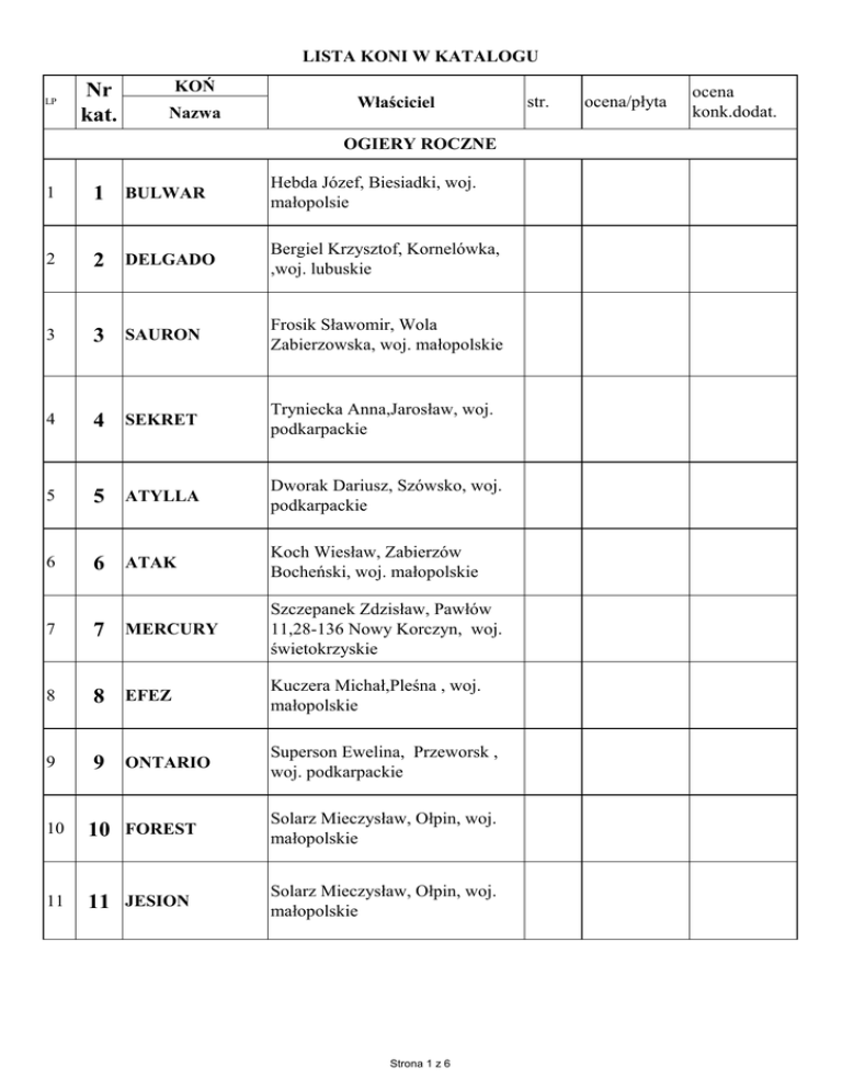 LISTA KONI W KATALOGU LP Nr kat. KOŃ Nazwa Właściciel OGIERY ROCZNE 1 1 BULWAR Hebda Józef, Biesiadki, woj. małopolsie 2 2 DELGADO Bergiel Krzysztof, Kornelówka, ,woj. lubuskie 3 3 SAURON Frosik Sławomir, Wola Zabierzowska, woj. małopolskie 4 4 SEKRET Tryniecka Anna,Jarosław, woj. podkarpackie 5 5 ATYLLA Dworak Dariusz, Szówsko, woj. podkarpackie 6 6 ATAK Koch Wiesław, Zabierzów Bocheński, woj. małopolskie 7 7 MERCURY Szczepanek Zdzisław, Pawłów 11,28-136 Nowy Korczyn, woj. świetokrzyskie 8 8 EFEZ Kuczera Michał,Pleśna , woj. małopolskie 9 9 ONTARIO Superson Ewelina, Przeworsk , woj. podkarpackie 10 10 FOREST Solarz Mieczysław, Ołpin, woj. małopolskie 11 11 JESION Solarz Mieczysław, Ołpin, woj. małopolskie Strona 1 z 6 str. ocena/płyta ocena konk.dodat. LP Nr kat. KOŃ Nazwa Właściciel 12 12 FOKUS Dworak Dariusz, Szówsko, woj. podkarpackie 13 13 FOLKLOR Król Wojciech,Jarosław, woj. podkarpackie 14 14 PEGAZ Dworak Bogusław, Rożniatów, woj. podkarpackie OGIERY DWULETNIE 1 15 JUPITER Bała Zbigniew, Podlesie, woj. małopolskie 2 16 FLAMENCO Kowalski Ireneusz, Jędzrzejów,woj. świętokrzyskie 3 17 BREZIL Hebda Józef, Biesiadki, woj. małopolsie 4 18 APART Zając Tomasz, Myślachowice, woj. malopolskie 5 19 DŻENTELMEN Bieńko Maria, Stalowa Wola, woj. podkarpackie 6 20 HASZIM PPHU Aglas Sp.J.Stadnina Koni w Udorzu, woj. ślaskie 7 21 FORD Dworak Dariusz, Szówsko, woj. podkarpackie 8 22 DEKABRYSTA Bieńko Maria, Stalowa Wola, woj. podkarpackie 9 23 BIRKUT Szczepanek Zdzisław, Pawłów, woj. świetokrzyskie Strona 2 z 6 str. ocena/płyta ocena konk.dodat. LP Nr kat. KOŃ Nazwa Właściciel KLACZE ROCZNE 1 24 ENDORFINA Kuczera Michał,Pleśna , woj. małopolskie 2 25 JESSY Zamiela Artur, Przyborowice, woj. świętokrzyskie 3 26 PERSJA Leksa Gustaw, Skroniów, woj. świętokrzyskie 4 27 MANDALA Bergiel Krzysztof, Kornelówka,woj. lubuskie 5 28 BRITA Dworak Dariusz, Szówsko, woj. podkarpackie 6 29 JAMAJKA Twaróg Józef, Limanowa, woj. małopolskie 7 30 ARMINA Bożek Krzysztof, Bryzdzyń,woj. małopolskie 8 31 PERŁA Dworak Bogusław, Rożniatów, woj. podkarpackie 9 32 MARIHUANA-S Sokołowski Aleksander, Kolonia Sitno, woj. lubelskie 10 33 PILADA Szczepanek Zdzisław, Pawłów, woj. świetokrzyskie 11 34 BALBINA Bała Zbigniew, Podlesie , woj. małopolskie 12 35 DO DIASKA Frosik Sławomir, Wola Zabierzowska, woj. małopolskie 13 36 FLORYSTKA Kowalski Ireneusz, Jędzrzejów,woj. świętokrzyskie 14 37 JAŚMINOWA DAMA Ćwiertniak Henryk, Kraków, woj. małopolskie Strona 3 z 6 str. ocena/płyta ocena konk.dodat. LP KOŃ Nr kat. Nazwa Właściciel KLACZE DWULETNIE 1 38 SATYSFAKCJA Frosik Sławomir, Wola Zabierzowska, woj. małopolskie 2 39 EZRA Kuczera Michał,33-171 Pleśna 43, woj. małopolskie 3 40 CHERRY Pudło Jacek, Miechowice Wielkie, woj. małopolskie 4 41 HISZPANKA Kumięga Jerzy, Wola Lubecka,woj. małopolskie 5 42 MANGALIA Frosik Sławomir, Wola Zabierzowska, woj. małopolskie 6 43 FLORENCJA Ćwiertniak Henryk, Kraków, woj. małopolskie 7 44 SPARTA Bujak Dawid, Żabno, woj. małopolskie 8 45 FALLADA Solarz Mieczysław, Ołpiny , woj. małopolskie 9 46 OSA Superson Ewelina, Przeworsk , woj. podkarpackie 10 47 AURORA Furgał Łukasz, Lubzina, woj. podkarpackie 11 48 LADYLUKRECJA Ćwiertniak Henryk, Kraków, woj. małopolskie 12 49 JUKA Szczpanek Włodzimierz, Parchocin, woj. świętokrzyskie 13 50 JASKÓLKA Szczepanek Zdzisław, Pawłów , woj. świetokrzyskie Strona 4 z 6 str. ocena/płyta ocena konk.dodat. LP Nr kat. KOŃ Nazwa Właściciel KLACZE TRZYLETNIE 1 51 MELISA Bała Zbigniew, Podlesie, woj. małopolskie 2 52 HARISSA PPHU Aglas Sp.J.Stadnina Koni w Udorzu, woj. ślaskie 3 53 JASTIN Szczepanek Ryszard, Parchocin , woj. świętokrzyskie 4 54 DEBORA Marta Michał, Pleśna , woj. małopolskie 5 55 JAWORKA Twaróg Józef,Limanowa , woj. małopolskie 6 56 MARGARET Szczepanek Zdzisław, Pawłów, woj. świetokrzyskie 7 57 AWANGARDA Kumięga Jerzy, Wola Lubecka, woj. małopolskie 8 58 SELAVI Głąb Magdalena, Chyszówki, woj. małopolskie 9 59 SAGITA Tryniecka Anna,Jarosław, woj. podkarpackie 10 60 DENISA Musiał Jacek, Swojczany, woj. małopolskie Strona 5 z 6 str. ocena/płyta ocena konk.dodat. LP Nr kat. KOŃ Nazwa Właściciel SYSAKI 1 61 HAITI Kumięga Jerzy, Wola Lubecka , woj. małopolskie 2 62 JASMINA Twaróg Józef, Limanowa,woj. małopolskie 3 63 JAWOR Solarz Mieczysław, woj. małopolskie 4 64 DENERIS Musiał Jacek, Swojczany, woj. małopolskie 5 65 ARGENTYNA Kumięga Jerzy, Wola Lubecka , woj. małopolskie 6 66 DŻAMILA.M Marta Michał,Pleśna, woj. małopolskie Strona 6 z 6 str. ocena/płyta ocena konk.dodat.