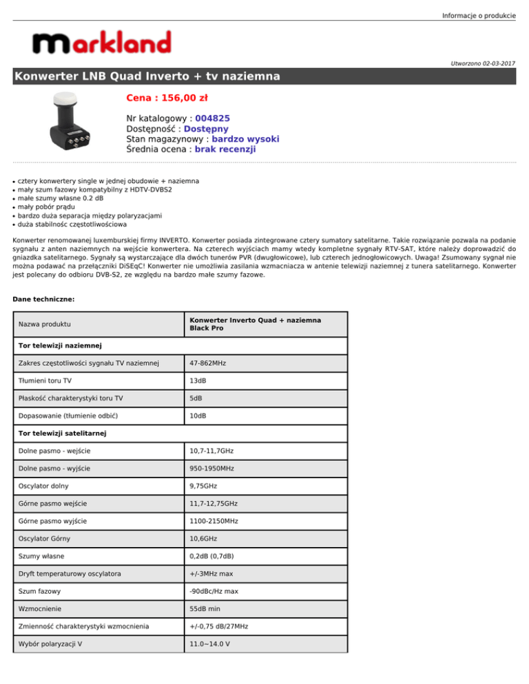 Informacje o produkcie Utworzono 02-03-2017 Konwerter LNB Quad Inverto + tv naziemna Cena : 156,00 zł Nr katalogowy : 004825 Dostępność : Dostępny Stan magazynowy : bardzo wysoki Średnia ocena : brak recenzji ● ● ● ● ● ● cztery konwertery single w jednej obudowie + naziemna mały szum fazowy kompatybilny z HDTV-DVBS2 małe szumy własne 0.2 dB mały pobór prądu bardzo duża separacja między polaryzacjami duża stabilnośc częstotliwościowa Konwerter renomowanej luxemburskiej firmy INVERTO. Konwerter posiada zintegrowane cztery sumatory satelitarne. Takie rozwiązanie pozwala na podanie sygnału z anten naziemnych na wejście konwertera. Na czterech wyjściach mamy wtedy kompletne sygnały RTV-SAT, które należy doprowadzić do gniazdka satelitarnego. Sygnały są wystarczające dla dwóch tunerów PVR (dwugłowicowe), lub czterech jednogłowicowych. Uwaga! Zsumowany sygnał nie można podawać na przełączniki DiSEqC! Konwerter nie umożliwia zasilania wzmacniacza w antenie telewizji naziemnej z tunera satelitarnego. Konwerter jest polecany do odbioru DVB-S2, ze względu na bardzo małe szumy fazowe. Dane techniczne: Nazwa produktu Konwerter Inverto Quad + naziemna Black Pro Tor telewizji naziemnej Zakres częstotliwości sygnału TV naziemnej 47-862MHz Tłumieni toru TV 13dB Płaskość charakterystyki toru TV 5dB Dopasowanie (tłumienie odbić) 10dB Tor telewizji satelitarnej Dolne pasmo - wejście 10,7-11,7GHz Dolne pasmo - wyjście 950-1950MHz Oscylator dolny 9,75GHz Górne pasmo wejście 11,7-12,75GHz Górne pasmo wyjście 1100-2150MHz Oscylator Górny 10,6GHz Szumy własne 0,2dB (0,7dB) Dryft temperaturowy oscylatora +/-3MHz max Szum fazowy -90dBc/Hz max Wzmocnienie 55dB min Zmienność charakterystyki wzmocnienia +/-0,75 dB/27MHz Wybór polaryzacji V 11.0~14.0 V Wybór polaryzacji H 16.0~20.0 V VSWR 2.5:1 Separacja pomiędzy polaryzacjami 25dB min Pobór prądu 120mA max @11~20V Impedancja wyjściowa 75Ohm Temperatura pracy -30...+60C Szerokość szyjki 36,5mm Długość szyjki 40mm Złącze F Masa 234g