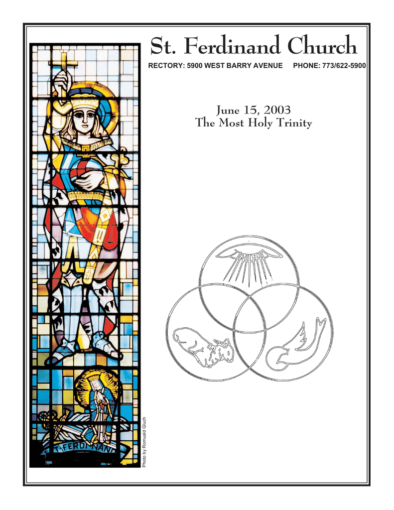 St. Ferdinand Church RECTORY: 5900 WEST BARRY AVENUE PHONE: 773/622-5900 Photo by Romuald Gluch June 15, 2003 The Most Holy Trinity Page Two The Most Holy Trinity June 15, 2003 The sanctuary lamps this week are lit for: +Joseph, Bernice Lewandowski +Alex Ladisa MONDAY, Weekday 7:00 —Betty Strelak rq. Michael & Marcia Bisceglie 8:00 —Betty Pfeiffer rq. Pfeiffer Family TUESDAY, Weekday 7:00 —People of St. Ferdinand 8:00 —Edward & Clary Brixy rq. Edward & Alice Mucha WEDNESDAY, Weekday 7:00 —Mary Gruber rq. Digiralamor Family 8:00 —Joseph Wadycki rq. Daughter, Bernice THURSDAY, Weekday/Romuald, abbot 7:00 —Betty Persichetti rq. Family 8:00 —Martin & Barbara Gurdak & Family rq. Polanski Family FRIDAY, Weekday 7:00 —Vilma Kemp rq. Family & Friends 8:00 —Wac³aw Leszczyñski rq. Ushers Club SATURDAY, Weekday 8:00 —Mary DiOrio rq. Husband 11:00 — Wedding Liturgy Piotr Mol and Alicja Wiszowata 1:00 — Wedding Liturgy Adam D. Skrzyniarz and Ola B. Klimek 3:00 — Wedding Liturgy Matthew C. Tschanz and Julie Anne Seiner Sunday Anticipated Mass 5:00 —Mel Bach rq. Nanci & Natasha SUNDAY, Most Holy Body & Blood of Christ 7:30 —Walter G. Samp rq. Samp Family 7:30 —(Chapel)-o szczêœliw¹ podró¿ i powrót dla Patryka i Eryka; +W³adys³awa Szwab 9:00 —People of St. Ferdinand 10:30 —(Chapel)Edward Pivarcyk rq. Sister-in-Law 10:45 —-dziêkczynna z proœb¹ o dalsze b³og. Bo¿e i potrzebne ³aski dla Doroty; -w 25 rocz.œlubu dziêkczynna z proœb¹ o dalsze ³aski i b³og. Bo¿e dla Teresy i W³adys³awa Podgórny; +Kazimierz Szef, Anna G³¹biñska; +Jan Baran w 12 rocz.œm, Józef, Józefa, Stania³aw, Katarzyna Magiera; +Cecylia Wróbel, Jadwiga Grzyme 12:15 —(Chapel) Mass in Italian 12:30 —Estelle Jamrozik 3:00 —Mass in Polish 5:00 —Margaret Collette rq. Daughter 6:30 —+Janina Spera 2 m-ce po œm. If you would like to present the gifts of bread and wine at Sunday Mass, please see any of the ushers before Mass. They will be very happy to accommodate you. Our Blessed Lord has called home our parishioners Janet A. Rukas, Joseph Maniscalco, Jan Grabiñski and John Cortesi for whom we promise our prayers. May they and all our other deceased parishioners enjoy peace and happiness in God’s Sacred Presence. HANDMAIDS C. Carsello 3rd publication Piotr Mol and Alicja Wiszowata Adam D. Skrzyniarz and Ola B. Klimek Matthew C. Tschanz and Julie Anne Seiner 2nd publication Rafal Kuchyt and Ma³gorzata Pa³ac Michael Cebula and Anna Jakubiak James C. Stout and Carmela S. DeBartolo 1st publication Michal Osiecki and Agata Wrobel Jan Krupa and Aneta Kuczynska Miros³aw Truszkowski and Anika Brachuk Dennis F. Mieszala and Jill E. Bjorgo Szymon Bogacki and Magdalena Pilat Pawe³ Piotr Nowak and Agnieszka Anna Kozio³ Congratulations and best wishes to the couples who were married here last week: Karolina Wiliñska and Krzysztof Siuta Marzena Domagala and Chris Pacocha We pray for God’s blessings on them as they begin their new life together. WE WELCOME IN BAPTISM Brandon Alexander, son of Raul and Sharon (Tayupanta) Basulto; Brian Mathew, son of Raul and Sharon (Tayupanta) Basulto; Savanna Amber, daughter of Raul and Sharon (Tayupanta) Basulto; Kailyn Elizabeth Minas-Beck, daughter of Kevin George Beck and Myla Dosado Minas; Orlando Xavier, son of Orlando Leo and Emma (Perez) Reyes; Carter Patrick, son of Patrick Dockery and Jacqueline (Griffin) Quinn June 15, 2003 The Most Holy Trinity St. Ferdinand Parish to Celebrate Corpus Christi The parish observance of the feast of Corpus Christi will be on Sunday, June 22. Our celebration begins with the 12:15 and 12:30 Masses in both Chapel and Church, followed by a neighborhood procession with the Blessed Sacrament, and Benediction. Mass in Chapel will be in Italian, Mass in Church will be in English and Polish. We hope to involve all of our parish’s organizations, our school children, the First Communicants, and all the religious as well as cultural groups that worship as part of the parish community. All are encouraged to participate in this treasure of our Catholic heritage. There is a space in the procession for everyone. As members of the parish faith community, it is our responsibility to remember both in concrete and spiritual ways those who cannot celebrate with us each week because they are ill. Those who are sick in turn, remember all of us daily in their prayers and in their sufferings. We experience many blessings because of their remembering us. And so ... please remember in your prayers: READINGS FOR THE WEEK Monday: Tuesday: Wednesday: Thursday: Friday: Saturday: Sunday: Page Three 2 Cor 6:1-10; Mt 5:38-42 2 Cor 8:1-9; Mt 5:43-48 2 Cor 9:6-11; Mt 6:1-6, 16-18 2 Cor 11:1-11; Mt 6:7-15 2 Cor 11:18, 21b-30; Mt 6:19-23 2 Cor 12:1-10; Mt 6:24-34 Ex 24:3-8; Ps 116; Heb 9:11-15 Mk 14:12-16, 22-26 Joseph Balicki Timothy Benson Albin Bilinski Arlene Bilinski Stephanie Bosco Gabriella Bragagnolo Alba Jennie Burroughs Benito Cabanin Claudio Clemente Bishop Edwin Conway Gayle DeBortoli Anna Diks Honor Draftz Lillian Dziedzic Fred Forte Joseph Gagliano Fatima Gomez Rocco Greco Ben Guttiula Mary Hain Judith Hodolitz Mary Ann Johansen Catherine Keeler Stanley Kochniarczyk Helen Kosirog Tad Koziol June Landers James Lamberti Sam LoDolce Netta Lohrmann Eleanor Loscuito Elizabeth Ann Maher Susan Maher Francesco Mangialardo Mary Martin Estelle “Toots” McGuigan Emilia Moreno Eleanor O’Donovan Dan Oliver, Jr. Deborah L. Pawlak Timothy Rajski Sophie Regner Alicia Schippits Jack Schneider Infant Cameron Scott Robert Sierminski Lenore Simzyk Raymundo Soriano, Sr. Tony Spano Estelle Stybur Ann Sullivan Minerva Watson We are children of God, and if children, then heirs, heirs of God and joint heirs with Christ. — Romans 8:16-17 Our Financial Support of St. Ferdinand Parish Through your stewardship, the people of St. Ferdinand Parish contributed 13,589.16 in the regular offertory collection last weekend. This total was an i
