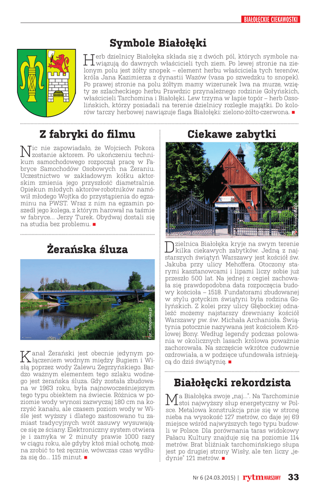 białołęckie ciekawostki H Symbole Białołęki erb dzielnicy Białołęka składa się z dwóch pól, których symbole nawiązują do dawnych właścicieli tych ziem. Po lewej stronie na zielonym polu jest żółty snopek – element herbu właściciela tych terenów, króla Jana Kazimierza z dynastii Wazów (vasa po szwedzku to snopek). Po prawej stronie na polu żółtym mamy wizerunek lwa na murze, wzięty ze szlacheckiego herbu Prawdzic przynależnego rodzinie Gołyńskich, właścicieli Tarchomina i Białołęki. Lew trzyma w łapie topór – herb Ossolińskich, którzy posiadali na terenie dzielnicy rozległe majątki. Do kolorów tarczy herbowej nawiązuje flaga Białołęki: zielono-żółto-czerwona. n N Z fabryki do filmu Ciekawe zabytki D Fot.: fotopolska.pl Żerańska śluza K Fot.: fotopolska.pl ic nie zapowiadało, że Wojciech Pokora zostanie aktorem. Po ukończeniu technikum samochodowego rozpoczął pracę w Fabryce Samochodów Osobowych na Żeraniu. Uczestnictwo w zakładowym kółku aktorskim zmienia jego przyszłość diametralnie. Opiekun młodych aktorów-robotników namówił młodego Wojtka do przystąpienia do egzaminu na PWST. Wraz z nim na egzamin poszedł jego kolega, z którym harował na taśmie w fabryce… Jerzy Turek. Obydwaj dostali się na studia bez problemu. n anał Żerański jest obecnie jedynym połączeniem wodnym między Bugiem i Wisłą poprzez wody Zalewu Zegrzyńskiego. Bardzo ważnym elementem tego szlaku wodnego jest żerańska śluza. Gdy została zbudowana w 1963 roku, była najnowocześniejszym tego typu obiektem na świecie. Różnica w poziomie wody wynosi zazwyczaj 180 cm na korzyść kanału, ale czasem poziom wody w Wiśle jest wyższy i dlatego zastosowano tu zamiast tradycyjnych wrót zasuwy wysuwające się ze ściany. Elektroniczny system otwiera je i zamyka w 2 minuty prawie 1000 razy w ciągu roku, ale gdyby ktoś miał ochotę, można zrobić to też ręcznie, wówczas czas wydłuża się do… 115 minut. n zielnica Białołęka kryje na swym terenie kilka ciekawych zabytków. Jedną z najstarszych świątyń Warszawy jest kościół św. Jakuba przy ulicy Mehoffera. Otoczony starymi kasztanowcami i lipami liczy sobie już przeszło 500 lat. Na jednej z cegieł zachowała się prawdopodobna data rozpoczęcia budowy kościoła – 1518. Fundatorami zbudowanej w stylu gotyckim świątyni była rodzina Gołyńskich. Z kolei przy ulicy Głębockiej odnaleźć możemy najstarszy drewniany kościół Warszawy pw. św. Michała Archanioła. Świątynia potocznie nazywana jest kościołem Królowej Bony. Według legendy podczas polowania w okolicznych lasach królowa poważnie zachorowała. Na szczęście wkrótce cudownie ozdrowiała, a w podzięce ufundowała istniejącą do dziś świątynię. n Białołęcki rekordzista M a Białołęka swoje „naj…”. Na Tarchominie stoi najwyższy słup energetyczny w Polsce. Metalowa konstrukcja pnie się w stronę nieba na wysokość 127 metrów, co daje jej 69 miejsce wśród najwyższych tego typu budowli w Polsce. Dla porównania taras widokowy Pałacu Kultury znajduje się na poziomie 114 metrów. Brat bliźniak tarchomińskiego słupa jest po drugiej strony Wisły, ale ten liczy „jedynie” 121 metrów. n Nr 6 (24.03.2015) | rytmWarszawy 33