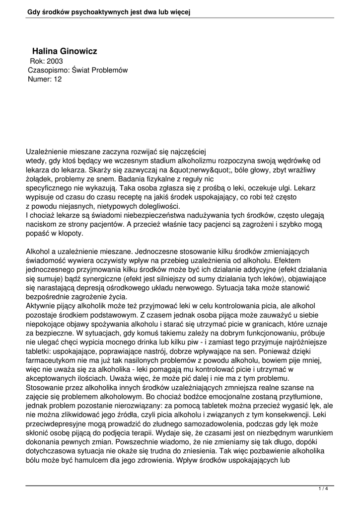 Gdy środków psychoaktywnych jest dwa lub więcej Halina Ginowicz Rok: 2003 Czasopismo: Świat Problemów Numer: 12 Uzależnienie mieszane zaczyna rozwijać się najczęściej wtedy, gdy ktoś będący we wczesnym stadium alkoholizmu rozpoczyna swoją wędrówkę od lekarza do lekarza. Skarży się zazwyczaj na "nerwy", bóle głowy, zbyt wrażliwy żołądek, problemy ze snem. Badania fizykalne z reguły nic specyficznego nie wykazują. Taka osoba zgłasza się z prośbą o leki, oczekuje ulgi. Lekarz wypisuje od czasu do czasu receptę na jakiś środek uspokajający, co robi też często z powodu niejasnych, nietypowych dolegliwości. I chociaż lekarze są świadomi niebezpieczeństwa nadużywania tych środków, często ulegają naciskom ze strony pacjentów. A przecież właśnie tacy pacjenci są zagrożeni i szybko mogą popaść w kłopoty. Alkohol a uzależnienie mieszane. Jednoczesne stosowanie kilku środków zmieniających świadomość wywiera oczywisty wpływ na przebieg uzależnienia od alkoholu. Efektem jednoczesnego przyjmowania kilku środków może być ich działanie addycyjne (efekt działania się sumuje) bądź synergiczne (efekt jest silniejszy od sumy działania tych leków), objawiające się narastającą depresją ośrodkowego układu nerwowego. Sytuacja taka może stanowić bezpośrednie zagrożenie życia. Aktywnie pijący alkoholik może też przyjmować leki w celu kontrolowania picia, ale alkohol pozostaje środkiem podstawowym. Z czasem jednak osoba pijąca może zauważyć u siebie niepokojące objawy spożywania alkoholu i starać się utrzymać picie w granicach, które uznaje za bezpieczne. W sytuacjach, gdy komuś takiemu zależy na dobrym funkcjonowaniu, próbuje nie ulegać chęci wypicia mocnego drinka lub kilku piw - i zamiast tego przyjmuje najróżniejsze tabletki: uspokajające, poprawiające nastrój, dobrze wpływające na sen. Ponieważ dzięki farmaceutykom nie ma już tak nasilonych problemów z powodu alkoholu, bowiem pije mniej, więc nie uważa się za alkoholika - leki pomagają mu kontrolować picie i utrzymać w akceptowanych ilościach. Uważa więc, że może pić dalej i nie ma z tym problemu. Stosowanie przez alkoholika innych środków uzależniających zmniejsza realne szanse na zajęcie się problemem alkoholowym. Bo chociaż bodźce emocjonalne zostaną przytłumione, jednak problem pozostanie nierozwiązany: za pomocą tabletek można przecież wygasić lęk, ale nie można zlikwidować jego źródła, czyli picia alkoholu i związanych z tym konsekwencji. Leki przeciwdepresyjne mogą prowadzić do złudnego samozadowolenia, podczas gdy lęk może skłonić osobę pijącą do podjęcia terapii. Wydaje się, że czasami jest on niezbędnym warunkiem dokonania pewnych zmian. Powszechnie wiadomo, że nie zmieniamy się tak długo, dopóki dotychczasowa sytuacja nie okaże się trudna do zniesienia. Tak więc pozbawienie alkoholika bólu może być hamulcem dla jego zdrowienia. Wpływ środków uspokajających lub 1/4 Gdy środków psychoaktywnych jest dwa lub więcej podnoszących nastrój może powodować, że kontynuowanie dotychczasowego sposobu życia oczywiście wraz z piciem alkoholu - może wydawać się całkiem realne. Kim są tacy pacjenci? Jak szacują Amerykanie, wśród osób chcących leczyć się z powodu alkoholizmu około 40% nadużywa też innych substancji [1]. Zaobserwowano ponadto, że pacjenci zgłaszający się na terapię, którzy nadużywają jedynie alkoholu, są zdecydowanie starsi i pozostają częściej w trwałych związkach małżeńskich lub konkubinatach niż osoby, które piły alkohol i zażywały jednocześnie kokainę. Wyłącznie alkoholowi pacjenci w czasie przyjęcia do szpitala zgłaszali dłuższe okresy picia i większe problemy alkoholowe. W przeszłości mieli bardziej nasilone objawy psychiatryczne. Nie ma ogólnopolskich badań, poświęconych epidemiologii używania krzyżowego lub mieszania ze sobą substancji psychoaktywnych. Poradnia Towarzystwa "Powrót z U" w Toruniu udostępniła w internecie swoje dane o pacjentach [2]: najczęściej wykrywanym narkotykiem w I kwartale 2003 roku była wśród nich marihuana, stanowiła 31% wszystkich przypadków; inne używane substancje odurzające to: alkohol, nikotyna, kleje, amfetamina, LSD, speed, heroina i leki. Coraz częstym zjawiskiem także wśród pacjentów ich poradni jest uzależnienie mieszane. Dotyczy ono w większości ludzi młodych, w wieku 16-19 lat. Do najczęstszym połączeń należą: marihuana i amfetamina, alkohol i nikotyna, alkohol i amfetamina Na Całodobowym Oddziale Terapii Uzależnienia od Alkoholu SP ZOZ w Łukowie najczęściej spotykane jest połączenie alkoholu z benzodiazepinami. Na drugim miejscu są opiaty lub opioidy plus alkohol. Pozostałe powiązania występowały w pojedynczych przypadkach. Nie można podać dokładniejszych danych, gdyż nie prowadzono systematycznych obserwacji, nastawionych na monitorowanie tego zjawiska. Terapia. Obserwacje polskich placówek odwykowych pokazują, że pacjenci z mieszanymi uzależnieniami są niezbyt chętnie przyjmowani na leczenia. Wielu terapeutów chciałoby uniknąć pracy z taką osobą. Często czują się bezradni, sfrustrowani niepowodzeniami terapii z nimi. Czemu się tak dzieje? Najczęściej zbyt mało wiemy o zjawiskach towarzyszących przyjmowaniu dwóch lub więcej środków psychoaktywnych. O ile nieźle orientujemy się w sprawach wpływu pojedynczego środka na organizm i funkcjonowanie psychologiczne, to z mieszanką sobie nie radzimy. Detoksykacja takich pacjentów jest bardziej skomplikowana i tylko nieliczne ośrodki właściwie monitorują ten proces. Zdarza się dosyć często, że pacjent uzależniony od alkoholu i benzodiazepiny trafia po odtruciu do placówki prowadzącej psychoterapię z receptą na środki uspokajające o dawce identycznej jak ta sprzed leczenia. Próby wprowadzenia "opcji zerowej" dla leków kończą się cz