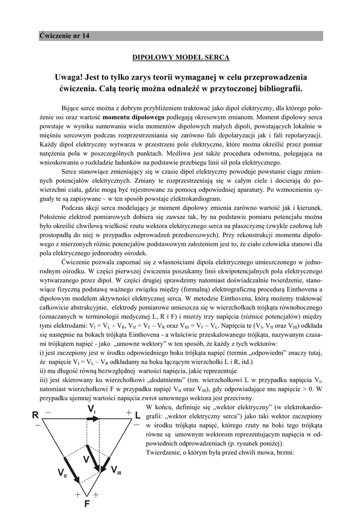 Ćwiczenie nr 14 DIPOLOWY MODEL SERCA Uwaga! Jest to tylko zarys teorii wymaganej w celu przeprowadzenia ćwiczenia. Całą teorię można odnaleźć w przytoczonej bibliografii. Bijące serce można z dobrym przybliżeniem traktować jako dipol elektryczny, dla którego położenie osi oraz wartość momentu dipolowego podlegają okresowym zmianom. Moment dipolowy serca powstaje w wyniku sumowania wielu momentów dipolowych małych dipoli, powstających lokalnie w mięśniu sercowym podczas rozprzestrzeniania się zarówno fali depolaryzacji jak i fali repolaryzacji. Każdy dipol elektryczny wytwarza w przestrzeni pole elektryczne, które można określić przez pomiar natężenia pola w poszczególnych punktach. Możliwa jest także procedura odwrotna, polegająca na wnioskowaniu o rozkładzie ładunków na podstawie przebiegu linii sił pola elektrycznego. Serce stanowiące zmieniający się w czasie dipol elektryczny powoduje powstanie ciągu zmiennych potencjałów elektrycznych. Zmiany te rozprzestrzeniają się w całym ciele i docierają do powierzchni ciała, gdzie mogą być rejestrowane za pomocą odpowiedniej aparatury. Po wzmocnieniu sygnały te są zapisywane – w ten sposób powstaje elektrokardiogram. Podczas akcji serca modelujący je moment dipolowy zmienia zarówno wartość jak i kierunek. Położenie elektrod pomiarowych dobiera się zawsze tak, by na podstawie pomiaru potencjału można było określić chwilową wielkość rzutu wektora elektrycznego serca na płaszczyznę (zwykle czołową lub prostopadłą do niej w przypadku odprowadzeń przedsercowych). Przy rekonstrukcji momentu dipolowego z mierzonych różnic potencjałów podstawowym założeniem jest to, że ciało człowieka stanowi dla pola elektrycznego jednorodny ośrodek. Ćwiczenie pozwala zapoznać się z własnościami dipola elektrycznego umieszczonego w jednorodnym ośrodku. W części pierwszej ćwiczenia poszukamy linii ekwipotencjalnych pola elektrycznego wytwarzanego przez dipol. W części drugiej sprawdzimy natomiast doświadczalnie twierdzenie, stanowiące fizyczną podstawę ważnego związku między (formalną) elektrograficzną procedurą Einthovena a dipolowym modelem aktywności elektrycznej serca. W metodzie Einthovena, którą możemy traktować całkowicie abstrakcyjnie, elektrody pomiarowe umieszcza się w wierzchołkach trójkąta równobocznego (oznaczanych w terminologii medycznej L, R i F) i mierzy trzy napięcia (różnice potencjałów) między tymi elektrodami: VI = VL – VR, VII = VF – VR oraz VIII = VF – VL. Napięcia te (VI, VII oraz VIII) odkłada się następnie na bokach trójkąta Einthovena - a właściwie przeskalowanego trójkąta, nazywanym czasami trójkątem napięć - jako „umowne wektory” w ten sposób, że każdy z tych wektorów: i) jest zaczepiony jest w środku odpowiedniego boku trójkąta napięć (termin „odpowiedni” znaczy tutaj, że napięcie VI = VL – VR odkładamy na boku łączącym wierzchołki L i R, itd.) ii) ma długość równą bezwzględnej wartości napięcia, jakie reprezentuje iii) jest skierowany ku wierzchołkowi „dodatniemu” (tzn. wierzchołkowi L w przypadku napięcia VI, natomiast wierzchołkowi F w przypadku napięć VII oraz VIII), gdy odpowiadające mu napięcie > 0. W przypadku ujemnej wartości napięcia zwrot umownego wektora jest przeciwny. W końcu, definiuje się „wektor elektryczny” (w elektrokardiografii: „wektor elektryczny serca”) jako taki wektor zaczepiony w środku trójkąta napięć, którego rzuty na boki tego trójkąta równe są umownym wektorom reprezentującym napięcia w odpowiednich odprowadzeniach (p. rysunek poniżej). Twierdzenie, o którym była przed chwili mowa, brzmi: Jeśli w środku trójkąta Einthovena znajduje się (posiadający pewien moment dipolowy) dipol elektryczny leżący w płaszczyźnie tego trójkąta, to wektor jego momentu dipolowego jest zawsze wprost proporcjonalny do wektora elektrycznego wyznaczonego w trójkącie napięć (w szczególności oba wektory mają zawsze taki sam kierunek i zwrot). Konstrukcja Einthovena: zmierzone napięcia VI, VII oraz VIII odkładamy w postaci umownych wektorów na odpowiednich bokach trójkąta napięć, następnie wykreślamy – zaczepiony w środku trójkąta - wektor elektryczny. Jeśli źródłem pola elektrycznego wywołującego różnice potencjałów między wierzchołkami trójkąta jest dipol elektryczny leżący w płaszczyźnie trójkąta i zaczepiony w jego środku, to moment dipolowy tego dipola („niewidocznego” w badaniu EKG!) ma taki sam kierunek i zwrot jak wyznaczony doświadczalnie wektor elektryczny (wartości obu wektorów są do siebie proporcjonalne). Tak więc, na podstawie pomiaru różnic potencjałów (napięć) pochodzących od dipola o znanym punkcie zaczepienia można jednoznacznie określić wektor momentu dipolowego tego dipola -wykorzystujemy to w elektrokardiografii, wnioskując o orientacji, jak i wartości, składowej momentu dipolowego serca na podstawie pomiaru napięć Einthovena!. Symulację takiej procedury elektrokardiograficznej przeprowadzimy w drugiej części ćwiczenia. Wymagane wiadomości teoretyczne 1. Fizyczne modele elektrycznej aktywności serca: -model źródła prądowego -model dipolowy 2. Porównanie przebiegu potencjału czynnościowego komórki mięśnia serca oraz komórki nerwowej (z wyjaśnieniem przyczyn występujących różnic). 3. Ośrodki automatyzmu w sercu. 4. Idea elektrokardiografii, trójkąt Einthovena, dwubiegunowe odprowadzenia Einthovena (VI, VII i VIII) oraz geometryczne wyznaczanie rzutu wektora elektrycznego serca na płaszczyznę czołową. 5. Znajomość podstawowych pojęć dotyczących elektrostatyki i elektryczności: potencjału, natężenia pola elektrycznego, momentu dipolowego, siły elektromotorycznej. Zalecana literatura 1. S. Miękisz, A. Hendrich, „Wybrane zagadnienia z biofizyki”, Volumed, Wrocław 1998. 2. Ćwiczenia la