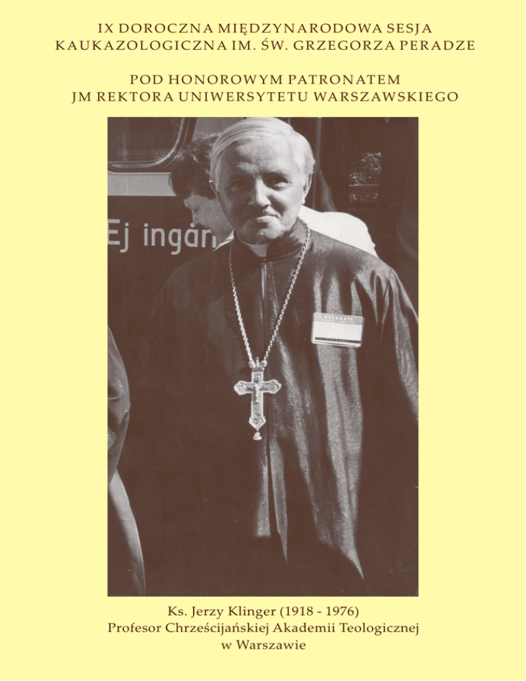 I X D O R O C Z N A M I Ę D Z Y N A R O D O WA S E S J A K A U K A Z O L O G I C Z N A I M . Ś W. G R Z E G O R Z A P E R A D Z E P O D H O N O R O W Y M PAT R O N AT E M J M R E K T O R A U N I W E R S Y T E T U WA R S Z AW S K I E G O Ks. Jerzy Klinger (1918 - 1976) Profesor Chrześcijańskiej Akademii Teologicznej w Warszawie Studium Europy Wschodniej Uniwersytetu Warszawskiego ma zaszczyt zaprosić na IX DOROCZNĄ MIĘDZYNARODOWĄ S E S J Ę K A U K A Z O L O G I C Z N Ą I M. Ś W. G R Z E G O R Z A P E R A D Z E przedwojennego profesora Uniwersytetu Warszawskiego W uroczystości wezmą udział: Władze Uniwersytetu Warszawskiego; Państwowego Uniwersytetu w Tbilisi; JE Wielce Błogosławiony S A W A, Prawosławny Metropolita Warszawski i całej Polski; JE Metropolita G E R A S I M E (Sharashenidze), Patriarchat Kościoła Gruzińskiego; JE Metropolita A N D R I A (Gvazava), Patriarchat Kościoła Gruzińskiego; ministrowie; ambasadorowie oraz wielu innych znakomitych gości Poniedziałek, 6 grudnia 2010 8.00 Liturgia w Punkcie Duszpasterskim p.w. św. męczennika Archimandryty Grzegorza (ul. Wilcza 31, Warszawa) 16.45 Złożenie kwiatów pod tablicą na ścianie gmachu Instytutu Historycznego upamiętniającą pomordowanych w czasie II wojny światowej profesorów Uniwersytetu Warszawskiego, wśród nich Ś W. G R Z E G O R Z A P E R A D Z E (Campus UW, ul. Krakowskie Przedmieście 26/28) Zaśpiewa Chór z Prawosławnego Punktu Duszpasterskiego p.w. św. męczennika Archimandryty Grzegorza pod dyrekcją Anny Czerewackiej PRO G RAM Poniedziałek, 6 grudnia 2010 17.00-19.30 Sala Senatu, Pałac Kazimierzowski „AKADEMIA KU CZCI KS. JERZEGO KLINGERA, ŚW. GRZEGORZA PERADZE ORAZ DLA UCZCZENIA 50-TEJ ROCZNICY ŚMIERCI METROPOLITY DIONIZEGO WALEDYŃSKIEGO” Powitanie przybyłych gości i uczestników konferencji: Prof. Katarzyna C H A Ł A S I Ń S K A - M A C U K O W Rektor Uniwersytetu Warszawskiego Dyr. Jan M A L I C K I, Studium Europy Wschodniej UW Wykład inauguracyjny: Ks. Prof. Wacław H R Y N I E W I C Z, Katolicki Uniwersytet Lubelski Teolog czasów dialogu: refleksje o twórczości ks. Jerzego Klingera Wystąpienia specjalne: Ks. Henryk P A P R O C K I, Uniwersytet w Białymstoku Ks. Jerzy Klinger i Jerzy Nowosielski: dzieje przyjaźni Dawid K O L B A I A, Uniwersytet Warszawski Metropolita Dionizy (Waledyński) i św. Grzegorz Peradze – działalność na przedwojennym Uniwersytecie Warszawskim Wydarzenie specjalne: Wręczenie pierwszych Nagród Św. Grzegorza Peradze Ks. Henrykowi Paprockiemu oraz Janowi Malickiemu Rada Naukowa „Pro Georgia” Uniwersytetu Warszawskiego oraz Rektor i Senat University of Georgia, Tbilisi Prezentacja: Wojciech M A T E R S K I, Gruzja, seria: Historia państwa świata XX i XXI w., Wydawnictwo TRIO, Warszawa 2010; Św. Grzegorz P E R A D Z E, Dzieła Zebrane, O monastycyzmie gruzińskim, O liturgii gruzińskiej, t. 1, pod red. Henryka Paprockiego, Studium Europy Wschodniej UW, Warszawa 2010; „Pro Georgia. Journal of Kartvelological Studies”, t. 20, Studium Europy Wschodniej UW, Warszawa 2010; Wojciech G Ó R E C K I, Toast za przodków, Wydawnictwo Czarne, Wołowiec 2010 Otwarcie wystawy: „Projekty witraży Jerzego Nowosielskiego” Michał B O G U C K I, Muzeum Ikon w Warszawie Lampka gruzińskiego wina, dzięki uprzejmości Winiarni Marani (filia w Warszawie), założonej w 1915 r. w gruzińskim regionie Kachetia, słynącym z produkcji wina Wtorek, 7 grudnia 2010 10.00-14.00 Sala Senatu, Pałac Kazimierzowski SESJA I „D Z I E D Z I C T W O N A U K O W E Ś W. G R Z E G O R Z A P E R A D Z E” Moderator: Ks. Henryk P A P R O C K I, Uniwersytet w Białymstoku Arcybiskup A N D R I A (Patriarchat Kościoła Gruzińskiego) Некоторые богословские вопросы Иверского Петрицонского (Бачковского) монястиря Григоля Бакурянидзе (Niektóre zagadnienia błogosławieństw Iwerskiego Petricońskiego (Baczkowskiego) klasztoru Grzegorza Bakurianidze) Manana S A N A D Z E (University of Georgia, Tbilisi) Mirian – the First King of Kartli and Issue of His Descent (Mirian - pierwszy król Kartli i zagadnienia jego dziedzictwa Igor D O R F M A N N - L A Z A R E V (Uniwersytet Londyński) Travels and Studies of Stephen of Siwnik' (685 c. – 735): Re-defining Armenian Orthodoxy under Islamic Rule (Podróże i badania Stefana z Siwnik (685 – 735 ): redefinicja ormiańskiego prawosławia pod rządami islamskimi) O. Opat Bernard S A W I C K I OSB (Opactwo Benedyktynów w Tyńcu) Bliskości i różnice tradycji chrześcijańskiego monastycyzmu Wschodu i Zachodu Darejan T V A L T V A D Z E (Uniwersytet im. Ivane Javakhishvili w Tbilisi) Некоторые аспекты грузинско-византийских культурных отношений на основе колофонов грузинских переписчиков из Антиохии (Pewne aspekty gruzińsko-bizantyjskich kontaktów kulturalnych na podstawie kolofonów gruzińskich skrybów z Antiochii) Tamila M G A L O B L I S H V I L I (Uniwersytet Św. Andrzeja Patriarchatu Gruzińskiego, Tbilisi) Mtskheta – New Jerusalem in Georgia (Mccheta – Nowe Jeruzalem w Gruzji) Nikoloz A L E K S I D Z E (Pembroke College, Oksford) Monasticism and Christological Controversy in Sixth-Century Caucasus (Monastycyzm i spory chrystologiczne w VI w. na Kaukazie) Dawid K O L B A I A (Uniwersytet Warszawski) Przedstawienie Piekła i Sądu Ostatecznego w średniowiecznej gruzińskiej ikonografii Aleksandra S U L I K O W S K A - G Ą S K A (Uniwersytet Warszawski) Losy ciała. Ortodoksyjna literatura i tradycja ikonograficzna Dyskusja 14.00- 15.00 Przerwa na obiad 15.00-18.00 Sala Senatu, Pałac Kazimierzowski SESJA II Moderator: Dawid K O L B A I A, Uniwersytet Warszawski Antoni M I R O N O W I C Z (Uniwersytet w Białymstoku) Ks. Jerzy Klinger jako badacz dziejów Prawosławia Michał K L I N G E R (Chrze