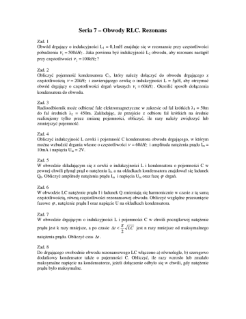 Seria 7 – Obwody RLC. Rezonans Zad. 1 Obwód drgający o indukcyjności L1 = 0,1mH znajduje się w rezonansie przy częstotliwości pobudzenia ν 1 = 500kHz . Jaka powinna być indukcyjność L2 obwodu, aby rezonans nastąpił przy częstotliwości ν 2 = 100kHz ? Zad. 2 Obliczyć pojemność kondensatora C1, który należy dołączyć do obwodu drgającego z częstotliwością ν = 20kHz i zawierającego cewkę o indukcyjności L = 5µH, aby otrzymać obwód drgający o częstotliwości drgań własnych ν 1 = 60kHz . Określić sposób dołączenia kondensatora do obwodu. Zad. 3 Radioodbiornik może odbierać fale elektromagnetyczne w zakresie od fal krótkich λ1 = 50m do fal średnich λ2 = 450m. Zakładając, że przejście z odbioru fal krótkich na średnie realizujemy tylko przez zmianę pojemności, obliczyć, ile razy należy zwiększyć lub zmniejszyć pojemność. Zad. 4 Obliczyć indukcyjność L cewki i pojemność C kondensatora obwodu drgającego, w którym można wzbudzić drgania własne o częstotliwości ν = 60kHz i amplituda natężenia prądu Im = 10mA i napięcia Um = 2V. Zad. 5 W obwodzie składającym się z cewki o indukcyjności L i kondensatora o pojemności C w pewnej chwili płynął prąd o natężeniu I0, a na okładkach kondensatora znajdował się ładunek Q0. Obliczyć amplitudy natężenia prądu Im i napięcia Um oraz fazę ϕ drgań. Zad. 6 W obwodzie LC natężenie prądu I i ładunek Q zmieniają się harmonicznie w czasie z tą samą częstotliwością, równą częstotliwości rezonansowej obwodu. Obliczyć względne przesunięcie fazowe ϕ , natężenie prądu I oraz napięcie U na okładkach kondensatora. Zad. 7 W obwodzie drgającym o indukcyjności L i pojemności C w chwili początkowej natężenie prądu jest k razy mniejsze, a po czasie ∆t < π 2 LC jest n razy mniejsze od maksymalnego natężenia prądu. Obliczyć czas ∆t . Zad. 8 Do drgającego swobodnie obwodu rezonansowego LC włączono a) równolegle, b) szeregowo dodatkowy kondensator także o pojemności C. Obliczyć, ile razy wzrosło lub zmalało maksymalne napięcie na kondensatorze, jeżeli dołączenie odbyło się w chwili, gdy natężenie prądu było maksymalne.