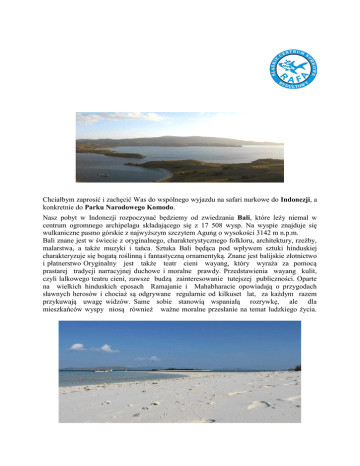 Chciałbym zaprosić i zachęcić Was do wspólnego wyjazdu na safari nurkowe do Indonezji, a konkretnie do Parku Narodowego Komodo. Nasz pobyt w Indonezji rozpoczynać będziemy od zwiedzania Bali, które leży niemal w centrum ogromnego archipelagu składającego się z 17 508 wysp. Na wyspie znajduje się wulkaniczne pasmo górskie z najwyższym szczytem Agung o wysokości 3142 m n.p.m. Bali znane jest w świecie z oryginalnego, charakterystycznego folkloru, architektury, rzeźby, malarstwa, a także muzyki i tańca. Sztuka Bali będąca pod wpływem sztuki hinduskiej charakteryzuje się bogatą roślinną i fantastyczną ornamentyką. Znane jest balijskie złotnictwo i płatnerstwo Oryginalny jest także teatr cieni wayang, który wyraża za pomocą prastarej tradycji narracyjnej duchowe i moralne prawdy. Przedstawienia wayang kulit, czyli lalkowego teatru cieni, zawsze budzą zainteresowanie tutejszej publiczności. Oparte na wielkich hinduskich eposach Ramajanie i Mahabharacie opowiadają o przygodach sławnych herosów i chociaż są odgrywane regularnie od kilkuset lat, za każdym razem przykuwają uwagę widzów. Same sobie stanowią wspaniałą rozrywkę, ale dla mieszkańców wyspy niosą również ważne moralne przesłanie na temat ludzkiego życia. Bali zachwyca swoją różnorodnością i możliwościami spędzania wolnego czasu. Znajdziecie tu Państwo wspaniałe plaże zachwycające białym piaskiem i krystalicznie czystą wodą, mistyczne świątynie, malownicze tarasy ryżowe, góry, jeziora, wulkany, bogatą kulturę i sztukę. W czasie Naszego pobytu na Bali zaplanowaliśmy także nurkowania. min na wraku U.S.A.T „Liberty” w Tulamben, jak również nurkowanie z mitycznymi rybami Mola-Mola W piątym dniu Naszego pobytu udamy się na Flores . Ta długa na 360km. a szeroka na 12-70km licząca 1,5 miliona mieszkańców wyspa, jest jedną z największych w archipelagu Nusa Tenggara w południowo-wschodniej Indonezji Flores zasłynie z tkanin wykonywanych tradycyjnymi metodami. Tkaniny te – ikaty, zróżnicowane są ze względu na wielkość, kolorystykę, motywy i jakość. Mieszkańcy Flores rozpoznają z jakiej części wyspy pochodzi dany ikat, a praktyczne w każdej z wiosek można podpatrzyć metodę ich wyrobu trwającą czasem wiele miesięcy, obserwować piękne sarongi noszone na co dzień owinięte dokoła pasa lub wręcz dokoła całego ciała przy chłodniejszej pogodzie. Tutaj zaokrętujemy się na łódź o wdzięcznej nazwie Lalunia, która zabierze Nas na 5-dniowe safari po parku narodowym Komodo a w szczególności w jego najpiękniejszą część cieśninę Lintah. Kilka słów o samym Komodo. Komodo- Indonezyjska nazwa Pulau Komodo to jedna z wysp archipelagu Małe Wyspy Sundajskie pomiędzy wyspami Sumbawa i Flores; Otoczona przez: morze Flores (od północy), cieśninę Lintah (od wschodu), cieśninę Sumba (od południa) i cieśninę Sape (od zachodu) posiada bardzo rozwiniętą linia brzegowa. Na świecie Komodo słynie z swych nietypowych mieszkańców a mianowicie „smoków z Komodo” Ten endemiczny gatunek warana to, największa jaszczurka na świecie i to właśnie w celu jej ochrony utworzono Park Narodowy Komodo (PKA Balai Taman Nasional Komodo). PLAN WYJAZDU: 07 września -Dzień -1. Wylot z Warszawy. 08 września -Dzień -2. Przylot do Denpasar-transfer i zakwaterowanie w hotelu. 09 września -Dzień -3. 2 nurkowania Gili Mimpang i Gili Tepekong (Mola-Mola). 10 września -Dzień -4. Całodzienna wyprawa do Tulamben. 3 nurkowania U.S.A.T.”Liberty 11 września -Dzień -5. Zwiedzanie Bali. Nocleg Candidasa 12 września -Dzień -6. Zwiedzanie Bali. Nocleg Candidasa 13 września -Dzień -7. Przejazd do Denpasar. Przelot do Labuan Bajo, zamustrowanie na łódż safari, Nocleg na łodzi. 14 września -Dzień -8. 3 nurkowania w rejonie Komodo. nocleg na łodzi. 15 września -Dzień -9. 3 nurkowania w rejonie Komodo. nocleg na łodzi. 16 września -Dzień -10. 3 nurkowania w rejonie Komodo. nocleg na łodzi. 17 września -Dzień -11. 3 nurkowania w rejonie Komodo. nocleg na łodzi. 18 września -Dzień -12. 2 nurkowania w rejonie Komodo. Podróż na Komodo lub Rinca. Spotkanie z waranami. Powrót do zatoki Labuan Bajo. Nocleg na łodzi 19 września -Dzień -13. Przelot do Denpasar. Transfer do Hotelu. 20 września -Dzień -14. Transfer na lotnisko. Wylot do Polski 21 września -Dzień -15. Przylot do kraju. Podstawowa cena wyprawy to 2550 USD plus 4500 PLN ( cena PLN będzie zależna od wzrostu cen biletów lotniczych – na chwil obecną to około 3300 PLN) Modyfikacje ceny: • Osoba nienurkująca - minus 400 USD • Dopłata za pokój 1-osobowy – plus 700 USD, • cena może ulegać zmianom w zależności od aktualnych cen przelotów. Cena zawiera: • wszystkie przeloty na trasie Warszawa –Denpasar – Warszawa, • przelot na trasie Denpasar – Labuan Bajo – Denpasar • transfery wewnętrzne z/na lotnisko w Denpasar i labuan Bajo • zakwaterowanie w pokojach dwuosobowych – • śniadania w czasie pobytu w Candidasa • kompletne wyżywienie w czasie safari nurkowego – w postaci śniadań, obiadów i kolacji na łodzi. do tego przekąski po nurkowaniu, podwieczorek. cały czas woda, kawa i herbata do dyspozycji. • pakiet nurkowań na Bali i 14 nurkowań na safari Komodo • opiekę lokalnych divemasterów nurkowych na każdym nurkowaniu • program zwiedzania Bali ( bez biletów wstępu ) wraz z lokalnym przewodnikiem i transferami. Cena nie zawiera: • kosztów indonezyjskiej wizy wjazdowej- ok. 35 USD • opłaty lotniskowej, wylotowej z Indonezji – ok. 25 USD • opłat lotniskowych przeloty Denpasar – Labuan Bajo -ok.5-10 USD • dopłat za nurkowanie nocne i ewentualne modyfikacje programu nurkowego ( nurkowanie nocne w czasie safari – +25 USD ) • biletów wstępu do balijskich świątyń • wyżywienia w czasie pobytu na Bali ( oprócz śniadań w hotelu Candidasa ) • napojów do posiłków • opłaty z
