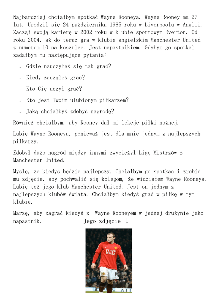 Najbardziej chciałbym spotkać Wayne Rooneya. Wayne Rooney ma 27 lat. Urodził się 24 października 1985 roku w Liverpoolu w Anglii. Zaczął swoją karierę w 2002 roku w klubie sportowym Everton. Od roku 2004, aż do teraz gra w klubie angielskim Manchester United z numerem 10 na koszulce. Jest napastnikiem. Gdybym go spotkał zadałbym mu następujące pytania: Gdzie nauczyłeś się tak grać? Kiedy zacząłeś grać? Kto Cię uczył grać? Kto jest Twoim ulubionym piłkarzem? Jaką chciałbyś zdobyć nagrodę? Również chciałbym, aby Rooney dał mi lekcje piłki nożnej. Lubię Wayne Rooneya, ponieważ jest dla mnie jednym z najlepszych piłkarzy. Zdobył dużo nagród między innymi zwyciężył Ligę Mistrzów z Manchester United. Myślę, że kiedyś będzie najlepszy. Chciałbym go spotkać i zrobić mu zdjęcie, aby pochwalić się kolegom, że widziałem Wayne Rooneya. Lubię też jego klub Manchester United. Jest on jednym z najlepszych klubów świata. Chciałbym kiedyś grać w piłkę w tym klubie. Marzę, aby zagrać kiedyś z Wayne Rooneyem w jednej drużynie jako napastnik. Jego zdjęcie ↓