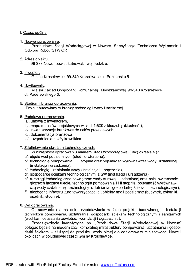 I. Część ogólna 1. Nazwa opracowania. Przebudowa Stacji Wodociągowej w Nowem. Specyfikacja Techniczna Wykonania i Odbioru Robót (STWiOR). 2. Adres obiektu. 99-333 Nowe. powiat kutnowski, woj. łódzkie. 3. Inwestor. Gmina Krośniewice. 99-340 Krośniewice ul. Poznańska 5. 4. Użytkownik. Miejski Zakład Gospodarki Komunalnej i Mieszkaniowej. 99-340 Kro śniewice ul. Paderewskiego 3. 5. Stadium i branża opracowania. Projekt budowlany w branży technologii wody i sanitarnej. 6. Podstawa opracowania. a/. umowa z Inwestorem, b/. mapa do celów projektowych w skali 1:500 z klauzul ą aktualności, c/. inwentaryzacje branżowe do celów projektowych, d/. dokumentacja branżowa, e/. uzgodnienia z Użytkownikiem. 7. Zdefiniowanie określeń technologicznych. W niniejszym opracowaniu mianem Stacji Wodociągowej (SW) określa się: a/. ujęcie wód podziemnych (studnie wiercone), b/. technologię pompowania I i II stopnia oraz pojemność wyrównawczą wody uzdatnionej (instalacja i urządzenia), c/. technologię uzdatniania wody (instalacja i urządzenia), d/. gospodarkę ściekami technologicznymi z SW (instalacja i urządzenia), e/. rurociągi technologiczne zewnętrzne wody surowej i uzdatnionej oraz ścieków technologicznych łączące ujęcie, technologię pompowania I i II stopnia, pojemność wyrównawczą wody uzdatnionej, technologię uzdatniania i gospodarkę ściekami technologicznymi, f/. niezbędną infrastrukturę towarzyszącą jak obiekty nad i podziemne (budynek, zbiorniki, osadnik, studnie). 8. Cel opracowania. Opracowanie ma na celu przedstawienie w fazie projektu budowlanego instalacji technologii pompowania, uzdatniania, gospodarki ściekami technologicznymi i sanitarnych (wod-kan, osuszania powietrza, wentylacji i ogrzewania). Przedsięwzięcie inwestycyjne pn. „Przebudowa Stacji Wodociągowej w Nowem” polegać będzie na modernizacji kompletnej infrastruktury pompowania, uzdatniania i gospodarki ściekami – służącej do produkcji wody pitnej dla odbiorców w miejscowości Nowe i okolicach w południowej części Gminy Krośniewice. PDF created with FinePrint pdfFactory Pro trial version www.pdffactory.com 2 Celem przedsięwzięcia inwestycyjnego jest poprawa stanu zastanego zaopatrzenia w wodę oraz rozwiązanie kompleksowe zaopatrzenia w perspektywie. 9. Zakres rzeczowy opracowania. W zakresie instalacji wewnętrznych opracowanie obejmuje: a/. instalacje technologii uzdatniania (wodne i sprężonego powietrza), b/. instalacje technologii pompownia II stopnia, c/. instalacje pompowania płucznego, d/. instalacje pompowania II stopnia, e/. instalacje wod-kan, osuszania powietrza, wentylacji i ogrzewania. Ww. instalacje mieścić się będą w budynku SW. W zakresie obiektów i rurociągów technologicznych zewnętrznych opracowanie obejmuje: a/. zbiornik wyrównawczy wody uzdatnionej, b/. rurociągi technologiczne zewnętrzne wody surowej, c/. rurociągi technologiczne zewnętrzne wody uzdatnionej, d/. rurociągi technologiczne zewnętrzne ścieków z płukania filtrów, wód spustowych i przelewowych ze zbiornika wyrównawczego oraz sanitarnych. II. Część szczegółowa 1. Zakres rzeczowy robót projektowanych 1.1. Zakres rzeczowy robót inwestycyjnych W zakresie robót montażowych technologii pompowania zaprojektowano: a/. instalację pompowania I stopnia wody surowej, b/. instalacje pompownia II stopnia wody uzdatnionej, c/. instalację pompowania płucznego wody, d/. instalację pompowania płucznego sprężonego powietrza, e/. instalację pompowania sprężonego powietrza do napowietrzania i pneumatyki, f/. instalację pompowania ścieków po osadniku na ścieki technologiczne z płukania filtrów. W zakresie robót montażowych technologii uzdatniania zaprojektowano: a/. instalację uzdatniania dwustopniowego metodą filtracji ciśnieniowej, b/. instalację w osadniku na ścieki technologiczne z płukania filtrów, c/. instalację kanalizacji technologicznej, d/. instalację sprężonego powietrza, e/. Instalację dozowania NaOCl. W zakresie robót montażowych instalacji sanitarnych zaprojektowano: a/. instalację osuszania powietrza, b/. instalację kanalizacji technologicznej, c/. instalację wentylacji mechanicznej i grawitacyjnej, d/. instalację co elektryczną. W zakresie robót montażowych rurociągów zewnętrznych zaprojektowano: a/. rurociągi wody surowej Dz160, b/. rurociąg wody uzdatnionej Dz225 i 250, c/. rurociąg kanalizacji technologicznej Dz225, PDF created with FinePrint pdfFactory Pro trial version www.pdffactory.com 3 d/. rurociąg kanalizacji sanitarnej Dz160, e/. rurociąg spustu i przelewu Dz225. 2. Ogólne wytyczne wykonawstwa i odbioru robót. Całość robót objęta dokumentacją techniczną z wyjątkiem części robót montażowych związanych z technologią SUW - z punktu widzenia należytego tzn. zgodnego ze sztuką budowlaną wykonawstwa i odbioru – w sposób wyczerpujący normowana jest pod ww. względem w Warunkach Technicznych Wykonania i Odbioru Robót Budowlano-Monta żowych: a/. Tom I część 1-4 (roboty budowlane ogólne), b/. Tom II (instalacje sanitarne i przemysłowe), c/. Tom III (instalacje elektroenergetyczne) - oraz instrukcjach montażowych, wykonania i odbioru przypisanych do poszczególnych urządzeń, przewodów lub armatur. Dokumentacje branżowe w częściach opisowych powołują się na ww. Wytyczne w trybie ich obligatoryjnego obowiązywania. W niniejszym opracowaniu nie cytuje się ww. bazy informacyjnej podkreślając, że jest ona obowiązująca dla wykonawstwa i nadzoru technicznego w odniesieniu do każdego elementu robót objętych dokumentacją techniczną wielobranżową i technologią wykonawstwa wynikającą z dokumentacji kosztorysowej. 3. Szczegółowe wytyczne wykonawstwa. Szczegółowe wytyczne wykonawstwa zawarte są w dokumentacji technicznej, gdzie podano: a/. istotne z punktu widzenia wyniku końcowego zasady wykonania poszczególnych prac, b/. charakterystyki techniczno-t
