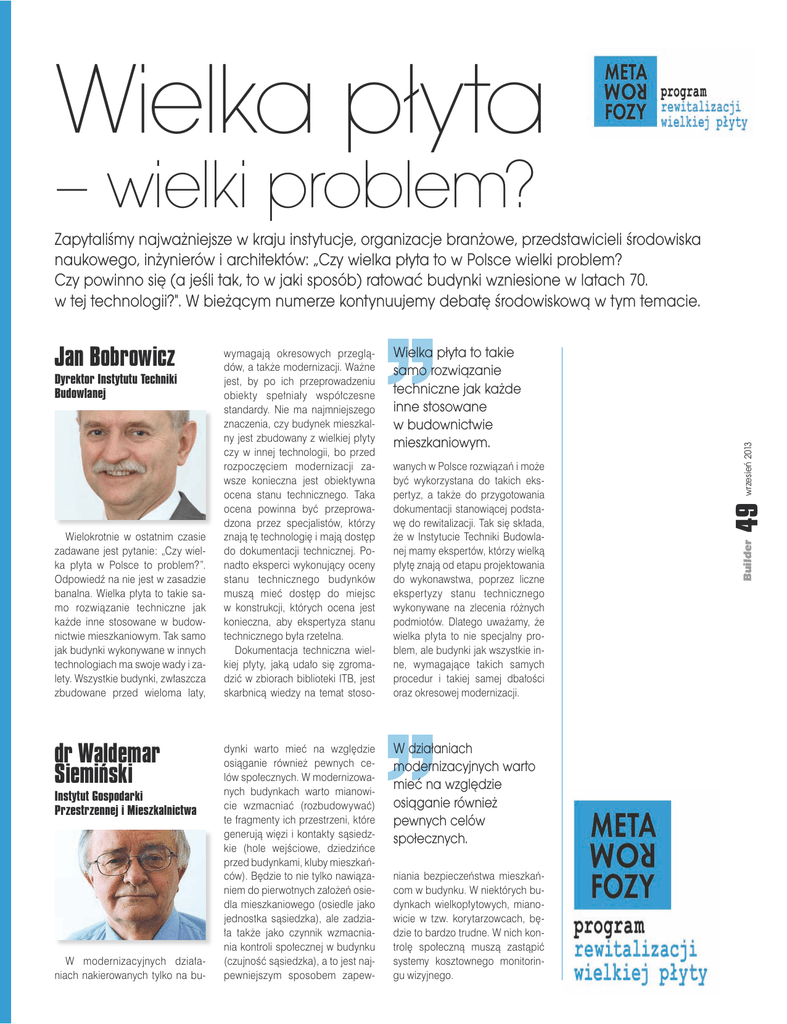 Wielka płyta – wielki problem? Wielokrotnie w ostatnim czasie zadawane jest pytanie: „Czy wielka płyta w Polsce to problem?”. Odpowiedź na nie jest w zasadzie banalna. Wielka płyta to takie samo rozwiązanie techniczne jak każde inne stosowane w budownictwie mieszkaniowym. Tak samo jak budynki wykonywane w innych technologiach ma swoje wady i zalety. Wszystkie budynki, zwłaszcza zbudowane przed wieloma laty, dr Waldemar Siemiński Instytut Gospodarki Przestrzennej i Mieszkalnictwa W modernizacyjnych działaniach nakierowanych tylko na bu- dynki warto mieć na względzie osiąganie również pewnych celów społecznych. W modernizowanych budynkach warto mianowicie wzmacniać (rozbudowywać) te fragmenty ich przestrzeni, które generują więzi i kontakty sąsiedzkie (hole wejściowe, dziedzińce przed budynkami, kluby mieszkańców). Będzie to nie tylko nawiązaniem do pierwotnych założeń osiedla mieszkaniowego (osiedle jako jednostka sąsiedzka), ale zadziała także jako czynnik wzmacniania kontroli społecznej w budynku (czujność sąsiedzka), a to jest najpewniejszym sposobem zapew- Wielka płyta to takie samo rozwiązanie techniczne jak każde inne stosowane w budownictwie mieszkaniowym. wanych w Polsce rozwiązań i może być wykorzystana do takich ekspertyz, a także do przygotowania dokumentacji stanowiącej podstawę do rewitalizacji. Tak się składa, że w Instytucie Techniki Budowlanej mamy ekspertów, którzy wielką płytę znają od etapu projektowania do wykonawstwa, poprzez liczne ekspertyzy stanu technicznego wykonywane na zlecenia różnych podmiotów. Dlatego uważamy, że wielka płyta to nie specjalny problem, ale budynki jak wszystkie inne, wymagające takich samych procedur i takiej samej dbałości oraz okresowej modernizacji. W działaniach modernizacyjnych warto mieć na względzie osiąganie również pewnych celów społecznych. niania bezpieczeństwa mieszkańcom w budynku. W niektórych budynkach wielkopłytowych, mianowicie w tzw. korytarzowcach, będzie to bardzo trudne. W nich kontrolę społeczną muszą zastąpić systemy kosztownego monitoringu wizyjnego. 49 Dyrektor Instytutu Techniki Budowlanej wymagają okresowych przeglądów, a także modernizacji. Ważne jest, by po ich przeprowadzeniu obiekty spełniały współczesne standardy. Nie ma najmniejszego znaczenia, czy budynek mieszkalny jest zbudowany z wielkiej płyty czy w innej technologii, bo przed rozpoczęciem modernizacji zawsze konieczna jest obiektywna ocena stanu technicznego. Taka ocena powinna być przeprowadzona przez specjalistów, którzy znają tę technologię i mają dostęp do dokumentacji technicznej. Ponadto eksperci wykonujący oceny stanu technicznego budynków muszą mieć dostęp do miejsc w konstrukcji, których ocena jest konieczna, aby ekspertyza stanu technicznego była rzetelna. Dokumentacja techniczna wielkiej płyty, jaką udało się zgromadzić w zbiorach biblioteki ITB, jest skarbnicą wiedzy na temat stoso- Builder Jan Bobrowicz wrzesień 2013 Zapytaliśmy najważniejsze w kraju instytucje, organizacje branżowe, przedstawicieli środowiska naukowego, inżynierów i architektów: „Czy wielka płyta to w Polsce wielki problem? Czy powinno się (a jeśli tak, to w jaki sposób) ratować budynki wzniesione w latach 70. w tej technologii?". W bieżącym numerze kontynuujemy debatę środowiskową w tym temacie.